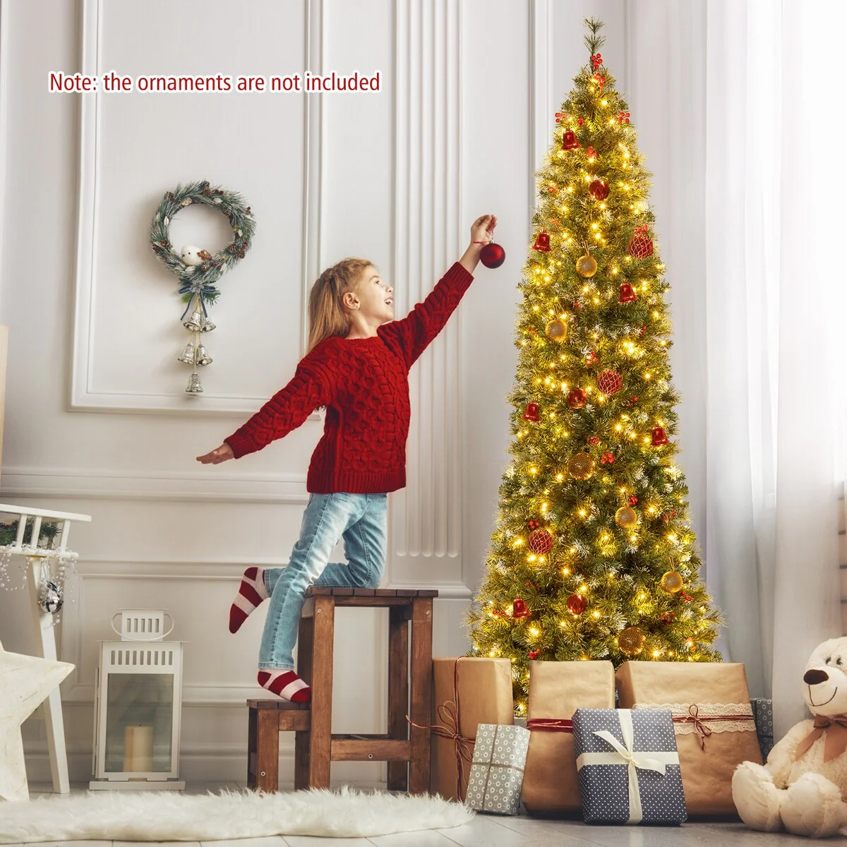 Our Slim Pencil Artificial Christmas Tree, available in heights 8 feet, combines elegance and practicality to bring a luxurious and lifelike festive touch to your space. Featuring a blend of snowy PVC leaves, glittering pine needles, and red berries, this pre-lit tree is a stunning holiday masterpiece.