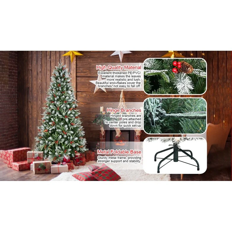 Create an unforgettable holiday experience with this 8ft Snow Flocked Artificial Christmas Tree. Featuring a full 8-foot height and 2850 mixed PE and PVC branch tips, this tree offers a dense, natural-looking appearance that will captivate your guests. The branches are sprayed with white to simulate snow, enhancing the festive atmosphere in your home. To make the tree even more festive, it comes decorated with 91 bunches of vibrant red fruits and 91 natural pinecones. These additions give the tree a refined, elegant look that suits any holiday setting. The hinged design allows for quick setup, and the foldable base makes storage easy when the season is over.