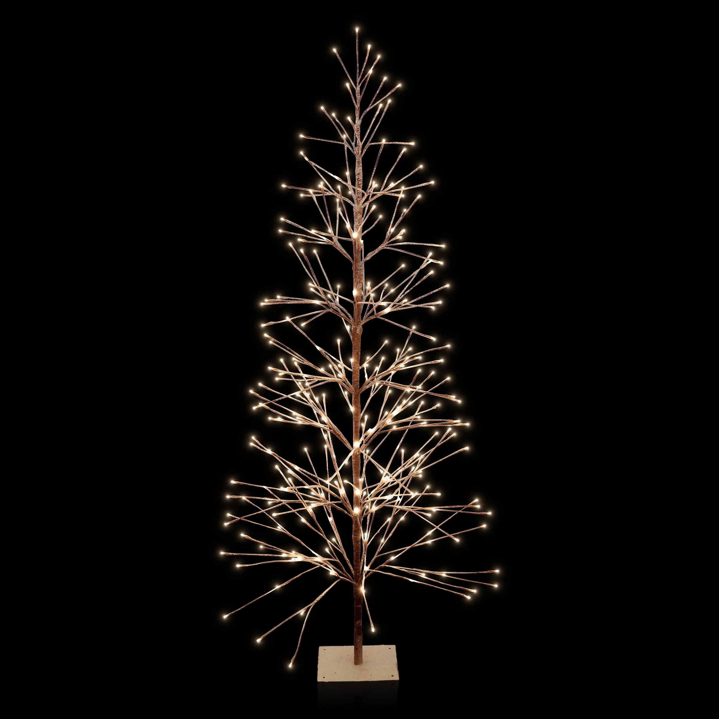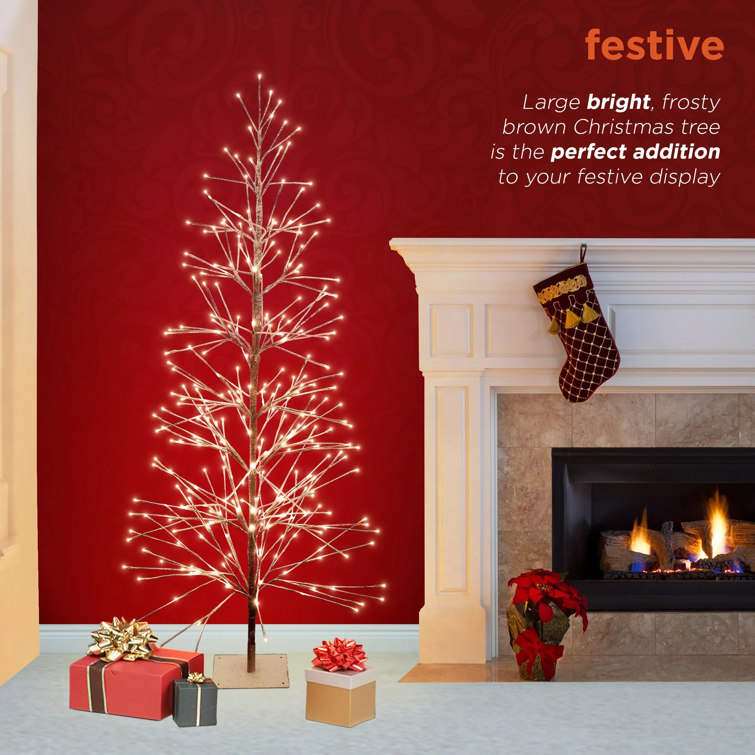 • Flocked brown Christmas tree with 296 warm white LED lights creates a festive atmosphere