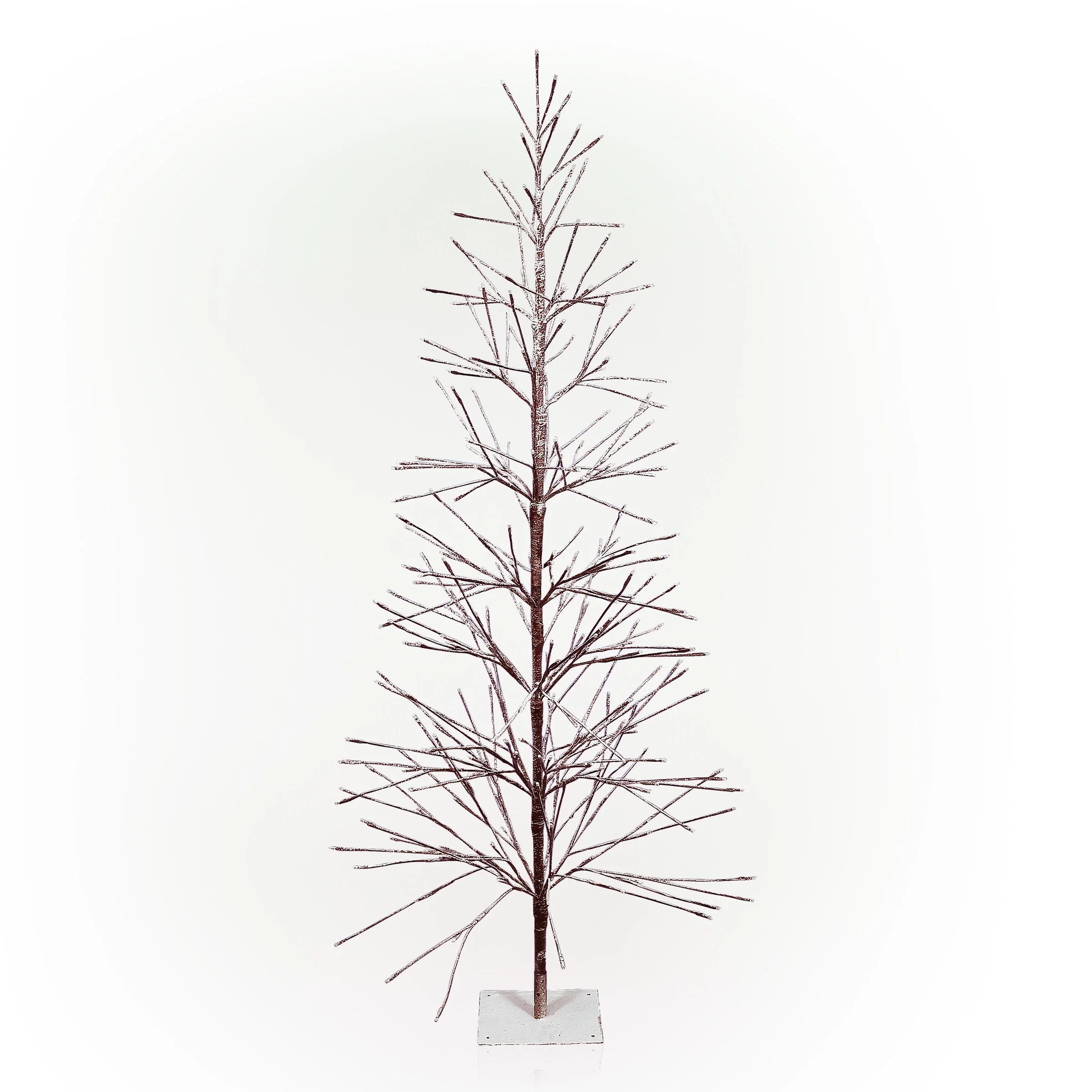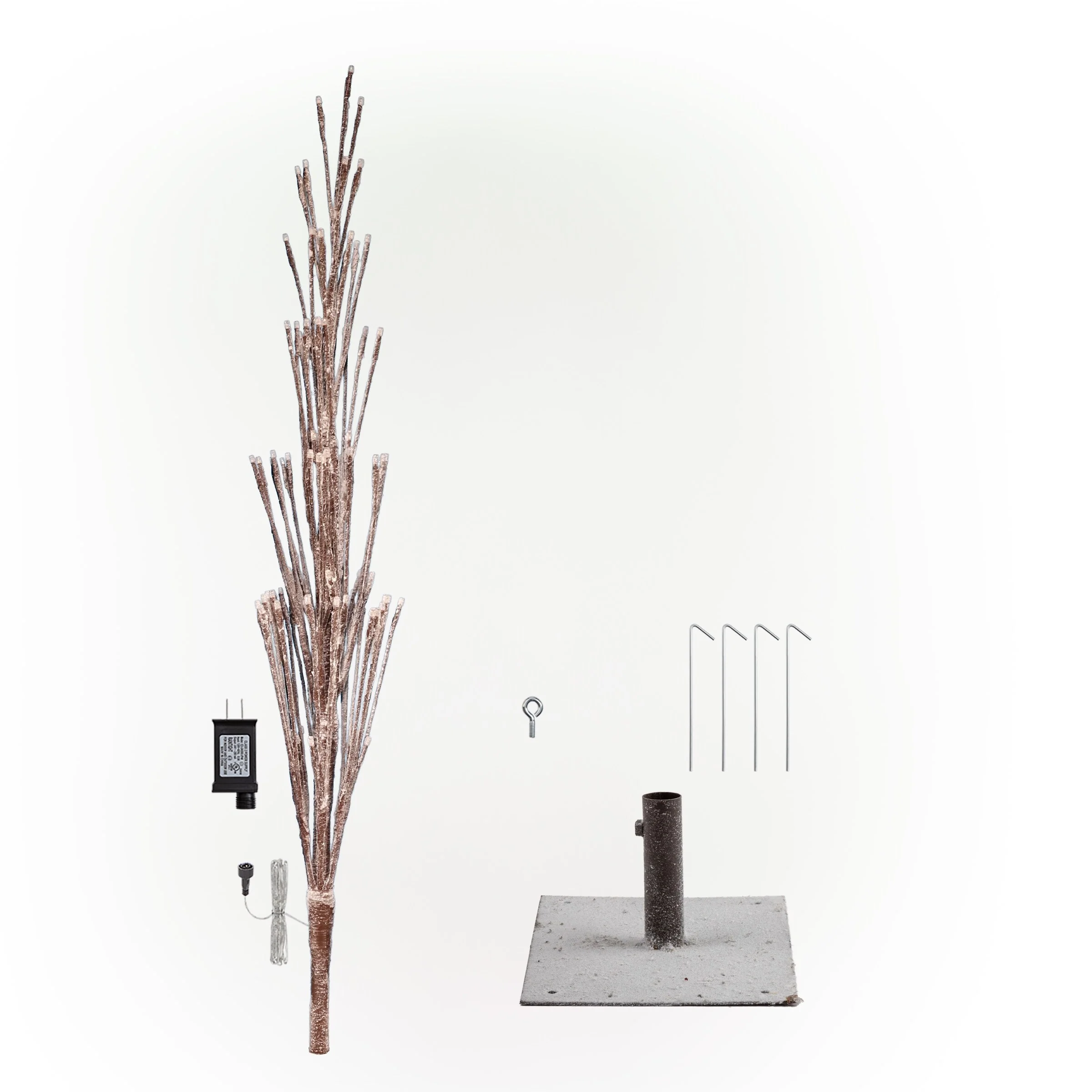 Bring the holiday spirit to your home with Alpine Corporation's 71"H Indoor/Outdoor Artificial Flocked Christmas Tree with White LED Lights in Brown. This beautiful, flocked brown tree is a great alternative to real trees, making it perfect for those who want a festive, decorative tree without the hassle of cleanup or purchasing a new tree every year. The artificial tree is easy to set up and comes with a floor base for indoor use or lawn stakes for outdoor display. Its 296 warm white LED lights ensure a merry atmosphere, creating the perfect addition to your Christmas decorations. The Alpine Corporation Frosty Flocked Brown Christmas Tree meets safety standards with its UL IP44 listed plug-in adapter, making it safe to use indoors or outdoors. Measuring 32"L x 32"W x 71"H, this tree is the perfect size for an impressive and versatile holiday display.