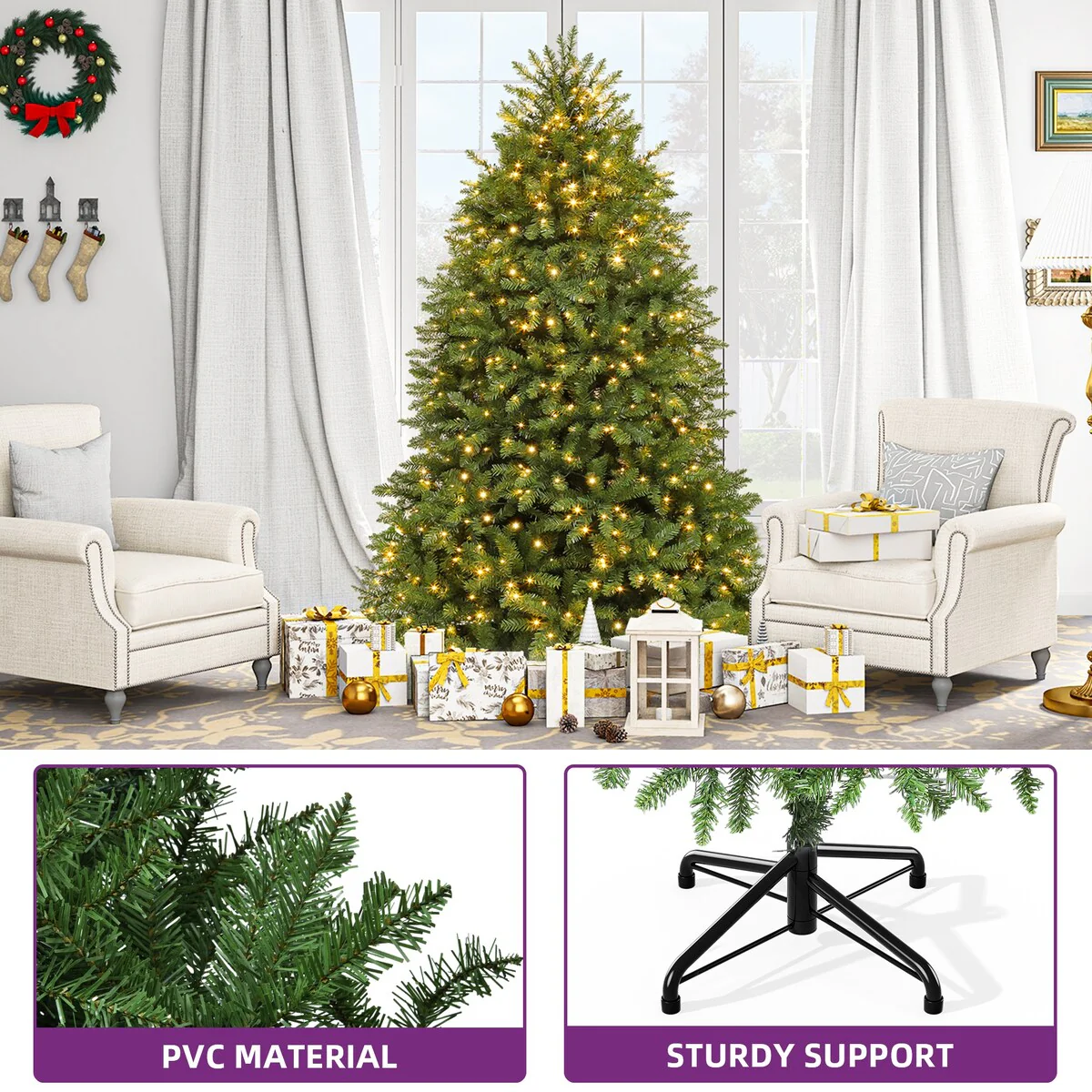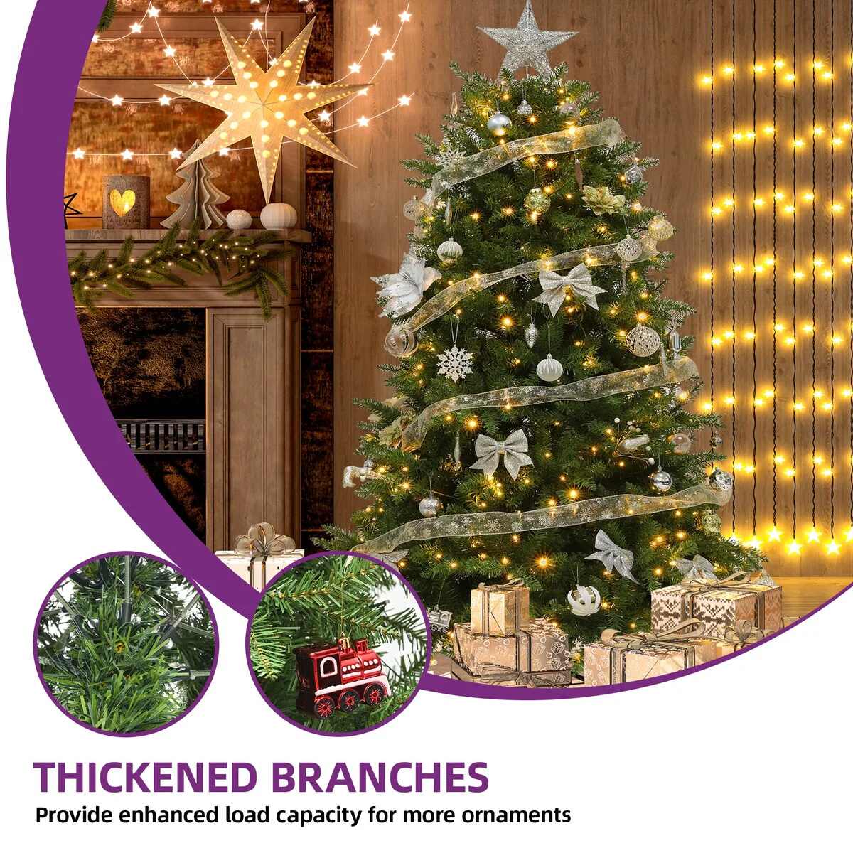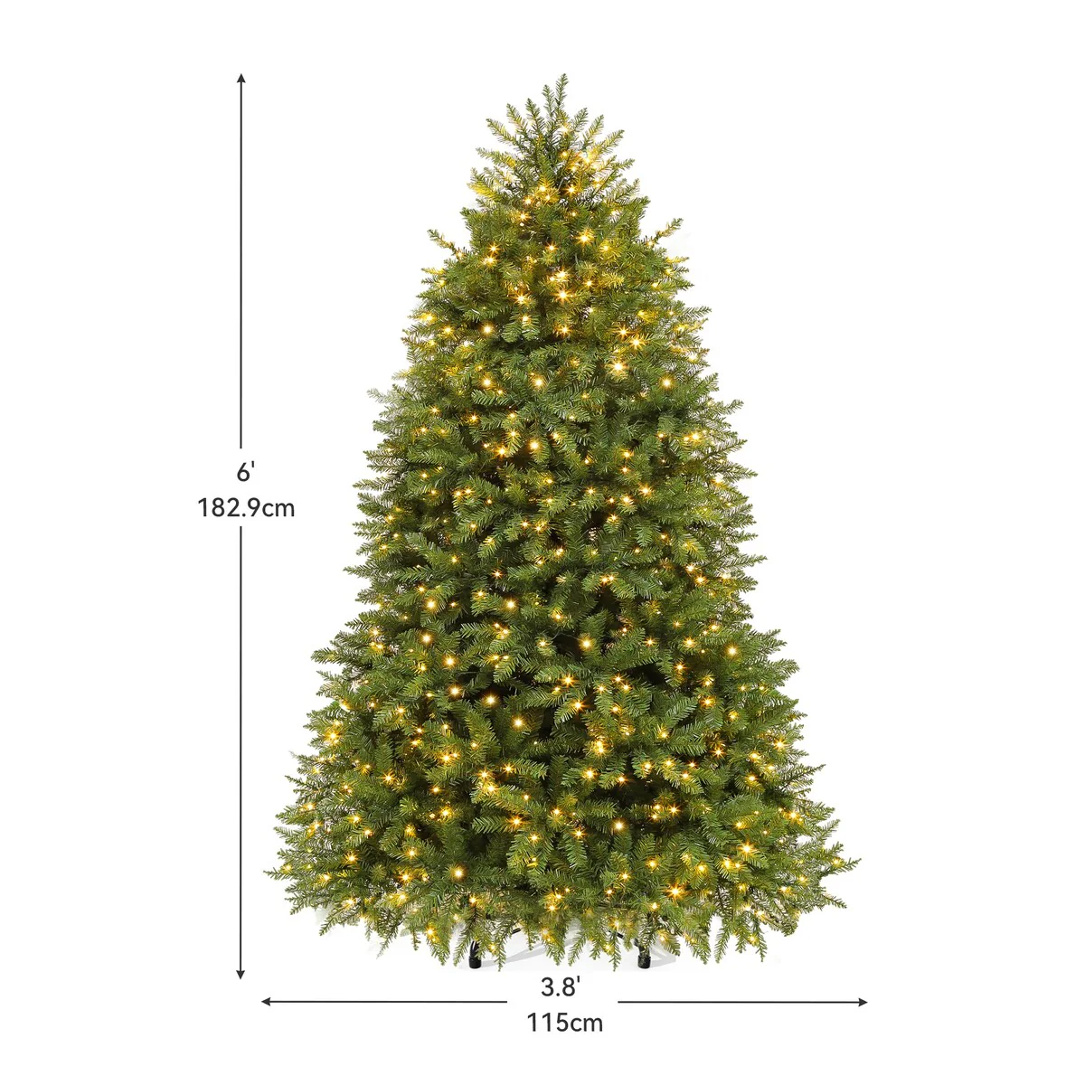 Experience the magic of the season with this 6ft bell-shaped Christmas Tree. Boasting 1838 tips and 450 pre-strung lights with 8 modes, it promises festive cheer and enchanting illumination. Easy to assemble with pre-connected branches and sturdy X-shaped base, it's designed for years of use. No extras, just ample space for your ornaments, making it perfect for homes, weddings, malls, and more. Embrace the festive spirit with this6ft christmas Tree. Uniquely bell-shaped, this artificial full Christmas tree is composed of 1838 tree tips, designed to fill your space with holiday cheer; Bend the branches to your liking for a robust, full-bodied centerpiece. Our pre-lit Christmas tree shines bright with 450 pre-strung lights, offering 8 enchanting modes; Easy setup and ample space for ornaments, you can control the change mode by touching the button, illuminating your holiday moments. Our Christmas tree features pre-connected hinged branches that fall into place during assembly, simply adjust the tips on the branches to fill noticeable gaps for a perfect look, allowing you to focus more on enjoying the holiday cheer. Built to last, our Christmas tree is equipped with a sturdy X-shaped iron base for stability; With robust branches and thickened leaves, it's strong enough to hold all your favorite ornaments, offering a customized look. Designed for years of use, our Christmas tree and its sturdy base can be easily folded for storage; Reusable and durable, it ensures your holiday cheer lasts season after season; Fit for homes, weddings, malls, more; No extras, ample ornament space.