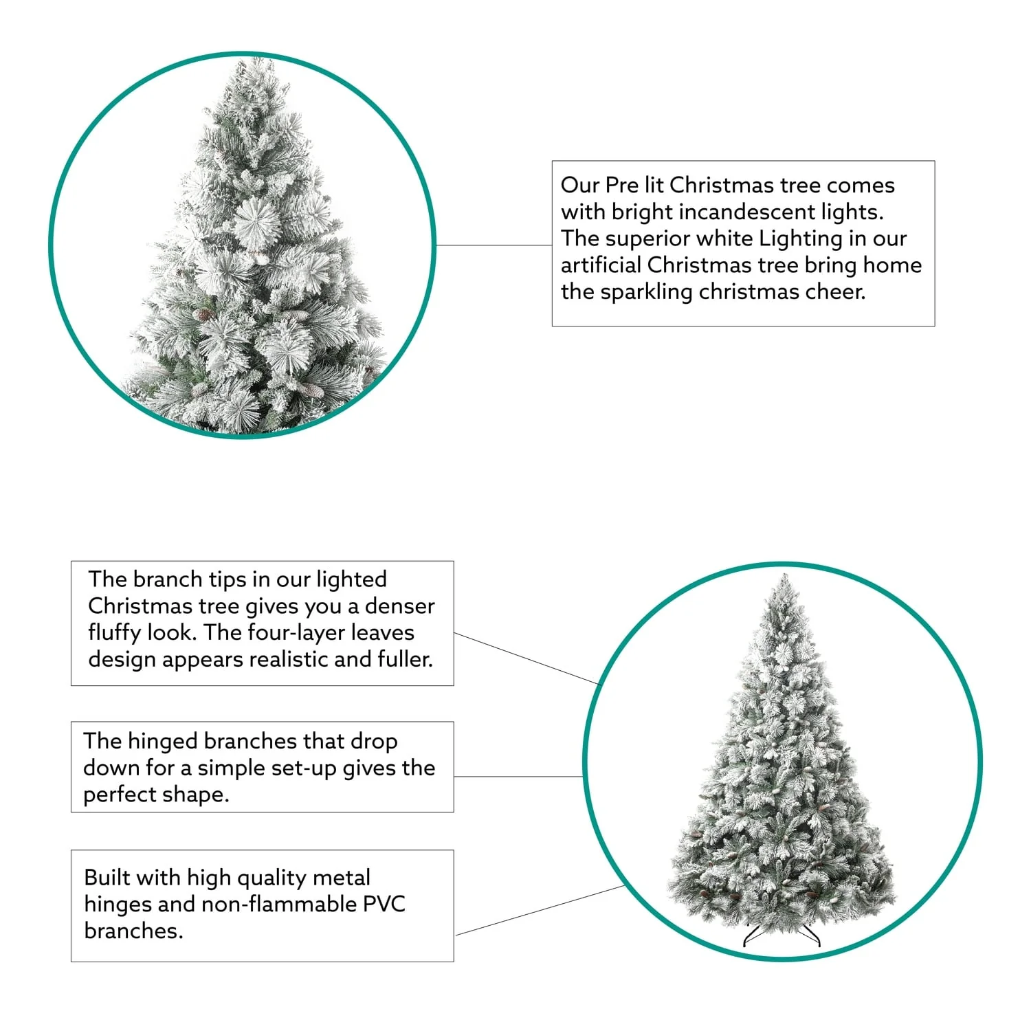 - COMES PRE-LIT: Our Pre lit Christmas tree comes with warm incandescent lights with foot pedal. The superior lighting in our white Christmas tree brings home the sparkling Christmas cheer. Complete your xmas decorations with our prelit christmas trees in your living room, balcony, hallway, office, gardens, etc.