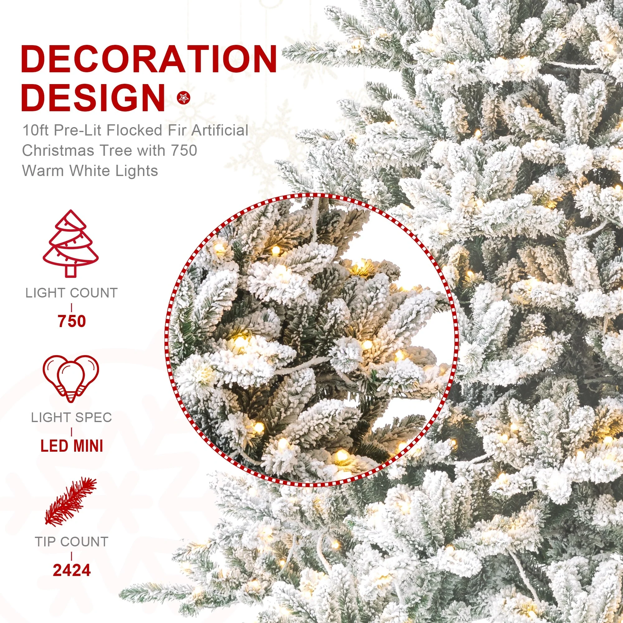 - Light count: 750 warm white LED light bulbs on the 10ft.