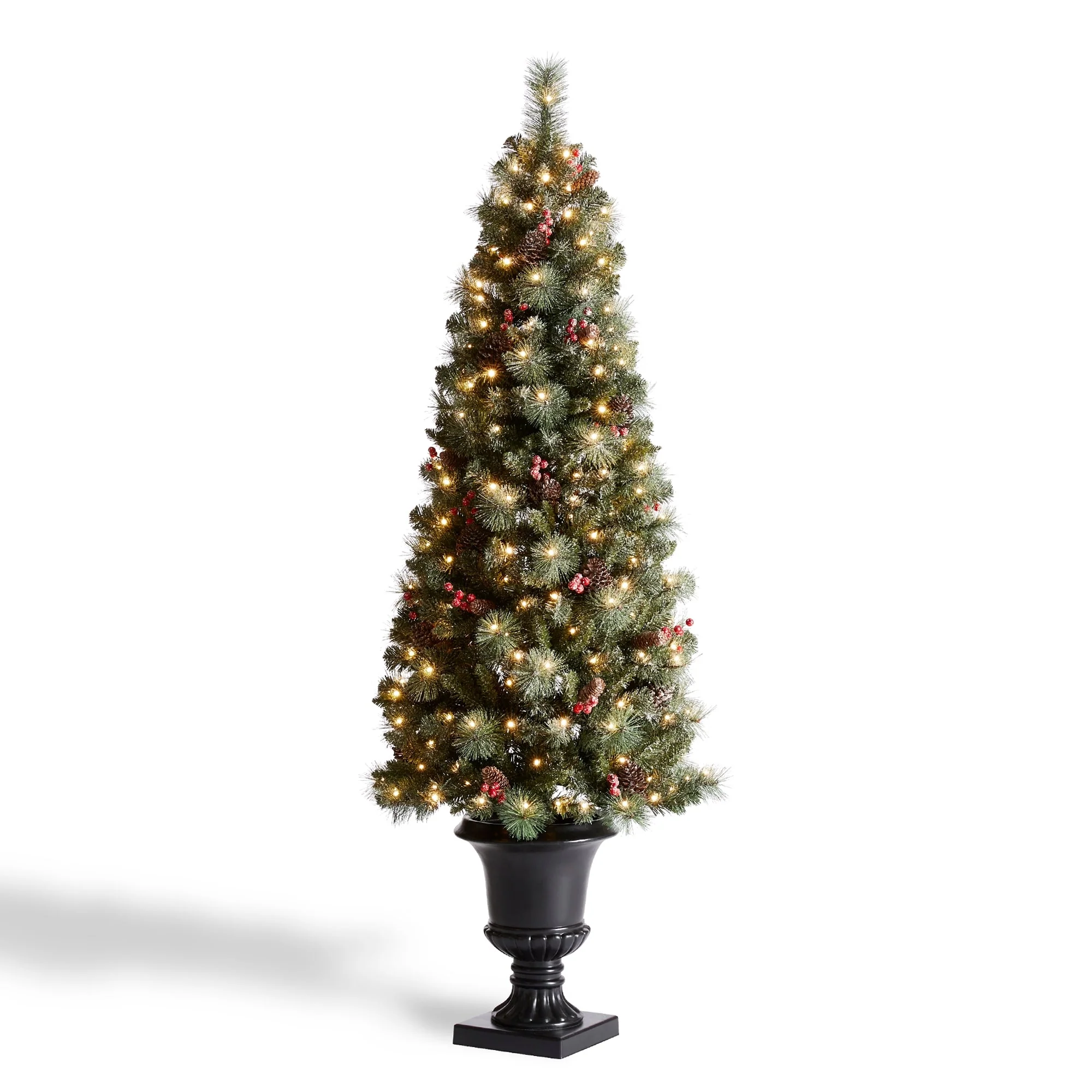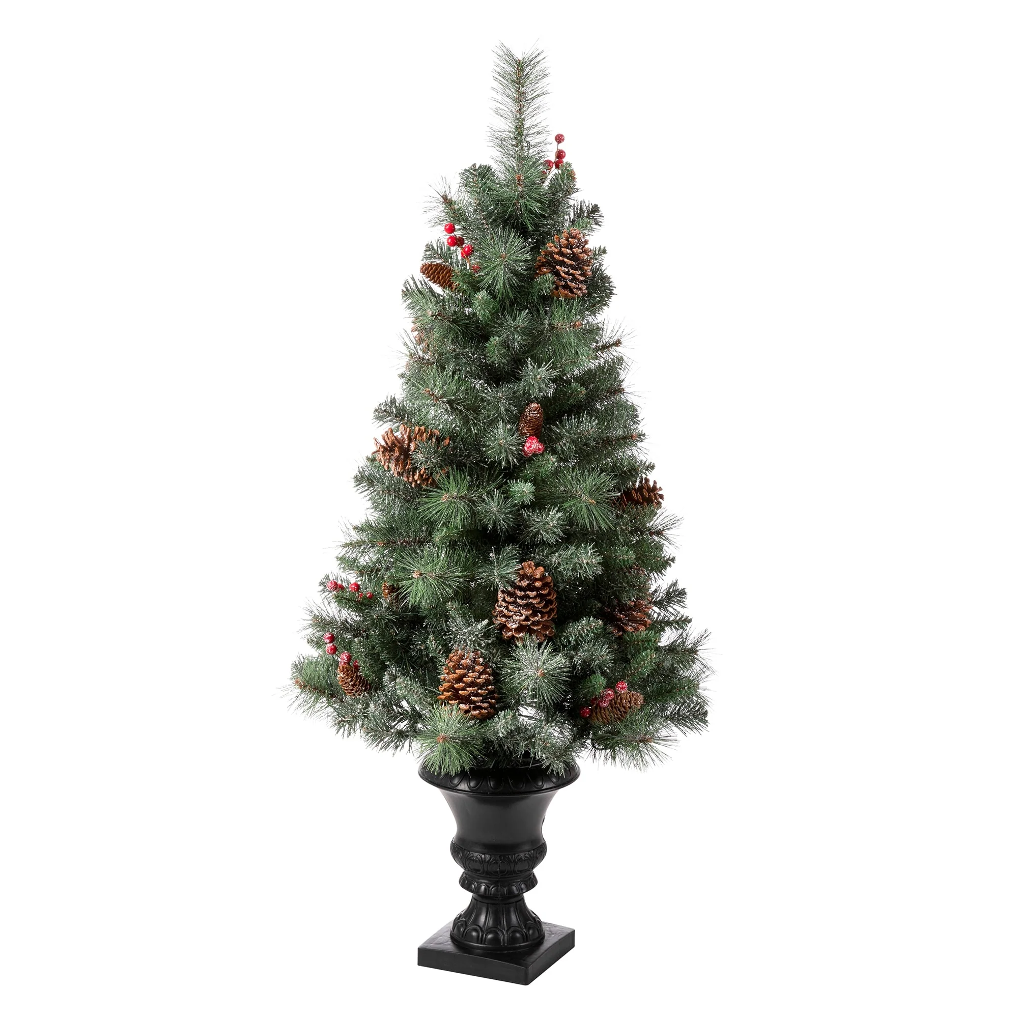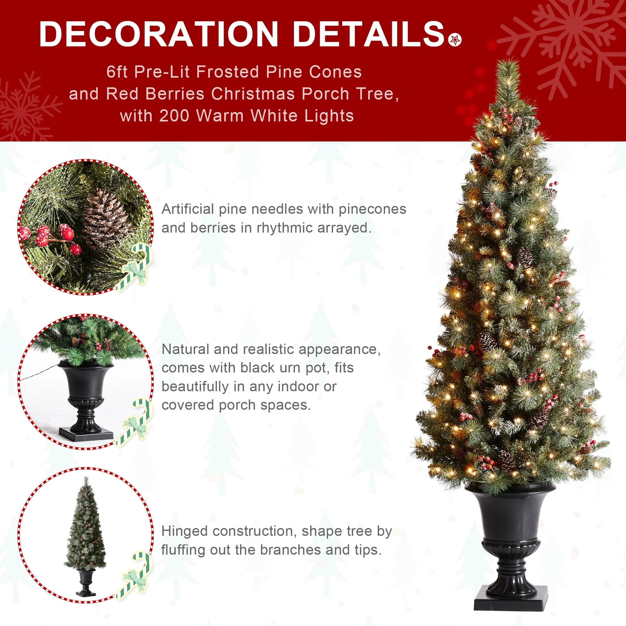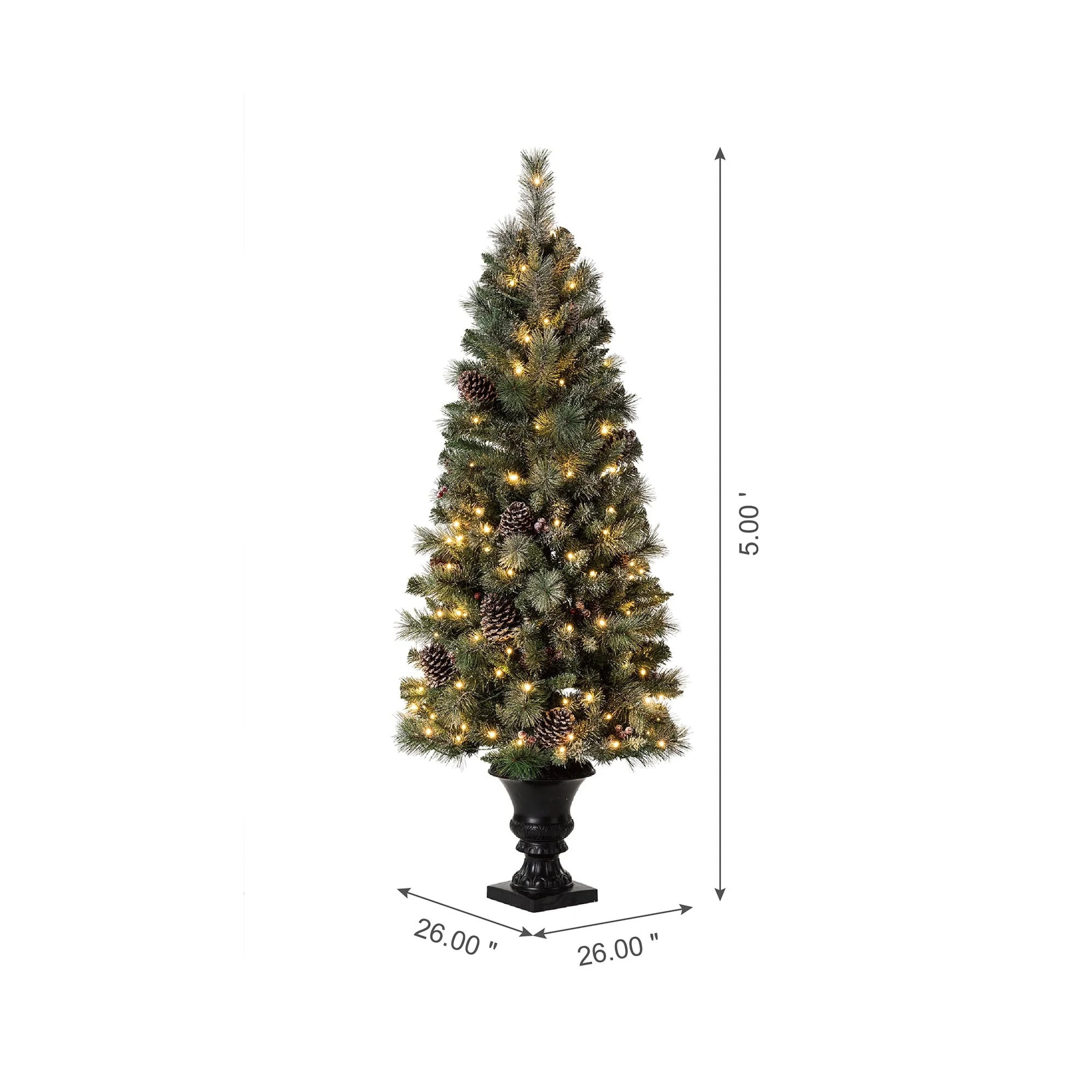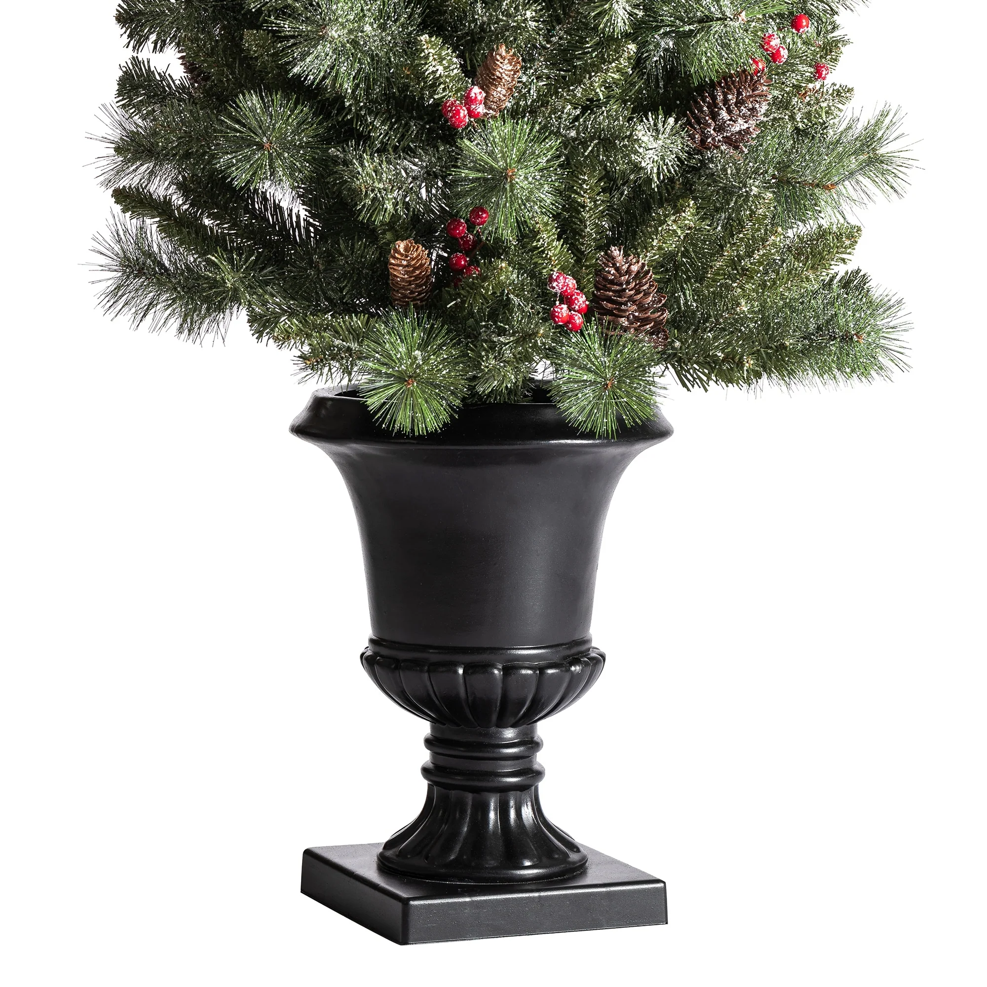 Add a touch of winter to your porch, deck, or entryway with this 4ft, 5ft or 6ft Pre-Lit Snow Flocked Artificial Potted Christmas Tree. With snow-sprinkled branches, red berries, and pine cones, this tree creates a unique wintry feel that will impress your guests during the Christmas holidays. The tree's natural and realistic appearance fits beautifully in any indoor or covered porch spaces, and it comes with a black urn pot. Adjust all the branches to achieve an elegant look like the images.