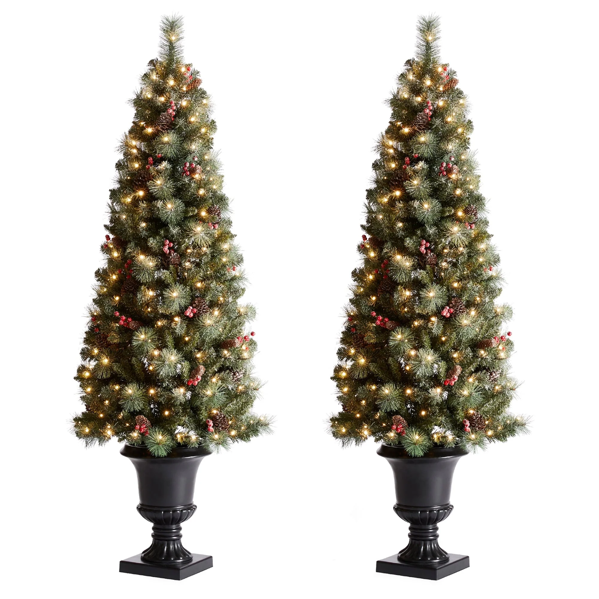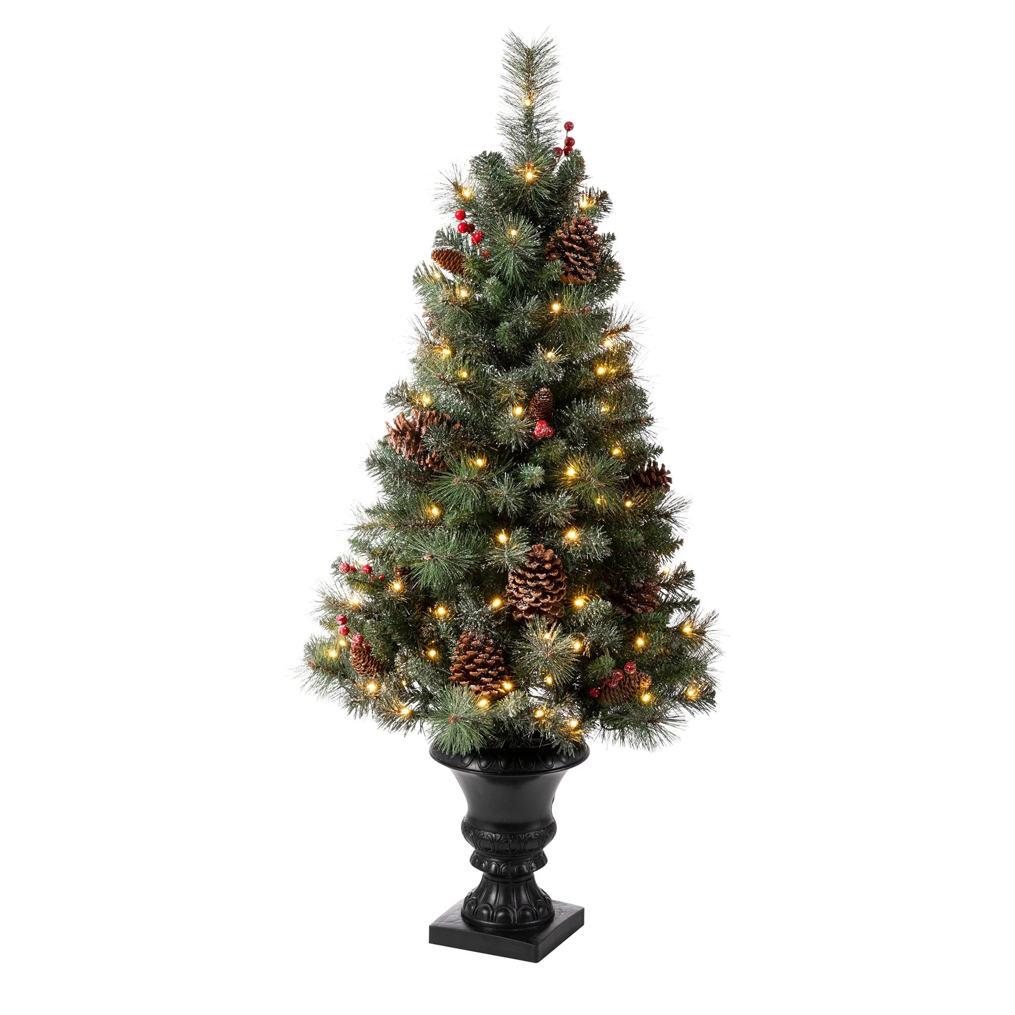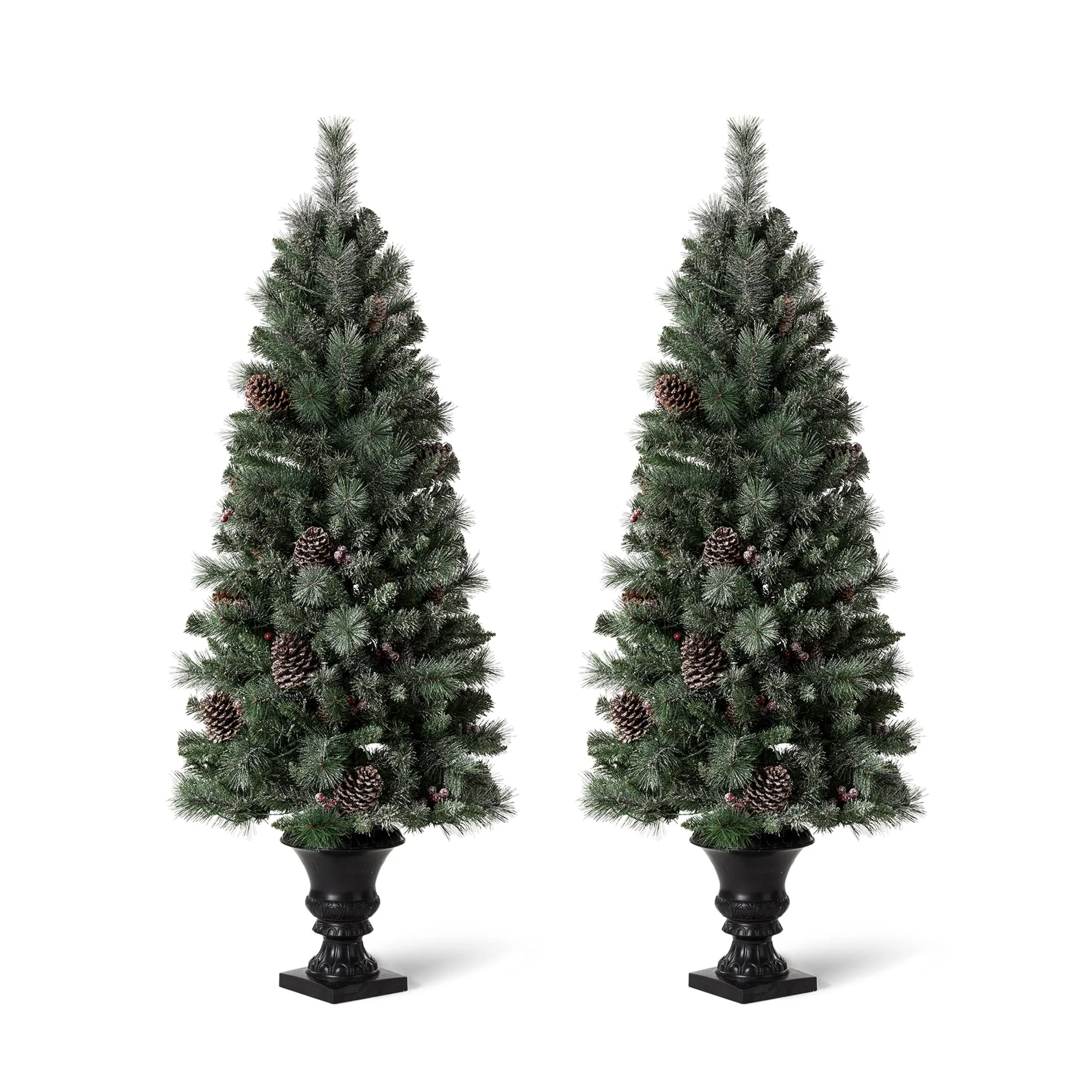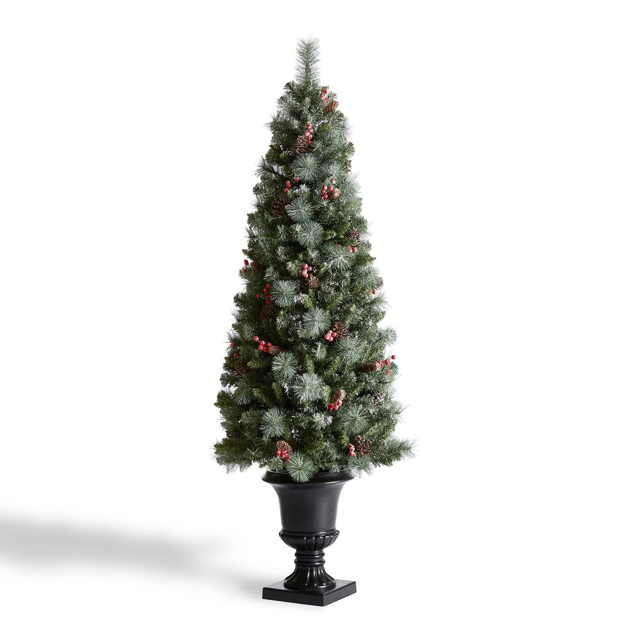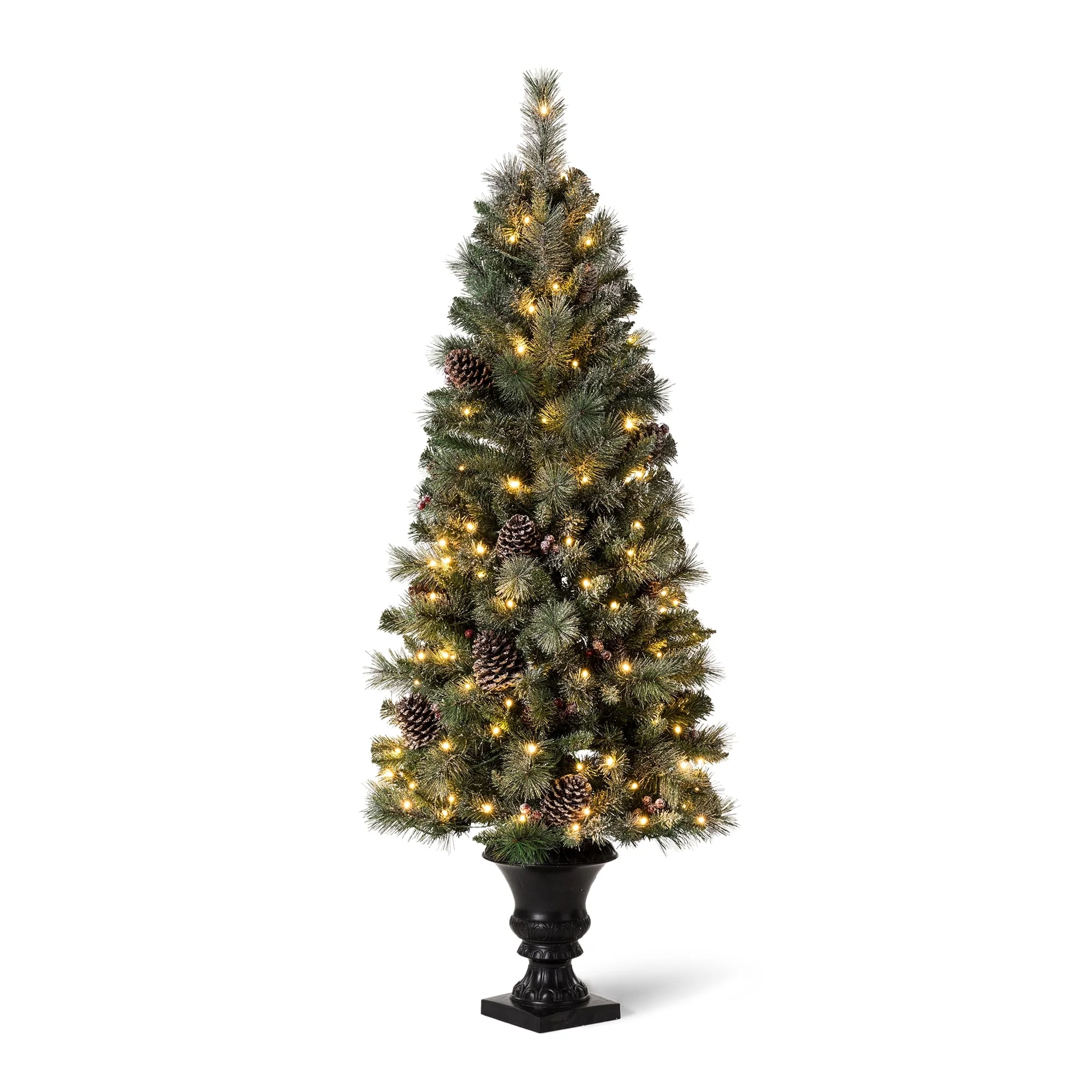 Add a touch of winter to your porch, deck, or entryway with this 4ft, 5ft or 6ft Pre-Lit Snow Flocked Artificial Potted Christmas Tree. With snow-sprinkled branches, red berries, and pine cones, this tree creates a unique wintry feel that will impress your guests during the Christmas holidays. The tree's natural and realistic appearance fits beautifully in any indoor or covered porch spaces, and it comes with a black urn pot. Adjust all the branches to achieve an elegant look like the images.