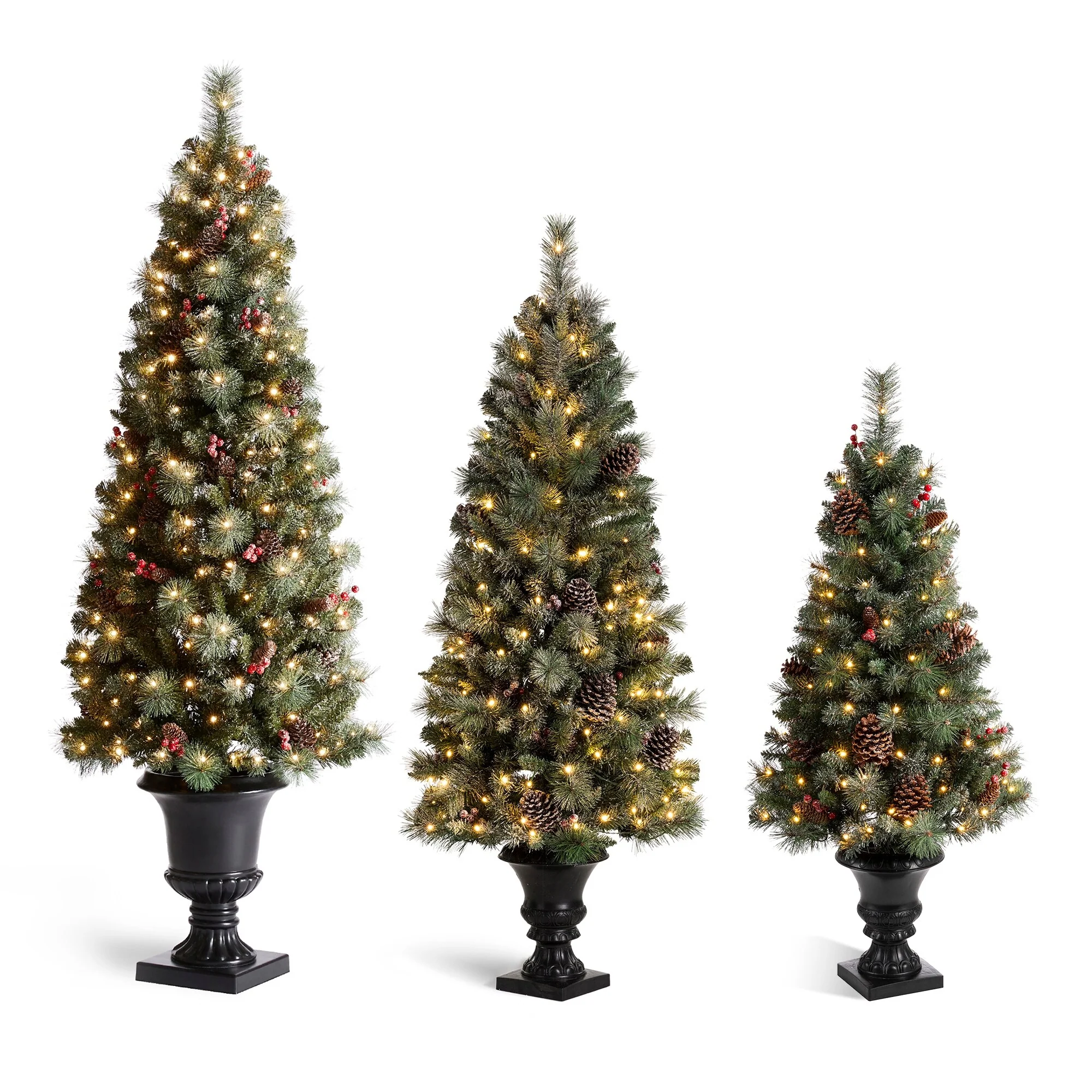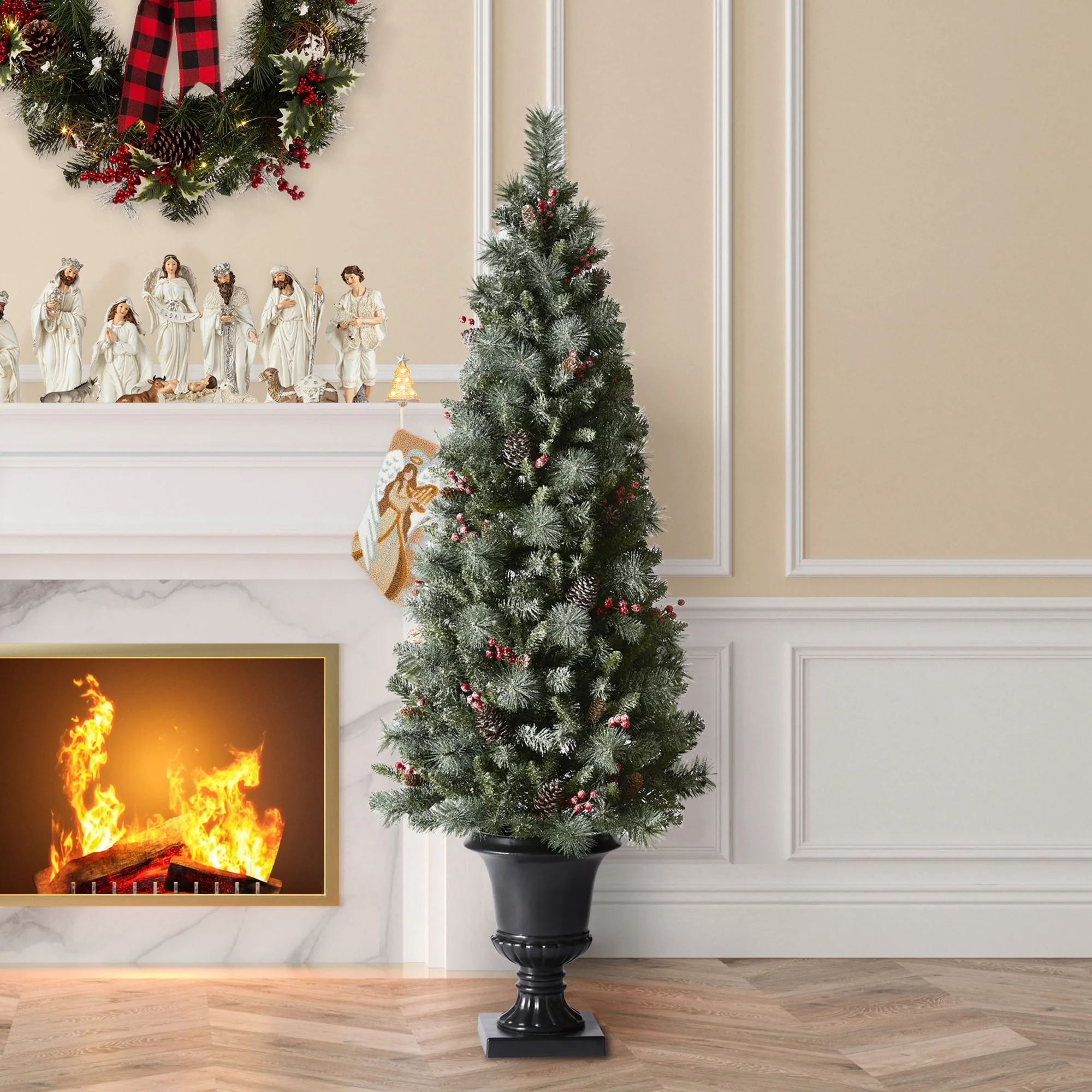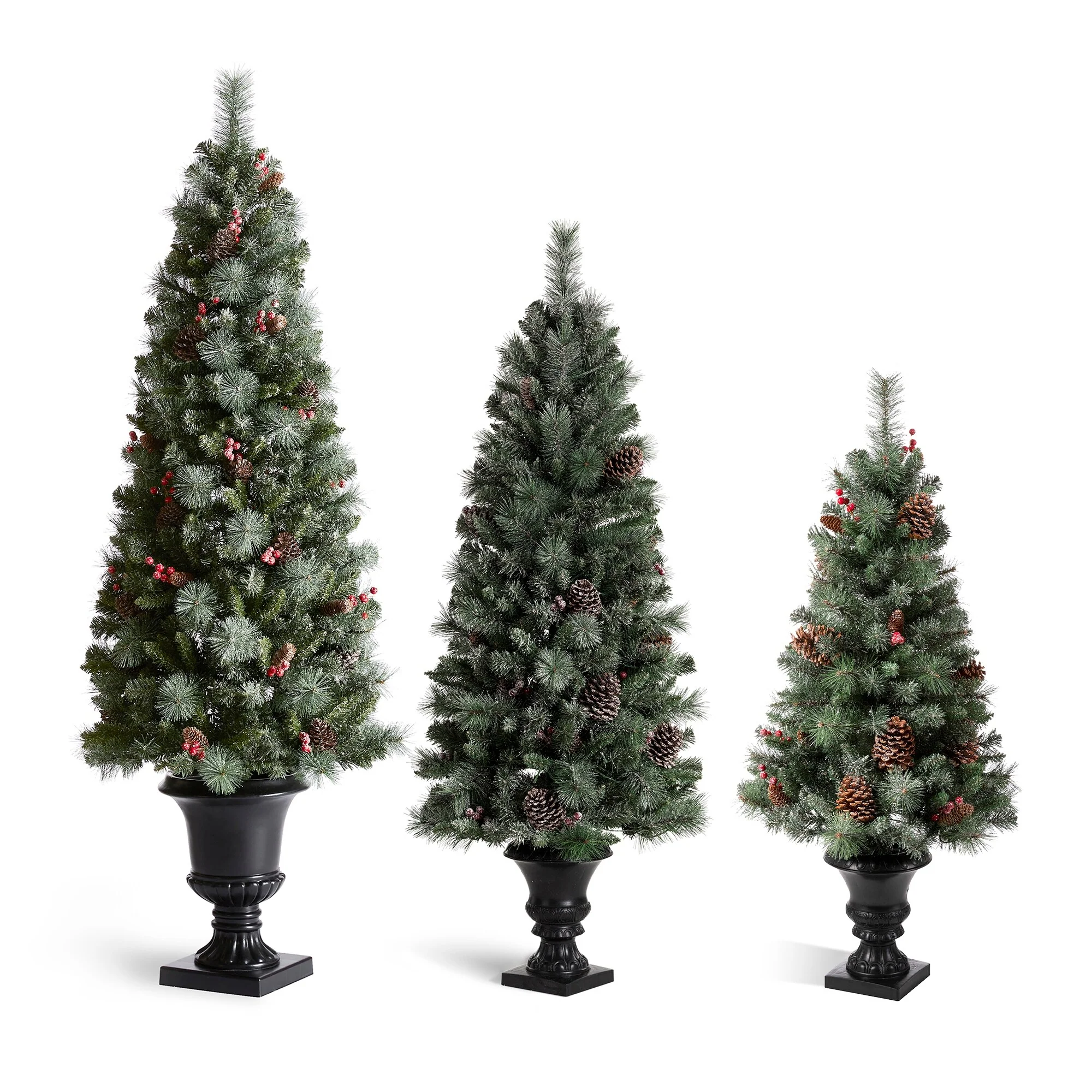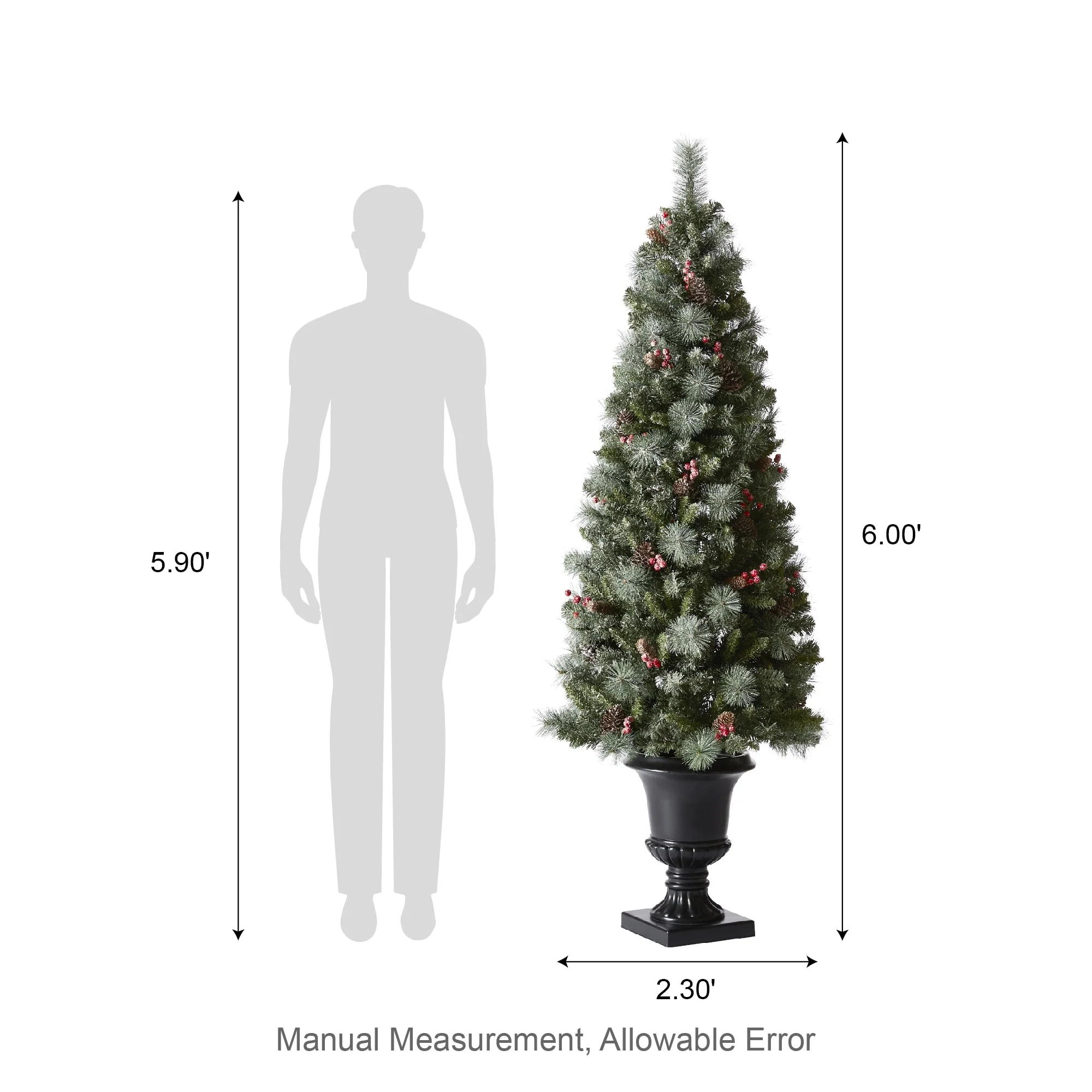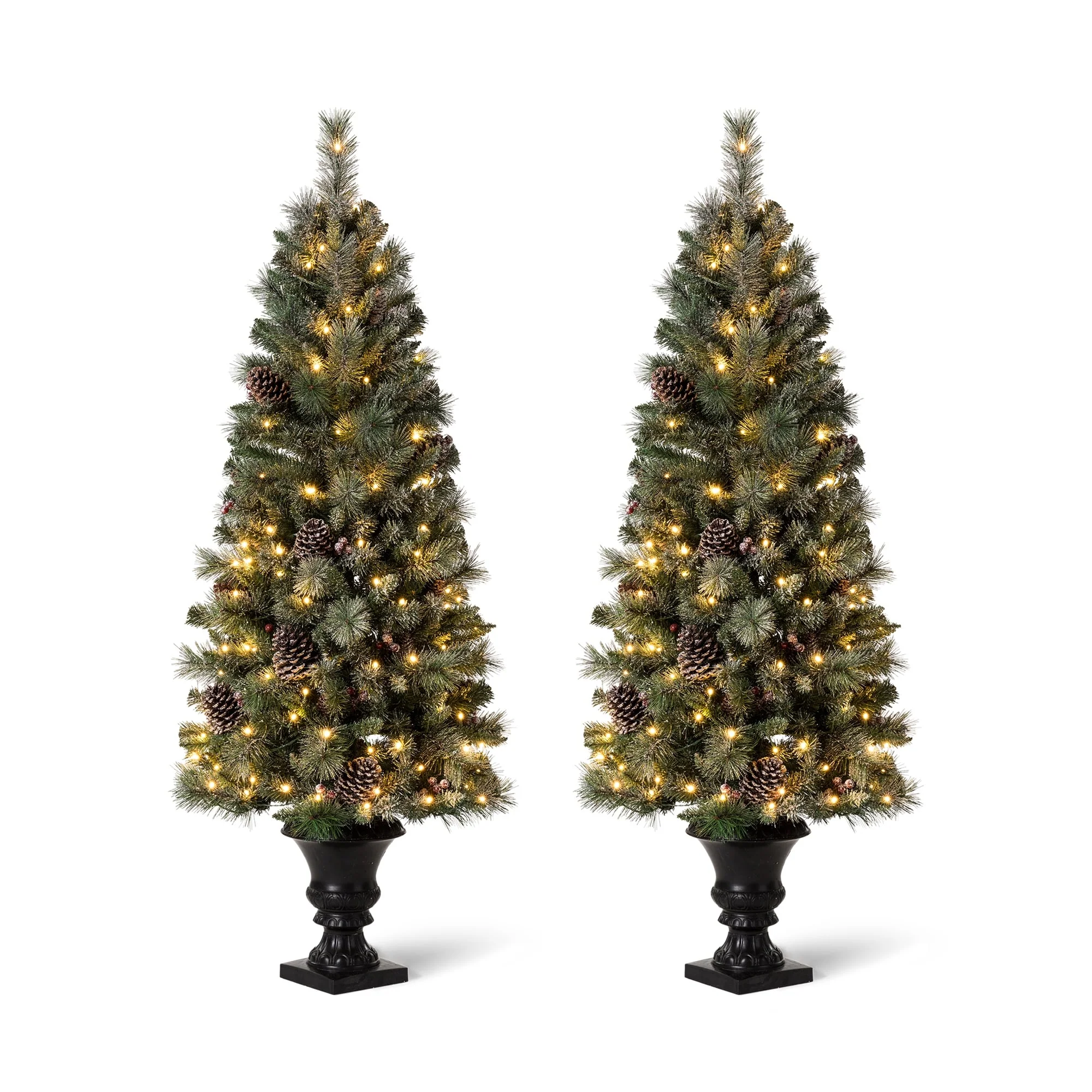 Add a touch of winter to your porch, deck, or entryway with this 4ft, 5ft or 6ft Pre-Lit Snow Flocked Artificial Potted Christmas Tree. With snow-sprinkled branches, red berries, and pine cones, this tree creates a unique wintry feel that will impress your guests during the Christmas holidays. The tree's natural and realistic appearance fits beautifully in any indoor or covered porch spaces, and it comes with a black urn pot. Adjust all the branches to achieve an elegant look like the images.
