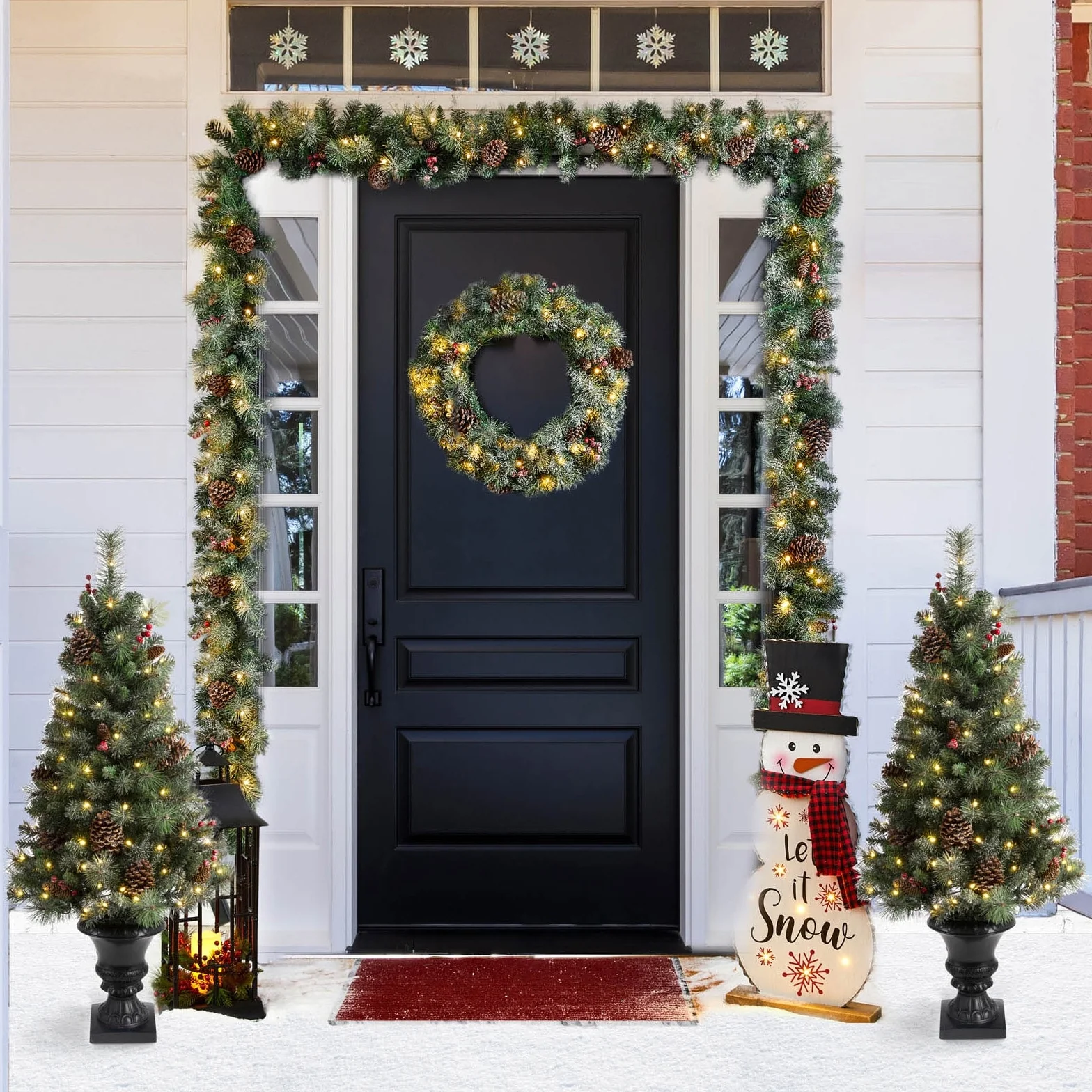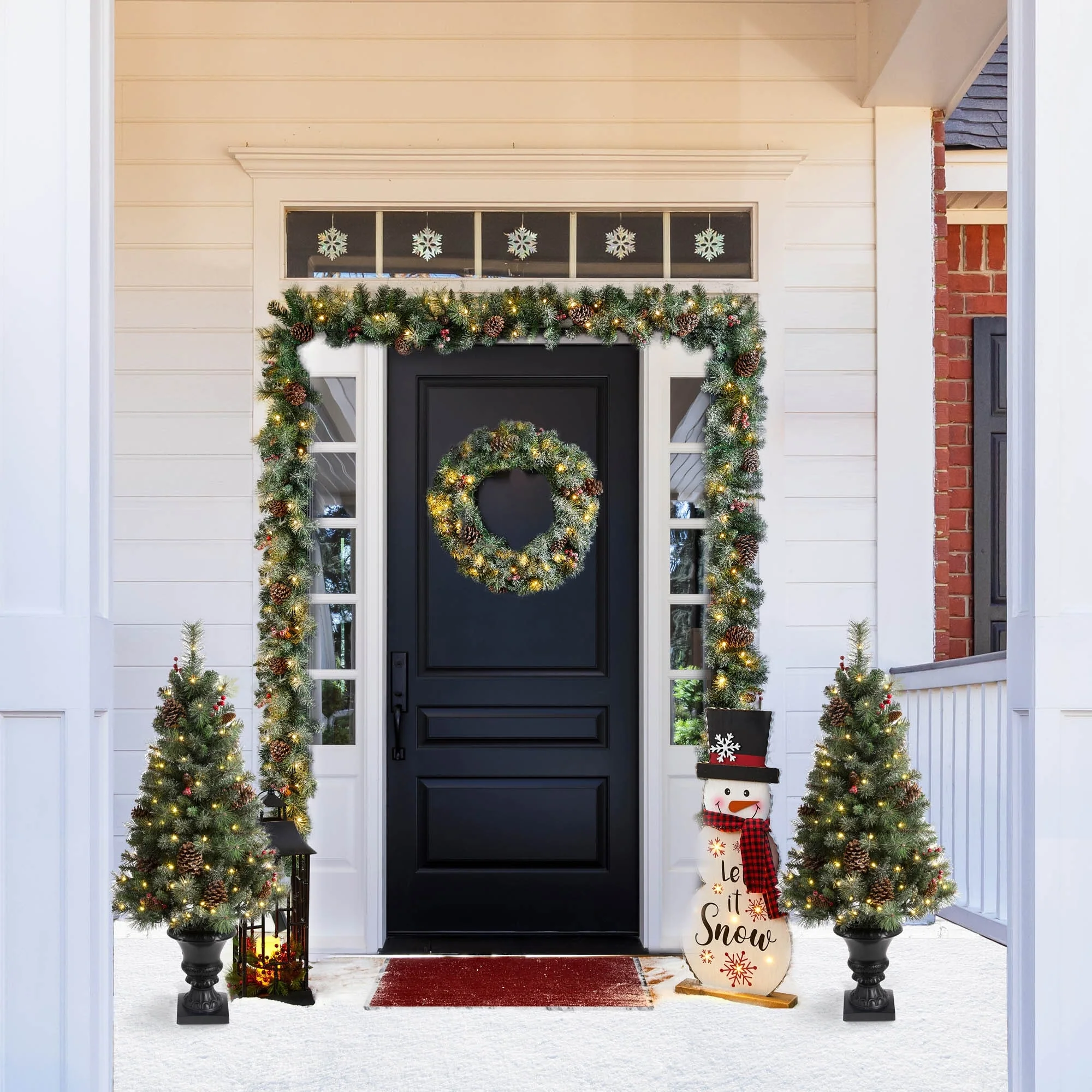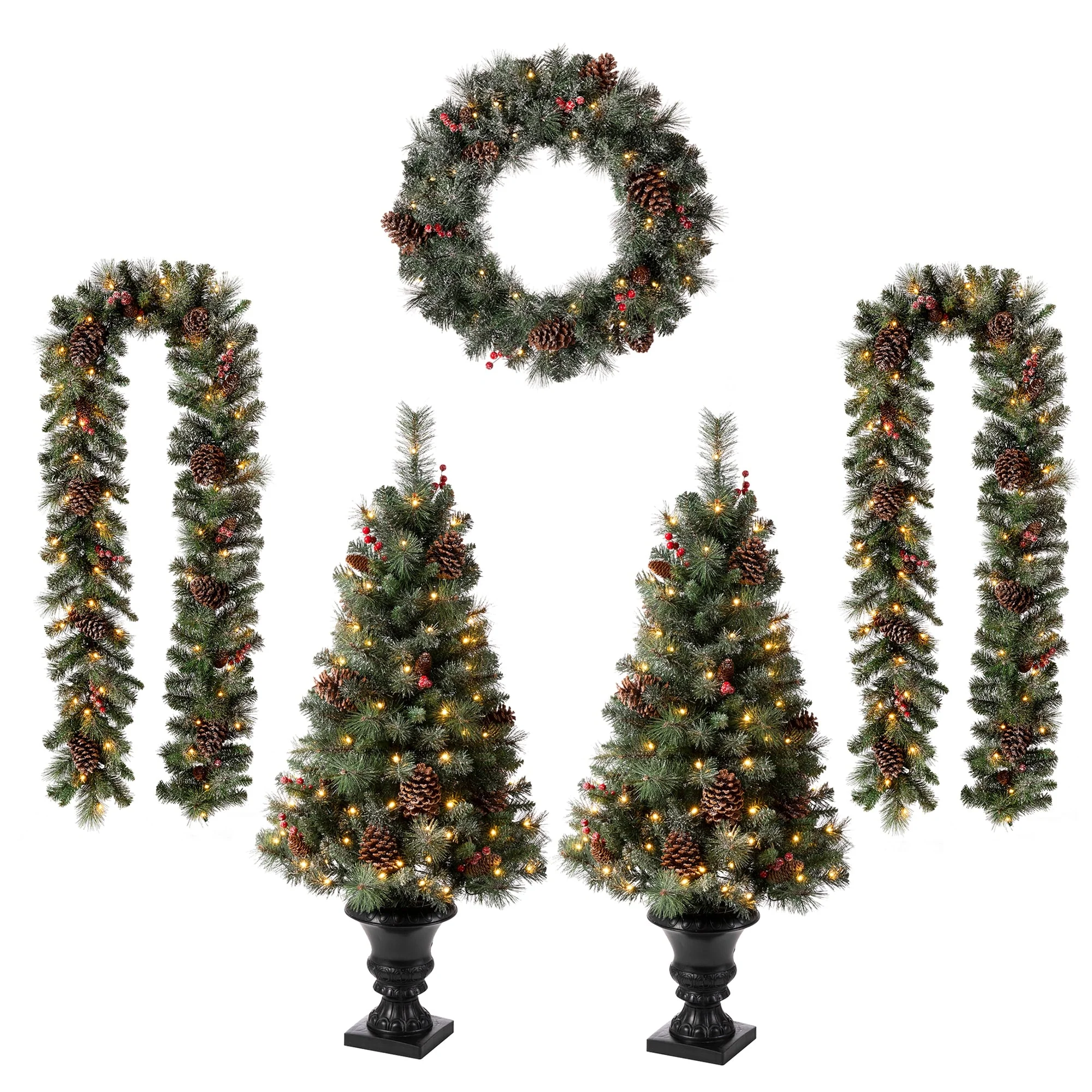 - Set of 5: 2pcs 4-foot porch trees & 1 pc wreath & 2 pcs garlands