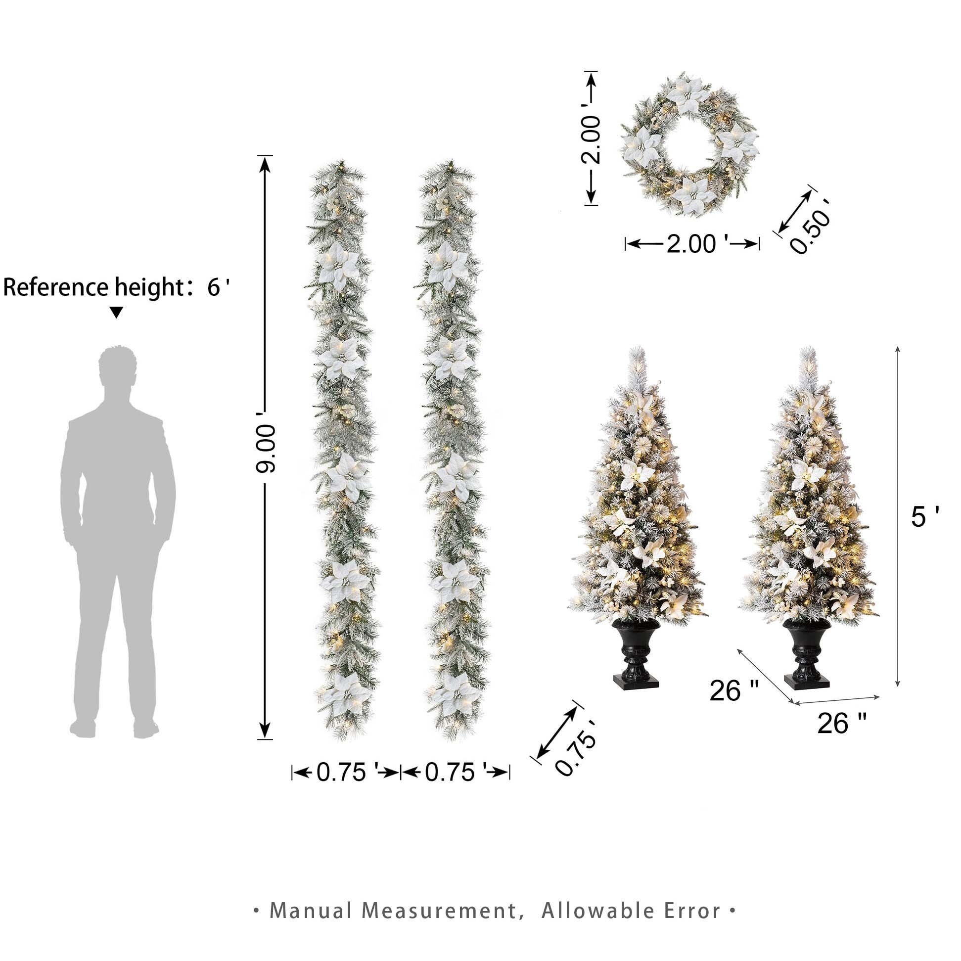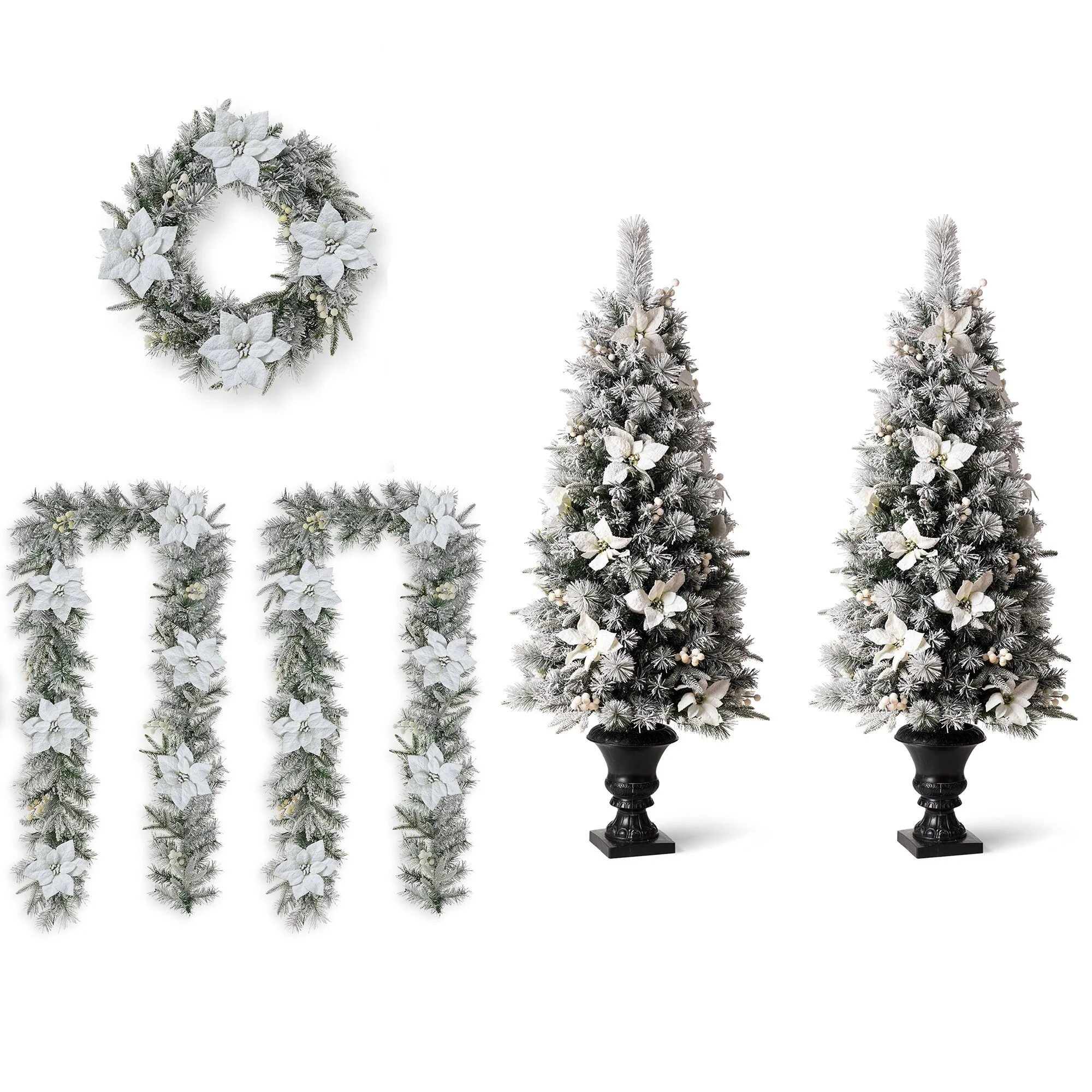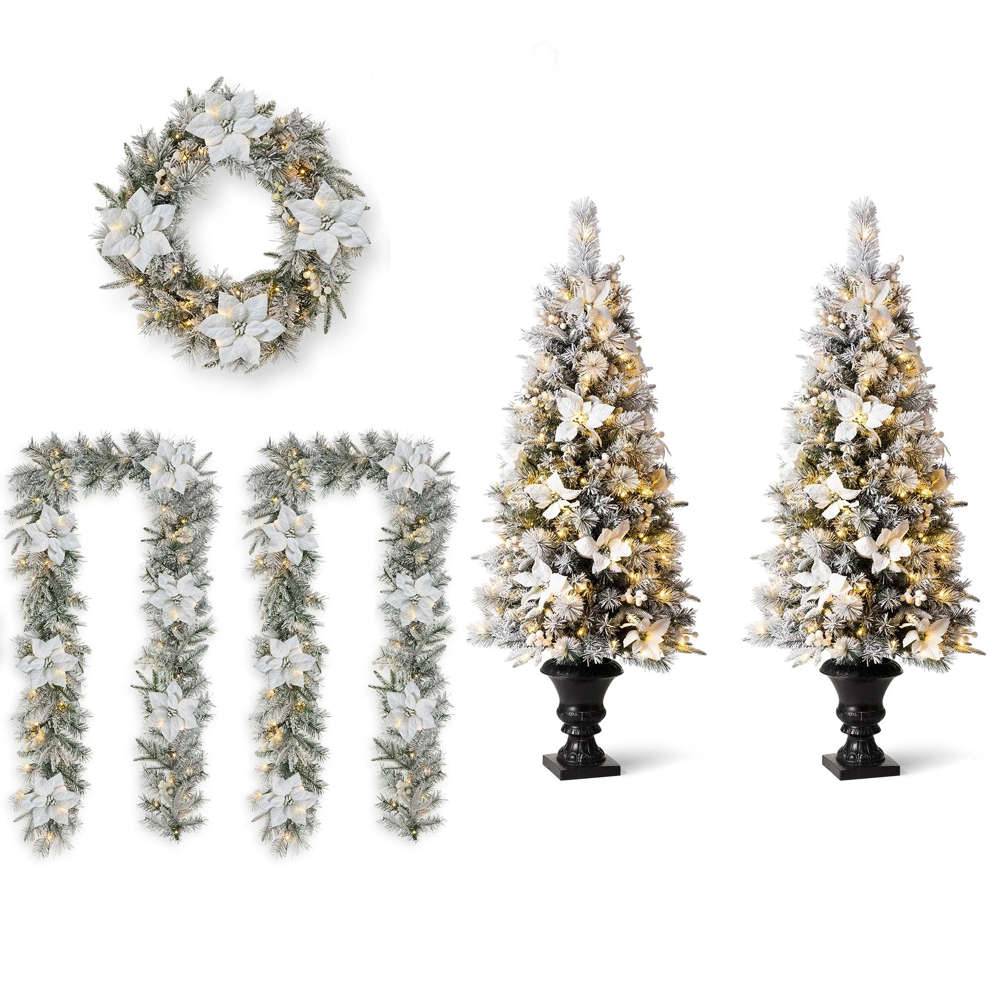 Glitzhome 5FT Pre-Lit Flocked Pine Artificial Christmas Porch Tree with 150 Warm White Lights and Poinsettia