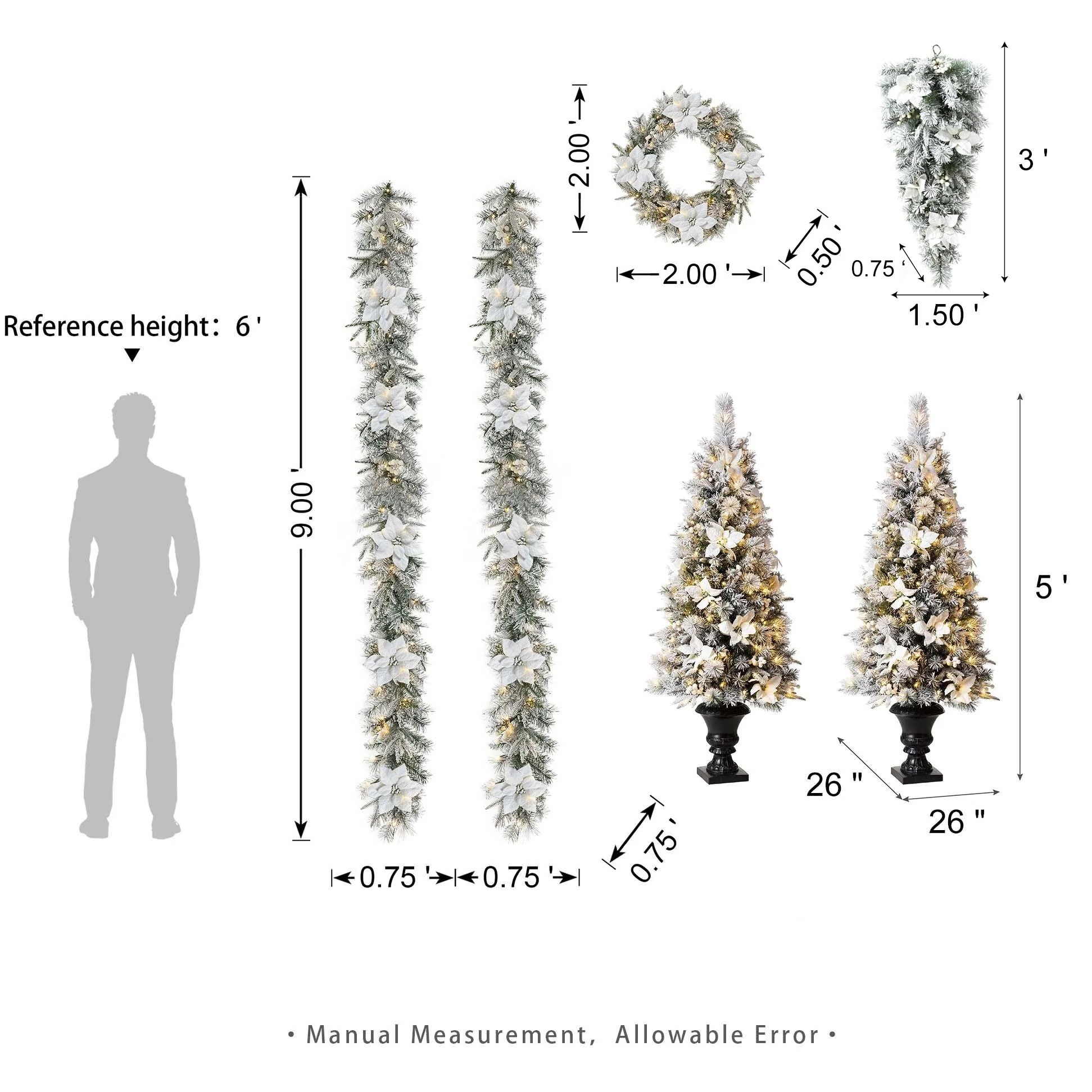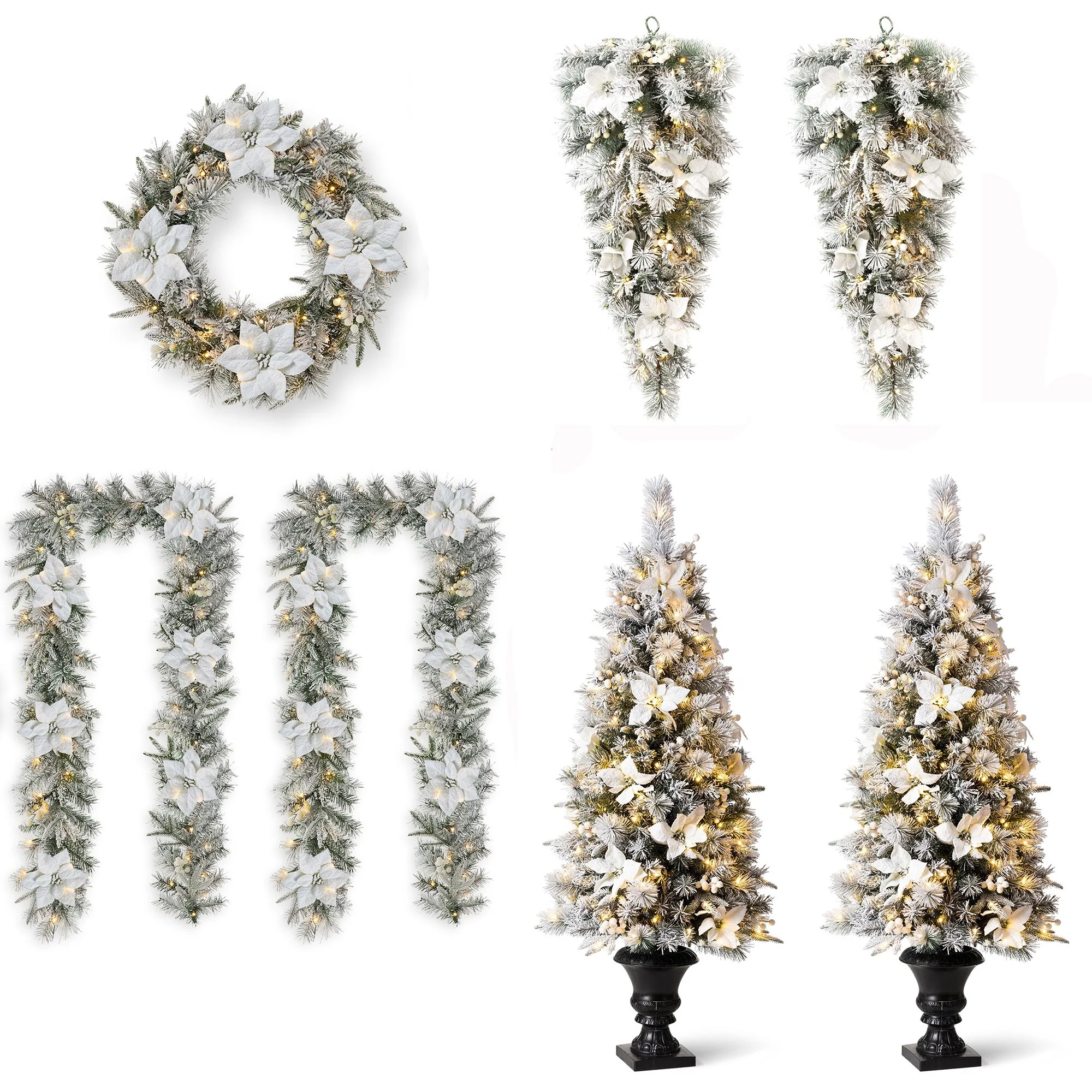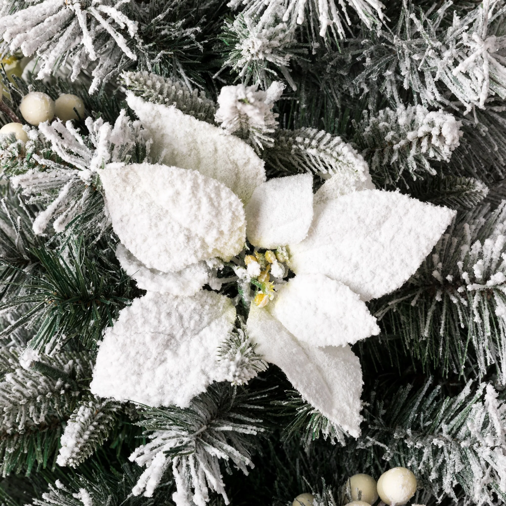 Glitzhome 5FT Pre-Lit Flocked Pine Artificial Christmas Porch Tree with 150 Warm White Lights and Poinsettia