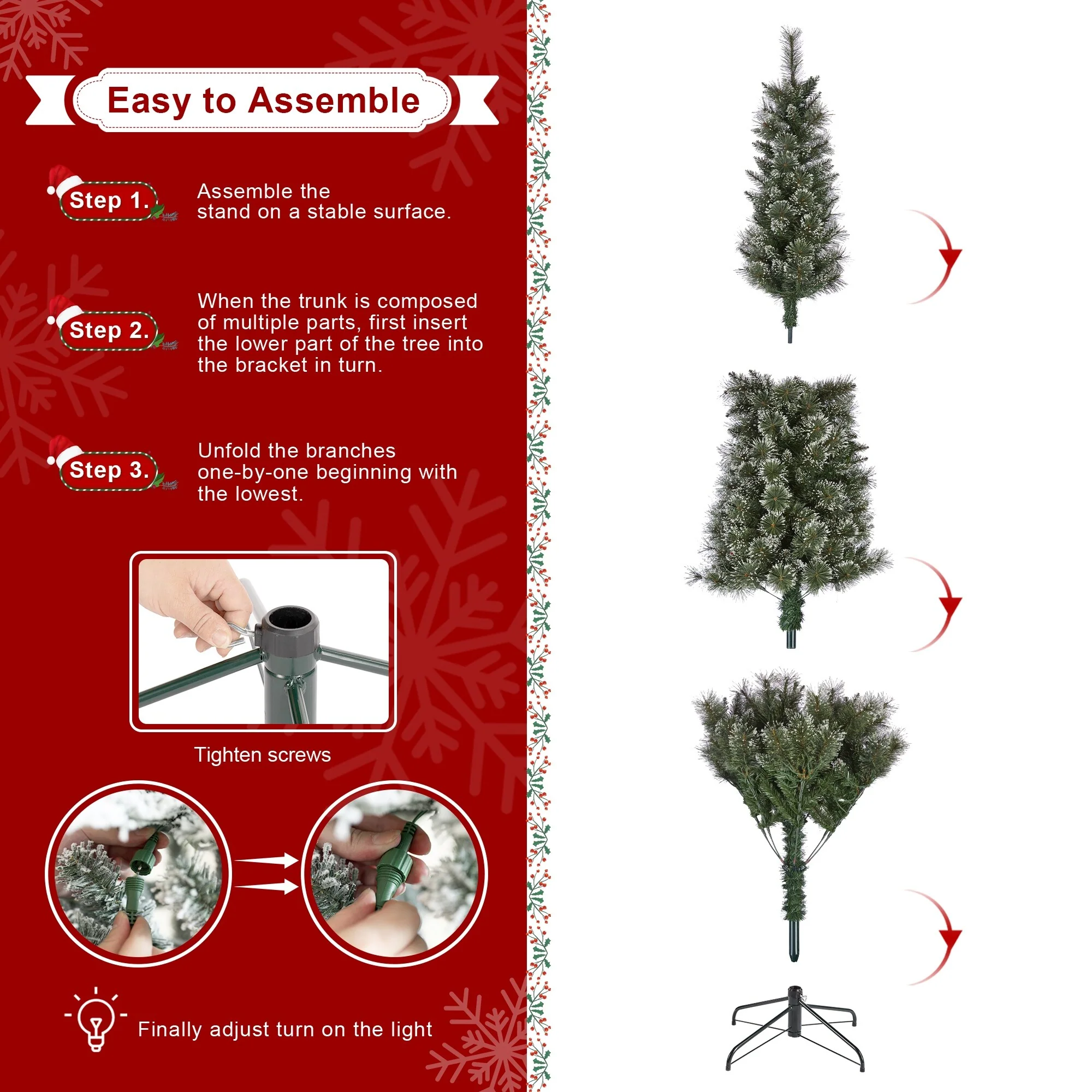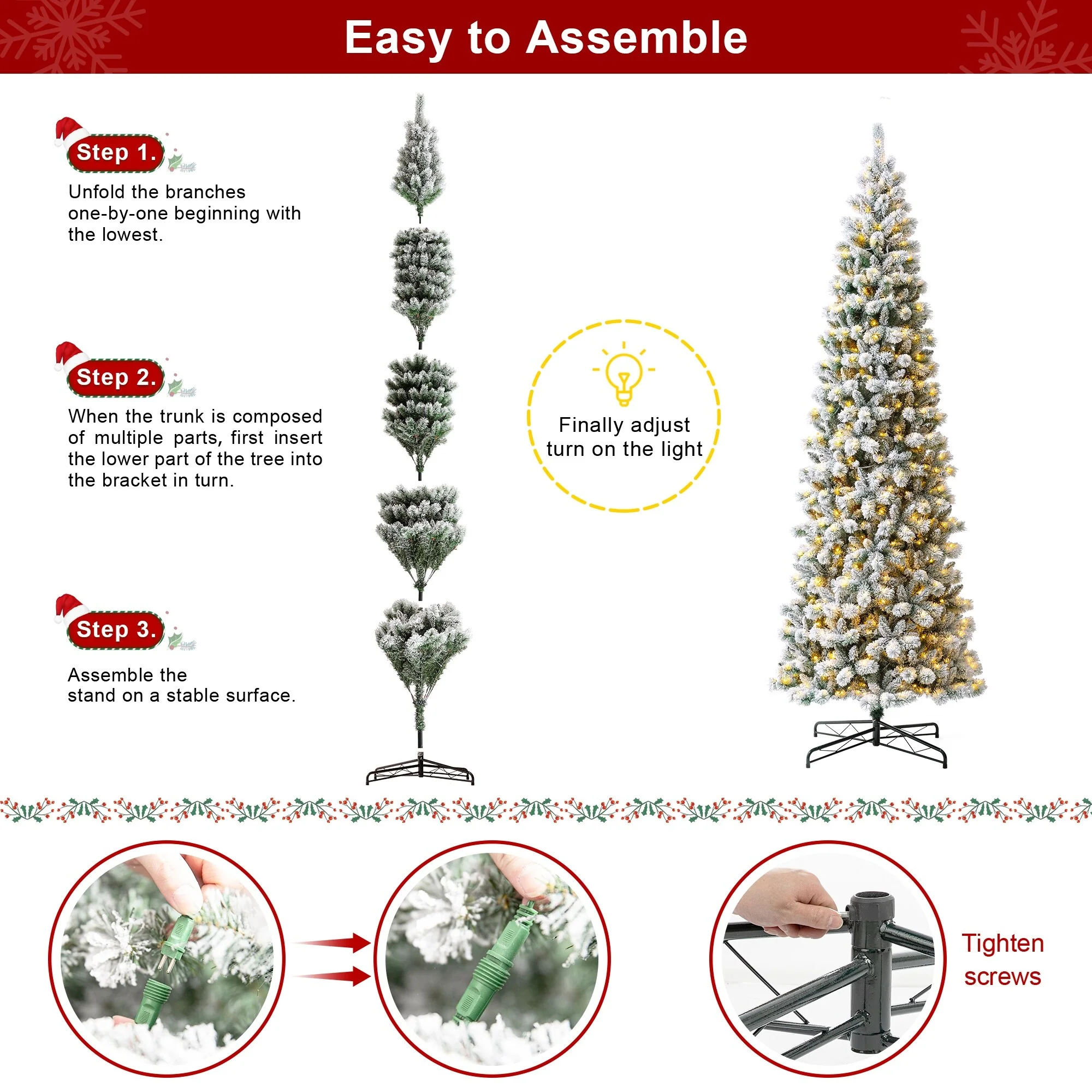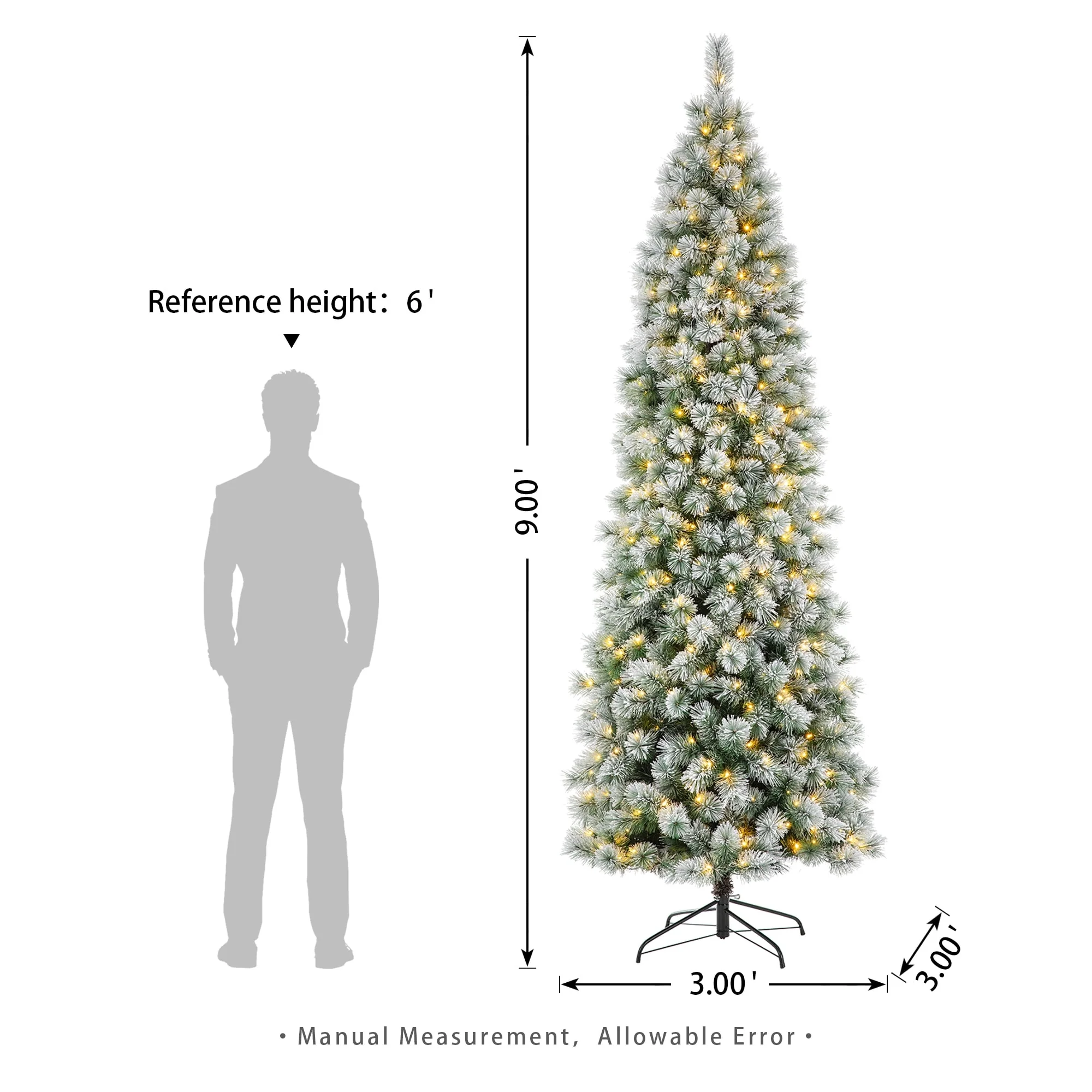 This 7.5FT/9FT/11FT Pre-Lit Green Pine Artificial Christmas tree creates a unique wintery feel, it will be an eye-catching addition to any room during the Christmas holidays. Illuminate your decor by adding a festive ambiance to your surroundings with this lighted artificial Christmas tree. The ambient glow from these luminaries is sure to create the mood for celebrating the season. Place it in your favorite spot and garner good compliments from everyone who glances.