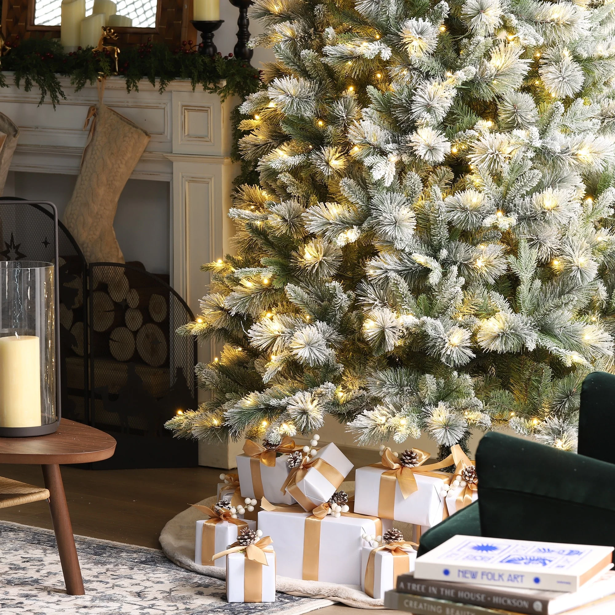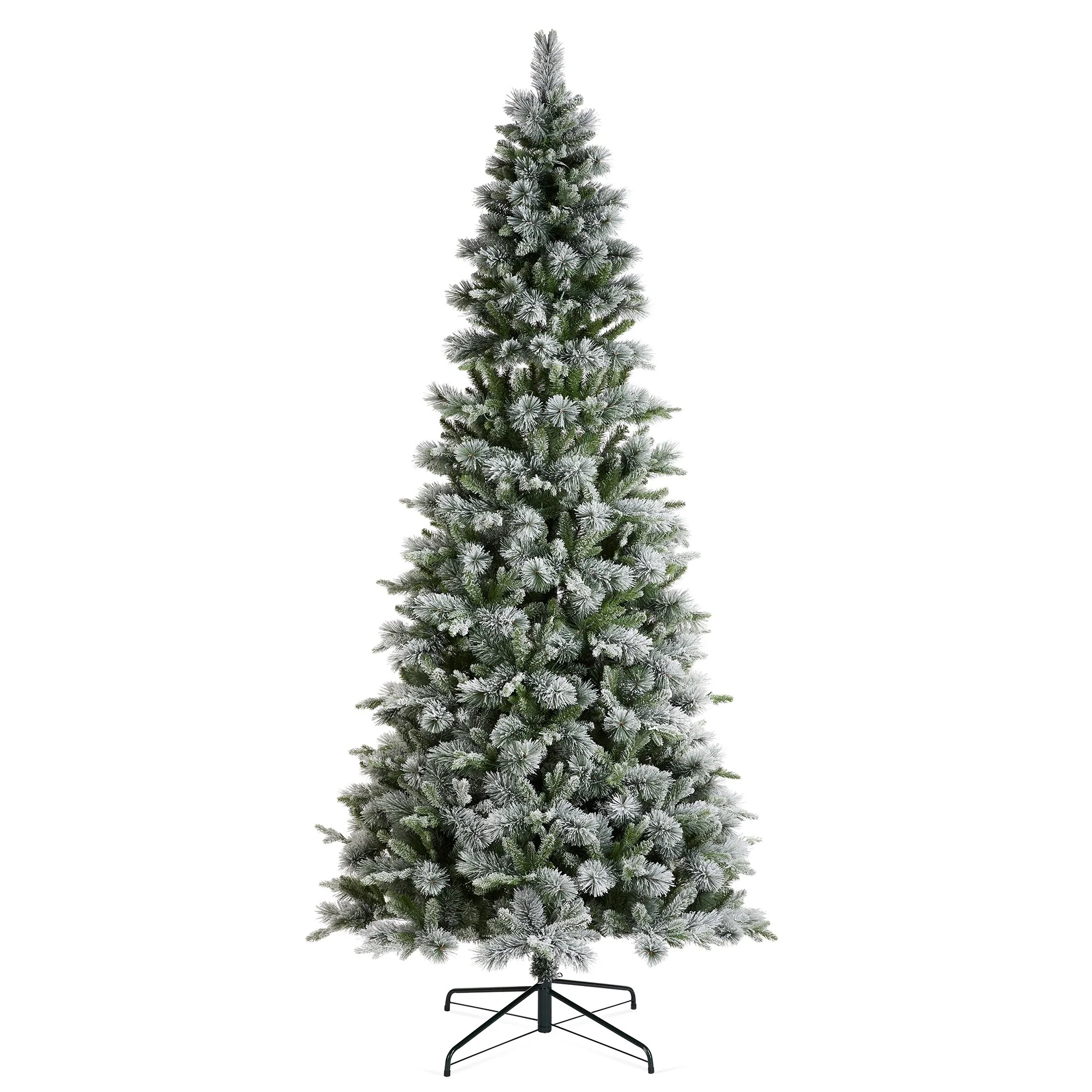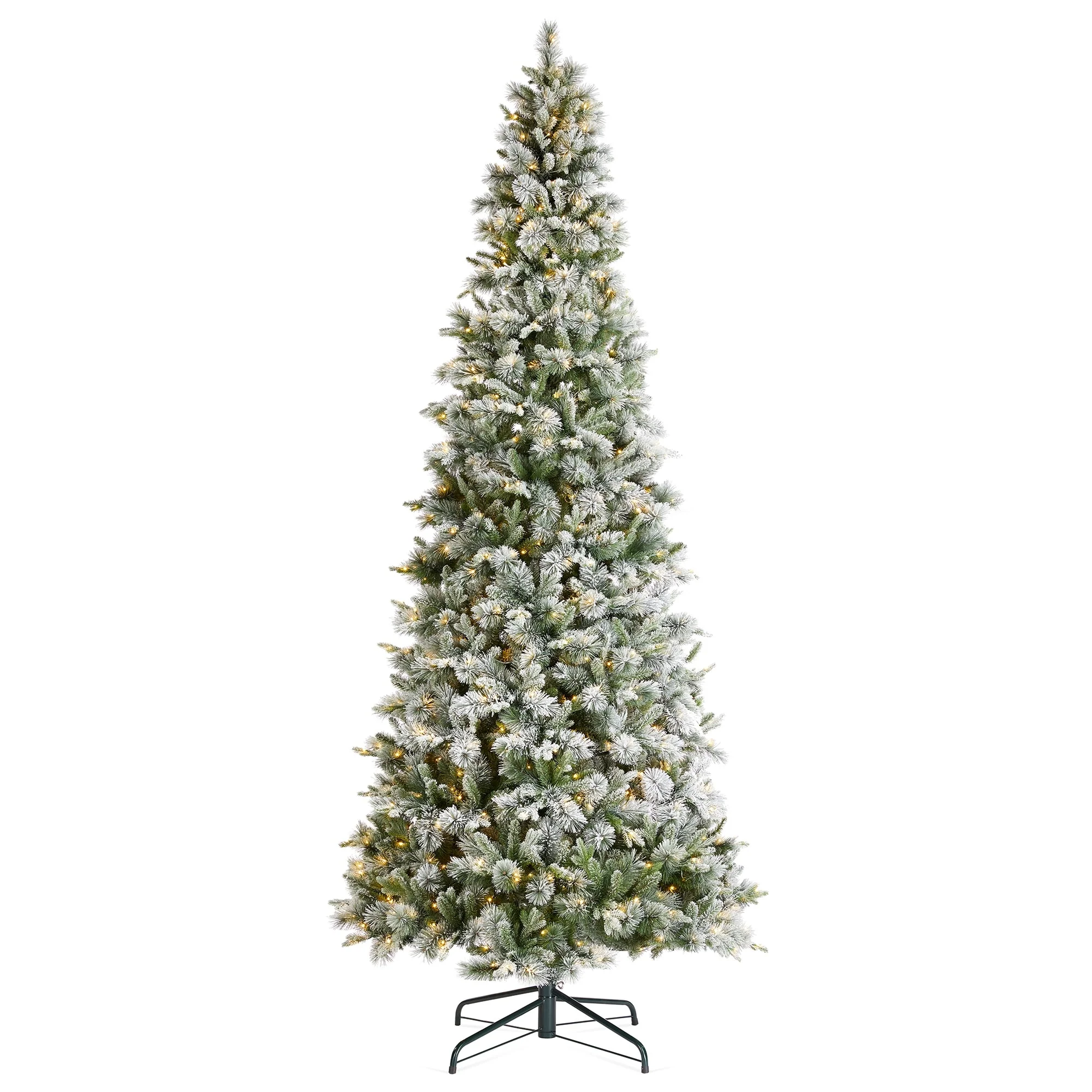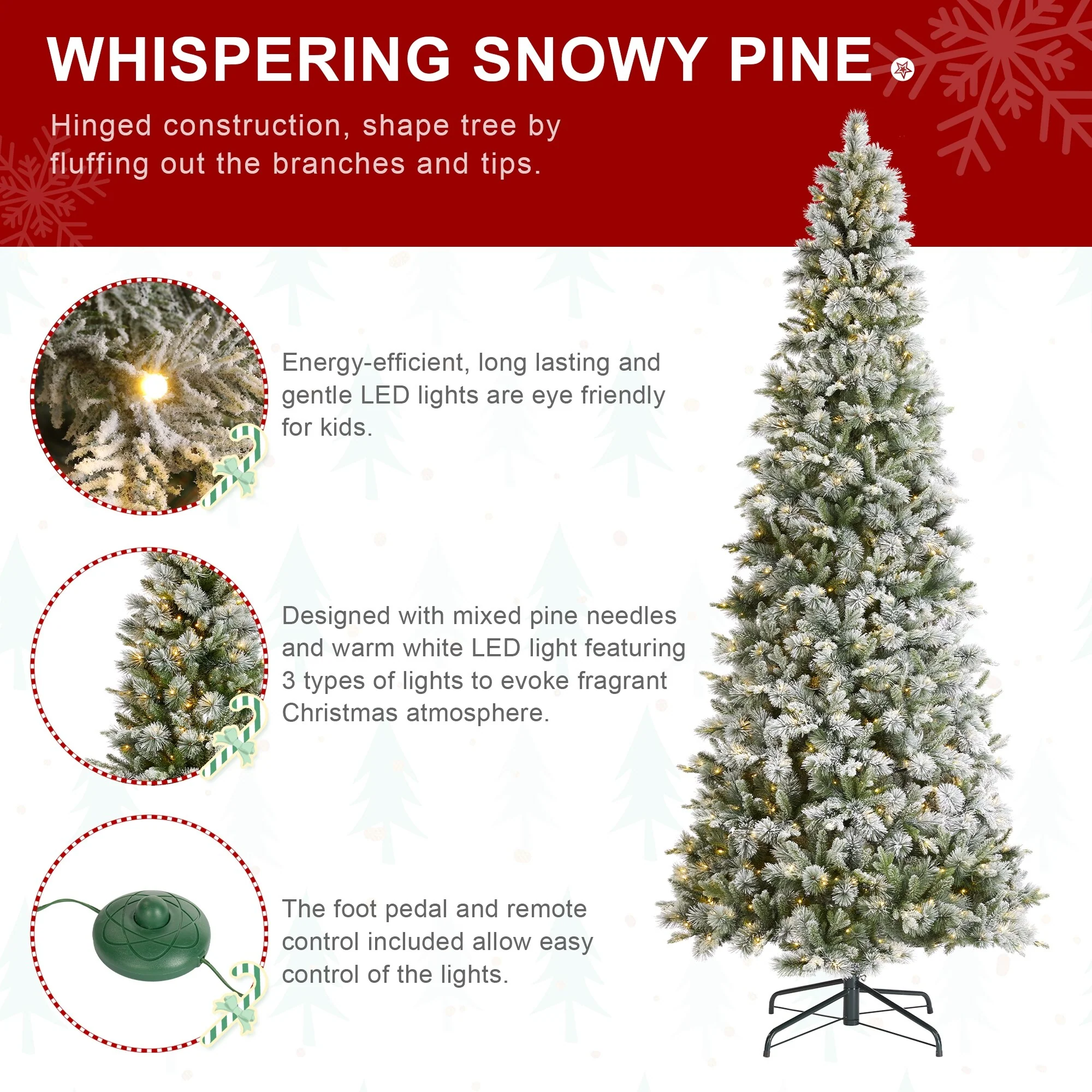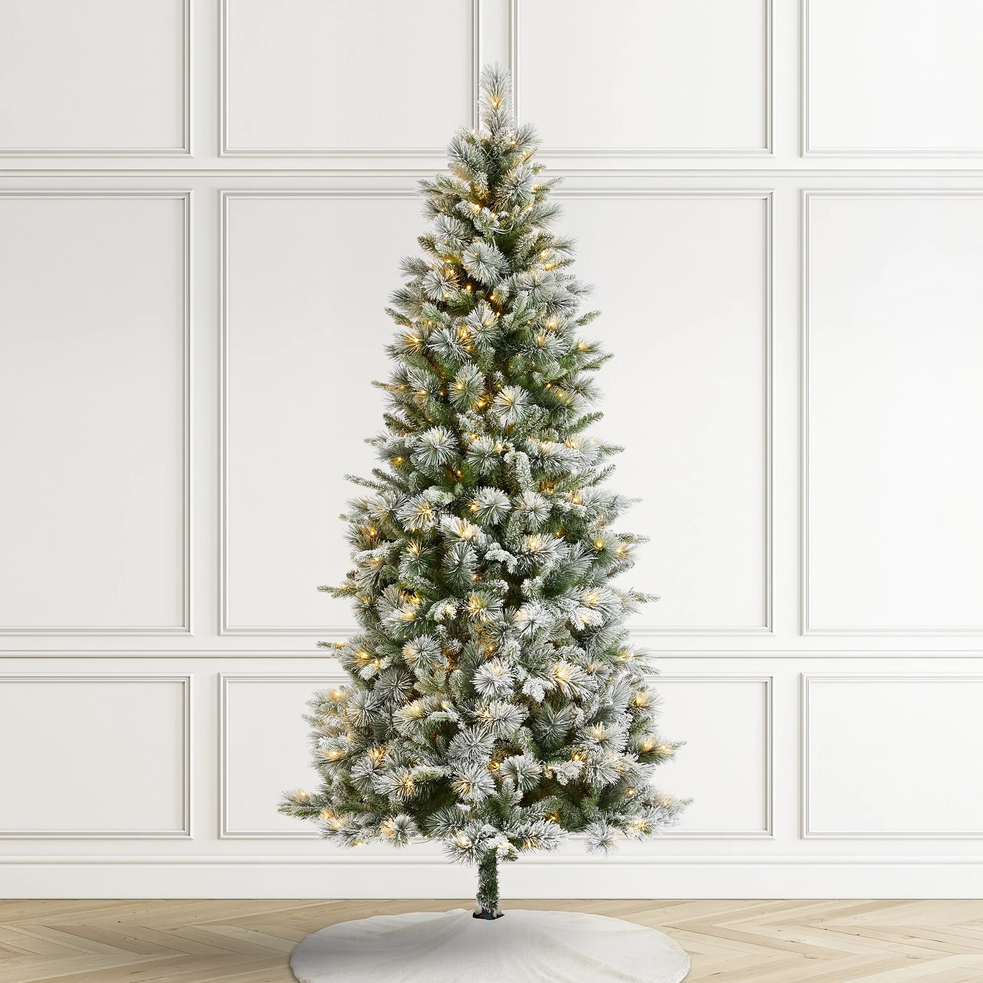 The 7.5ft-11ft Whispering Snowy Pine Christmas Tree features realistic pine needles, a slim design, and a snowy flocked appearance. Pre-lit with warm white lights, it creates a cozy, inviting atmosphere, making it a beautiful focal point for your holiday celebrations.