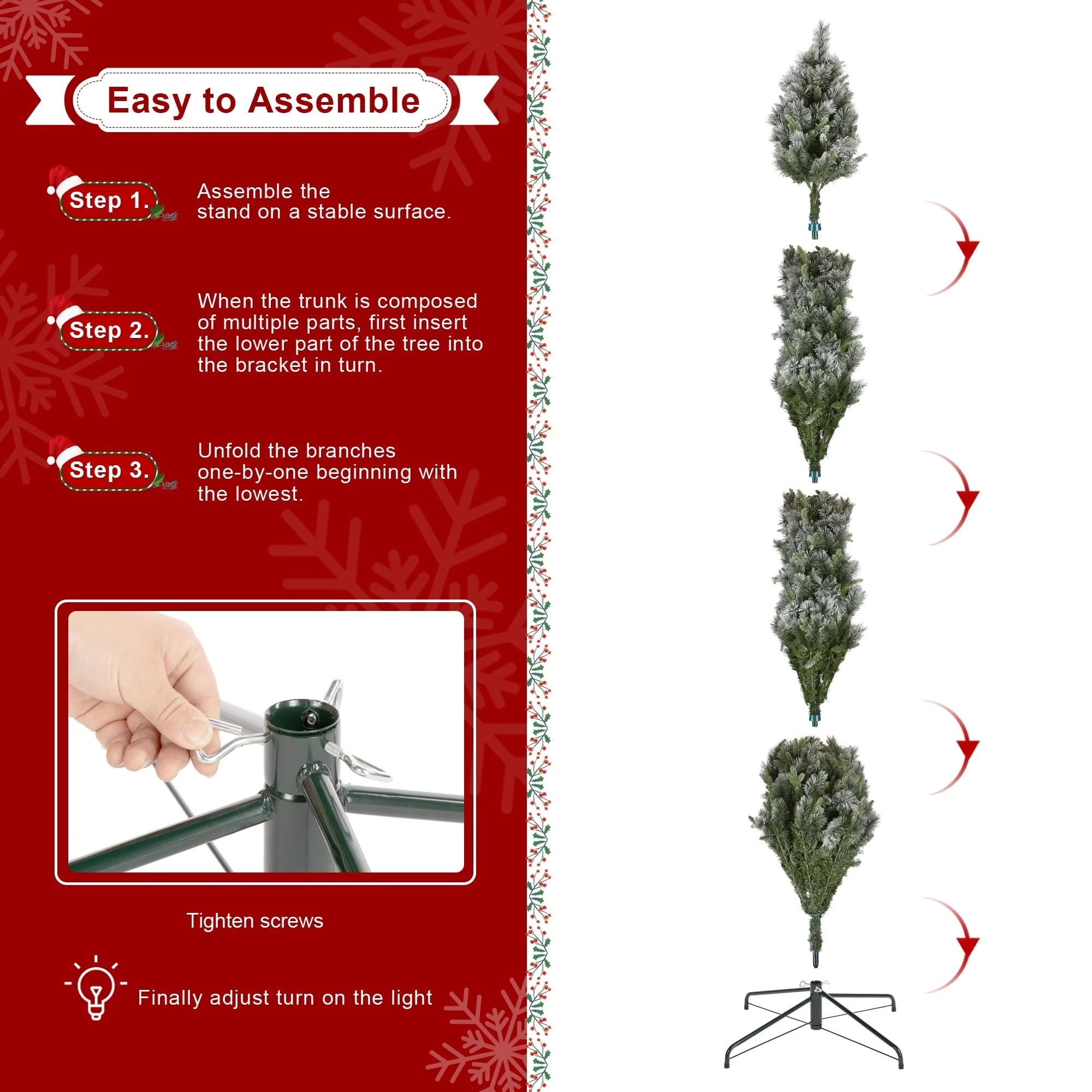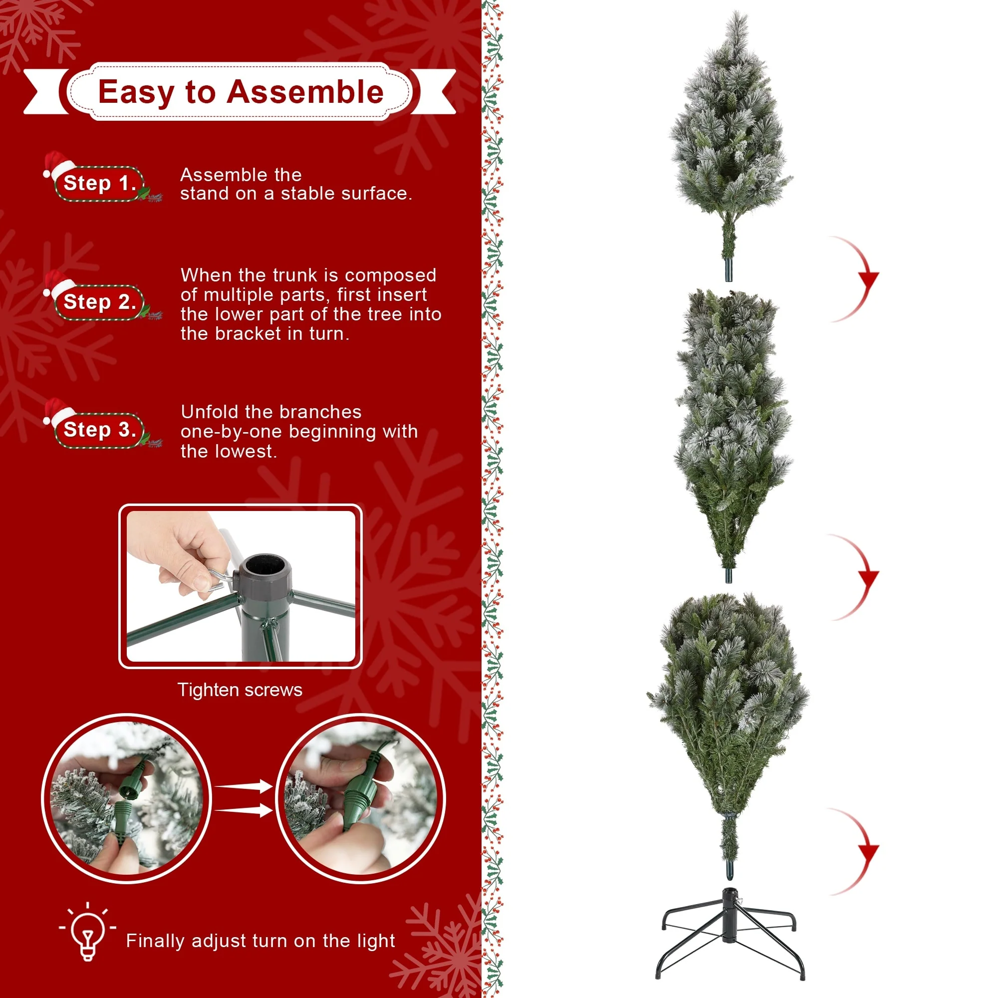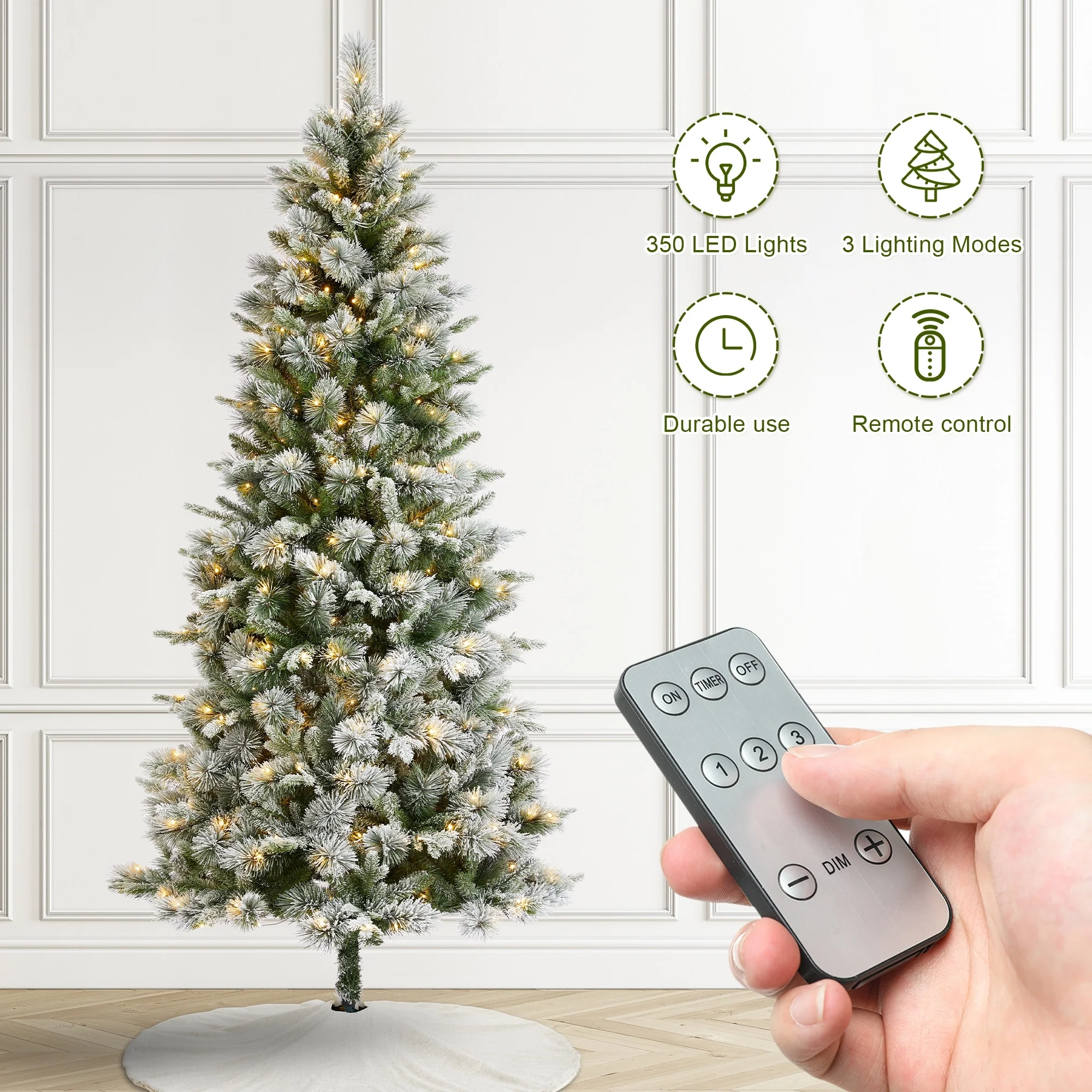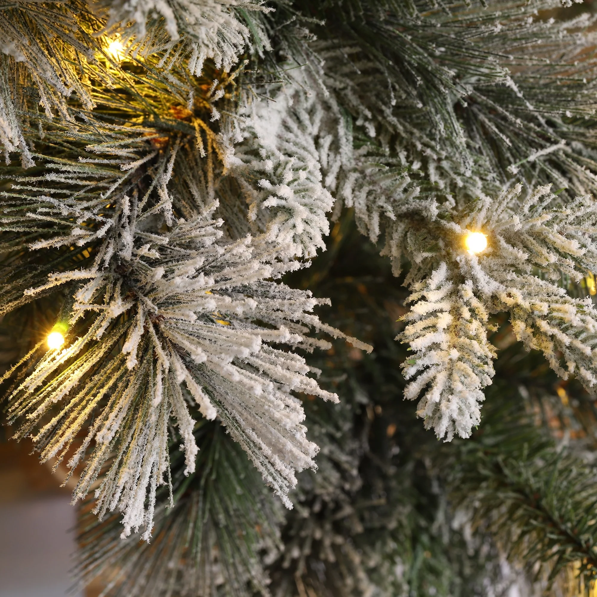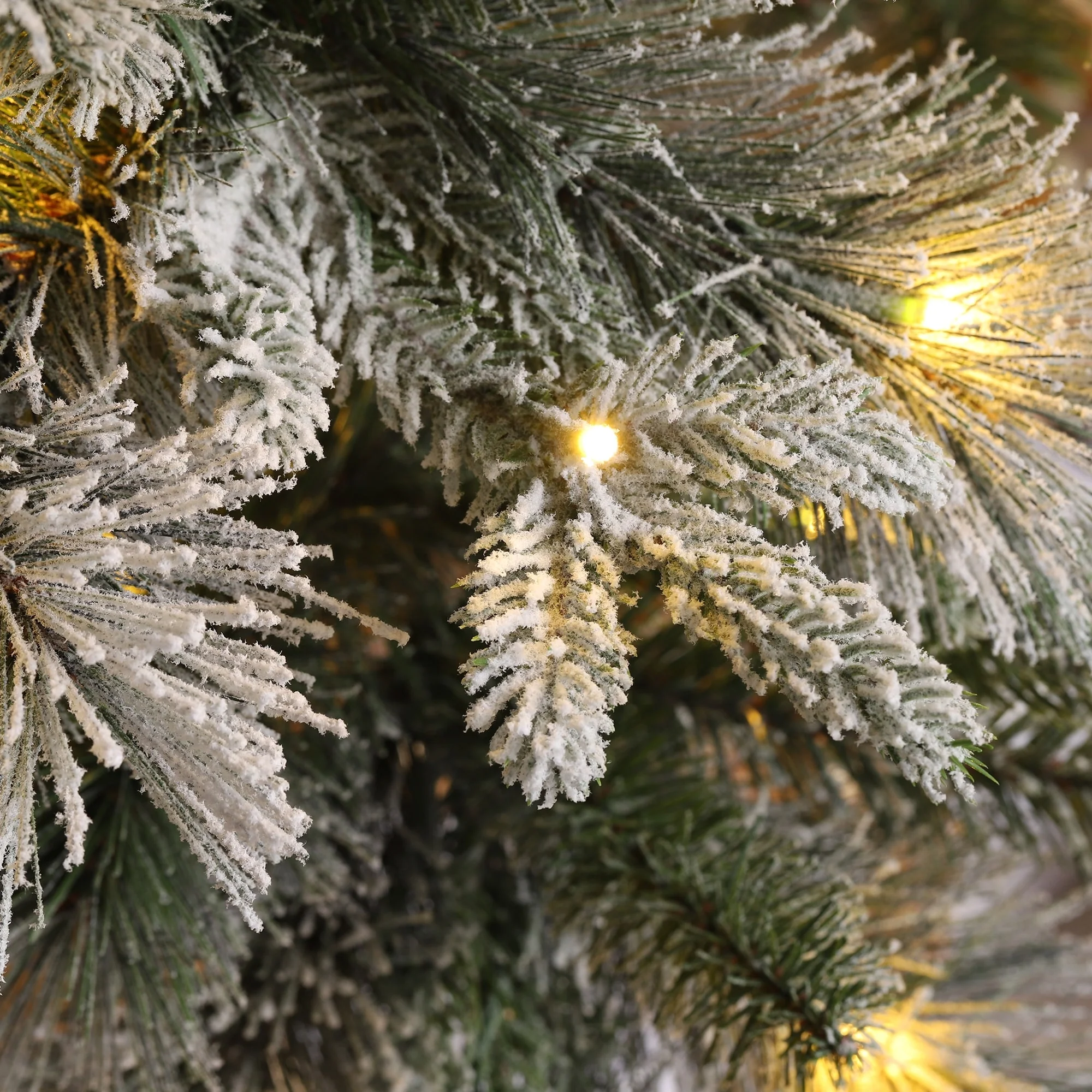 The 7.5ft-11ft Whispering Snowy Pine Christmas Tree features realistic pine needles, a slim design, and a snowy flocked appearance. Pre-lit with warm white lights, it creates a cozy, inviting atmosphere, making it a beautiful focal point for your holiday celebrations.
