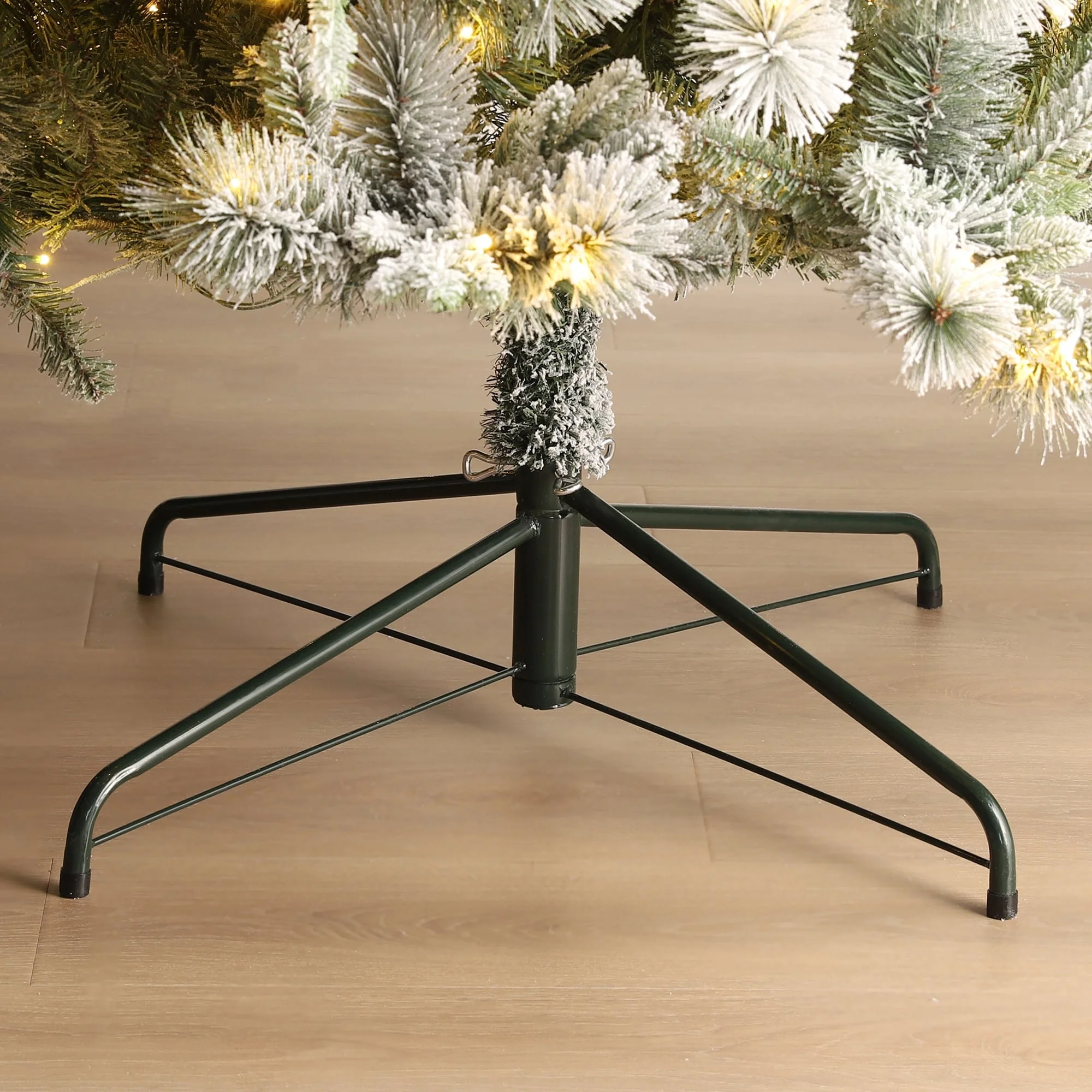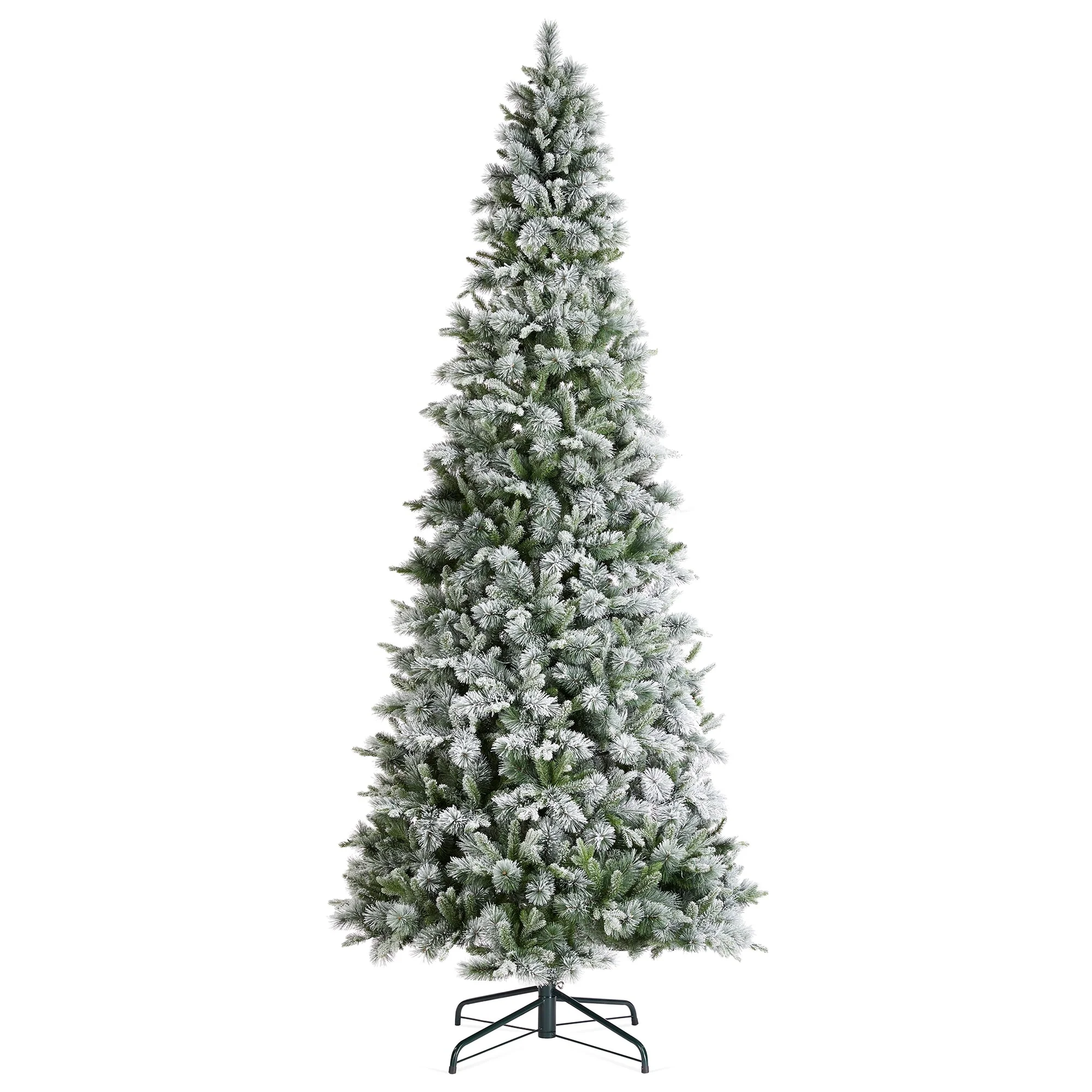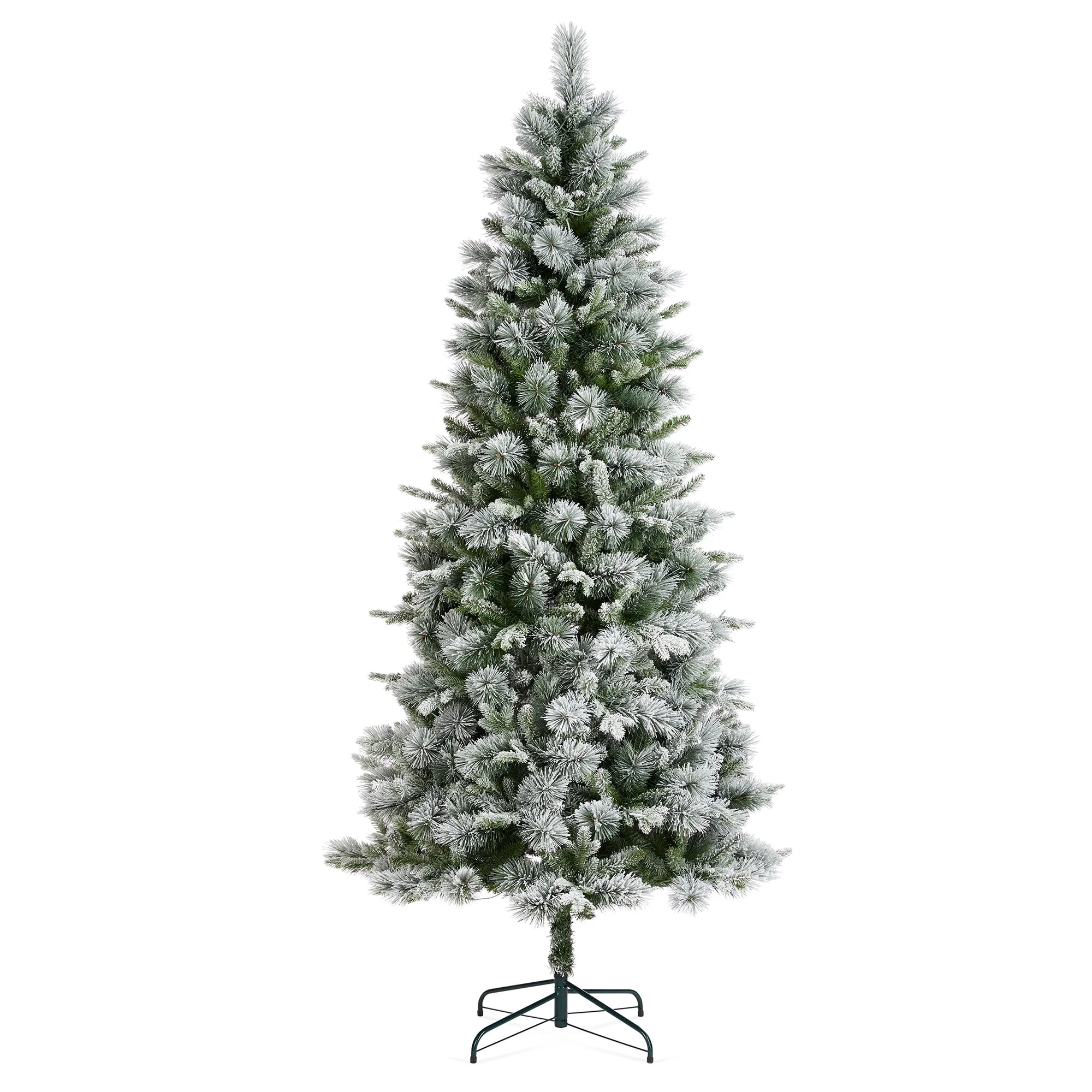 - Natural flocked slim pine tree with sturdy steel metal stand, fits beautifully in both large and small spaces.