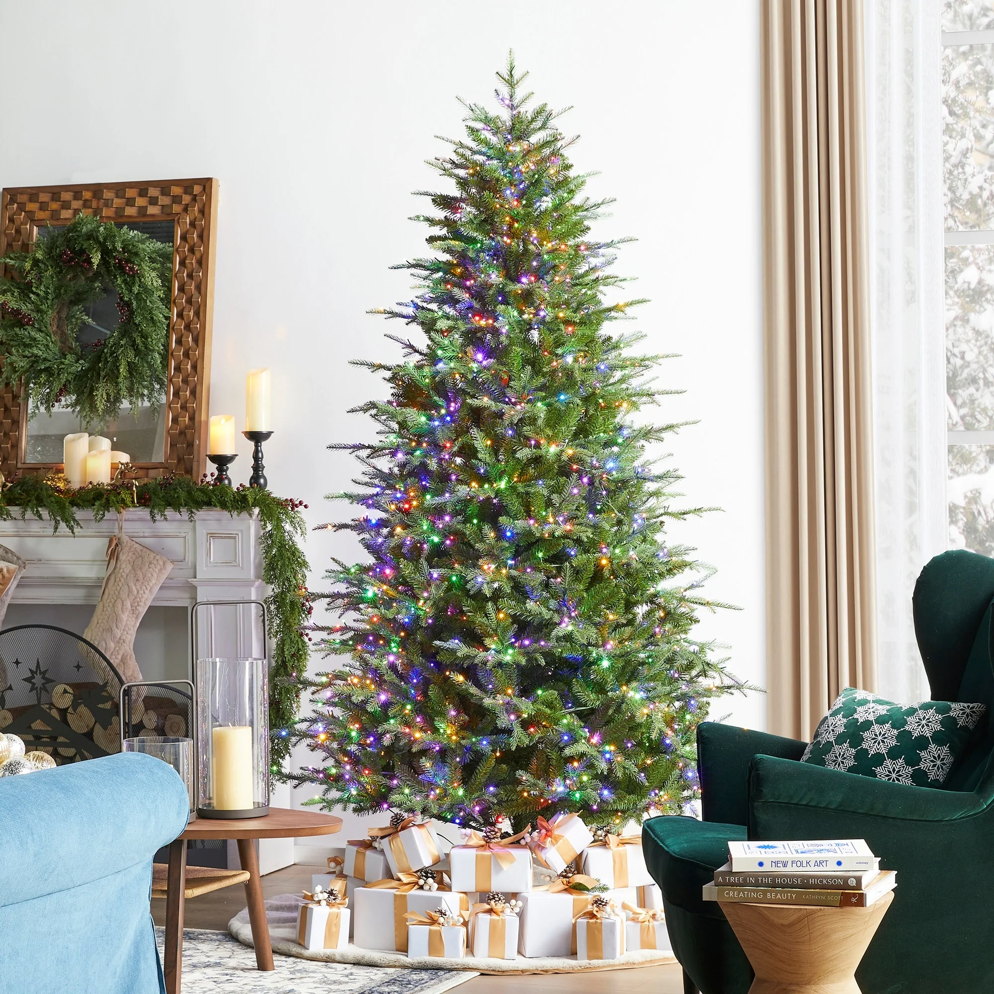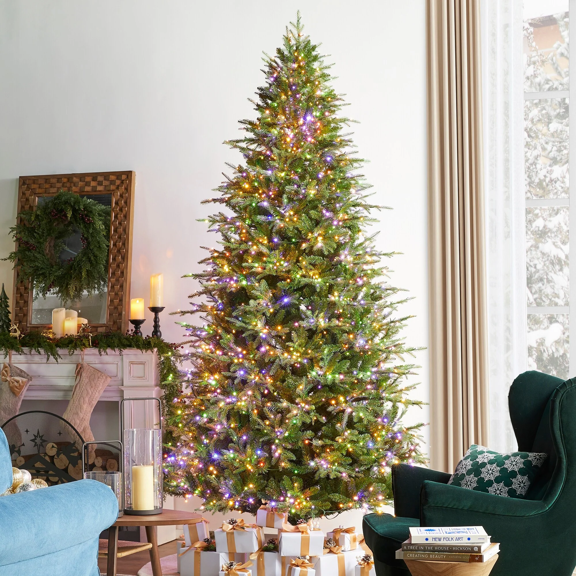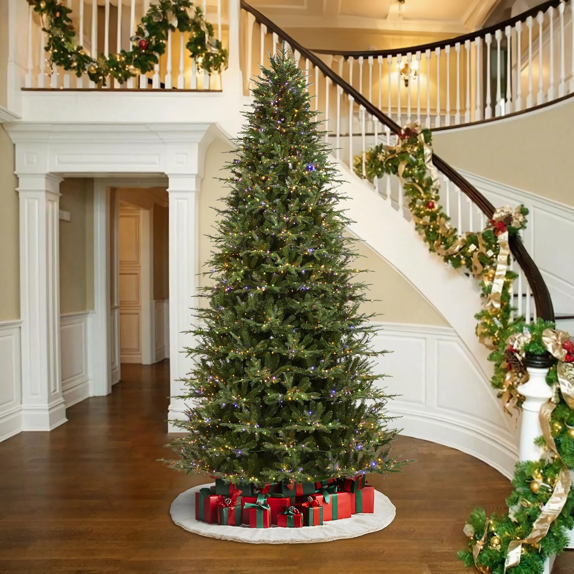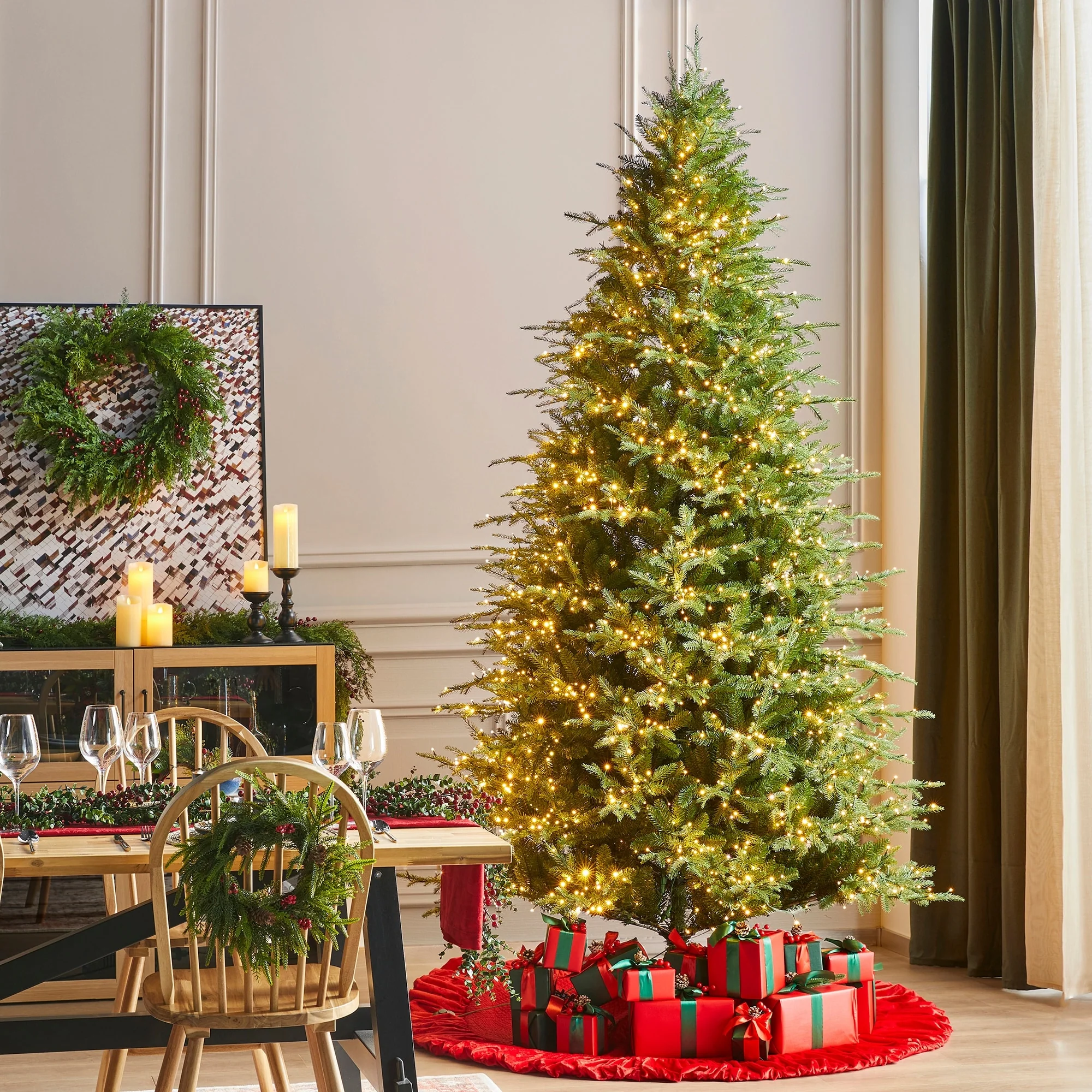 The 7.5ft-11ft Pre-Lit Green Full Fir Christmas Tree brings the beauty of a lush fir forest indoors. With its full, symmetrical shape and pre-lit lights that enhance the green foliage, it creates a cozy and inviting atmosphere, perfect for celebrating the Christmas season.