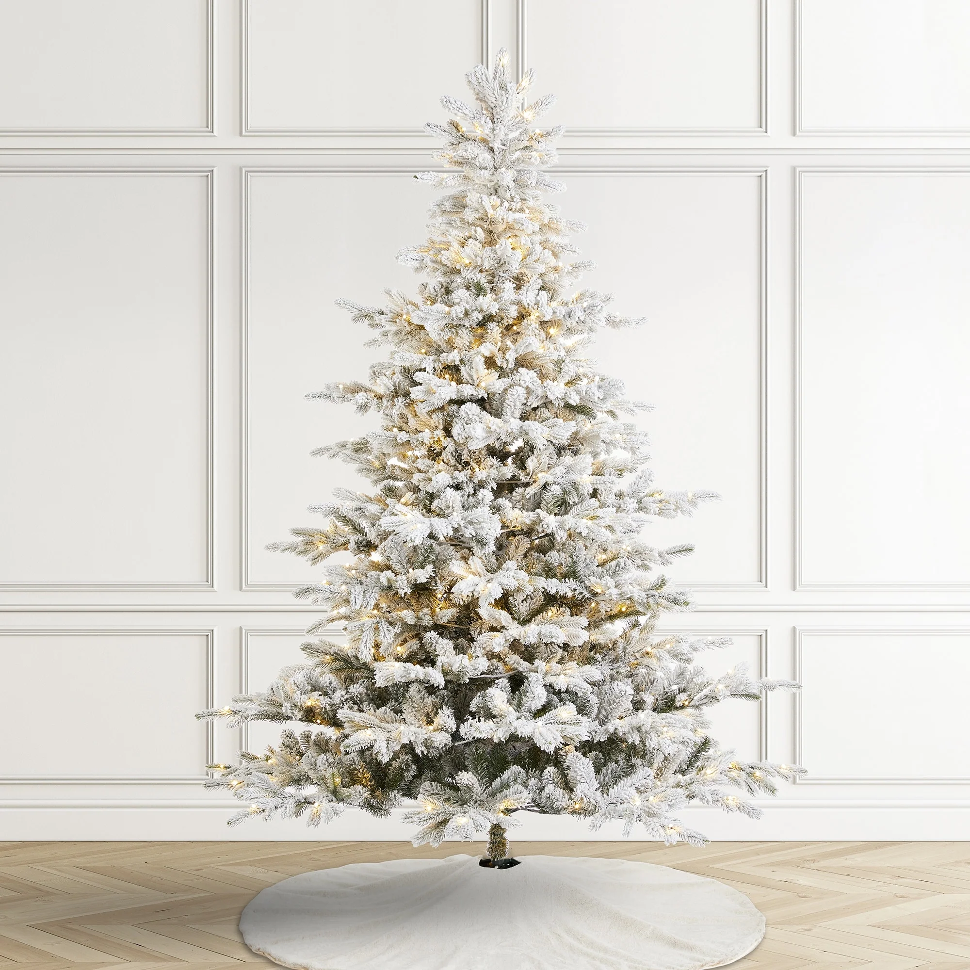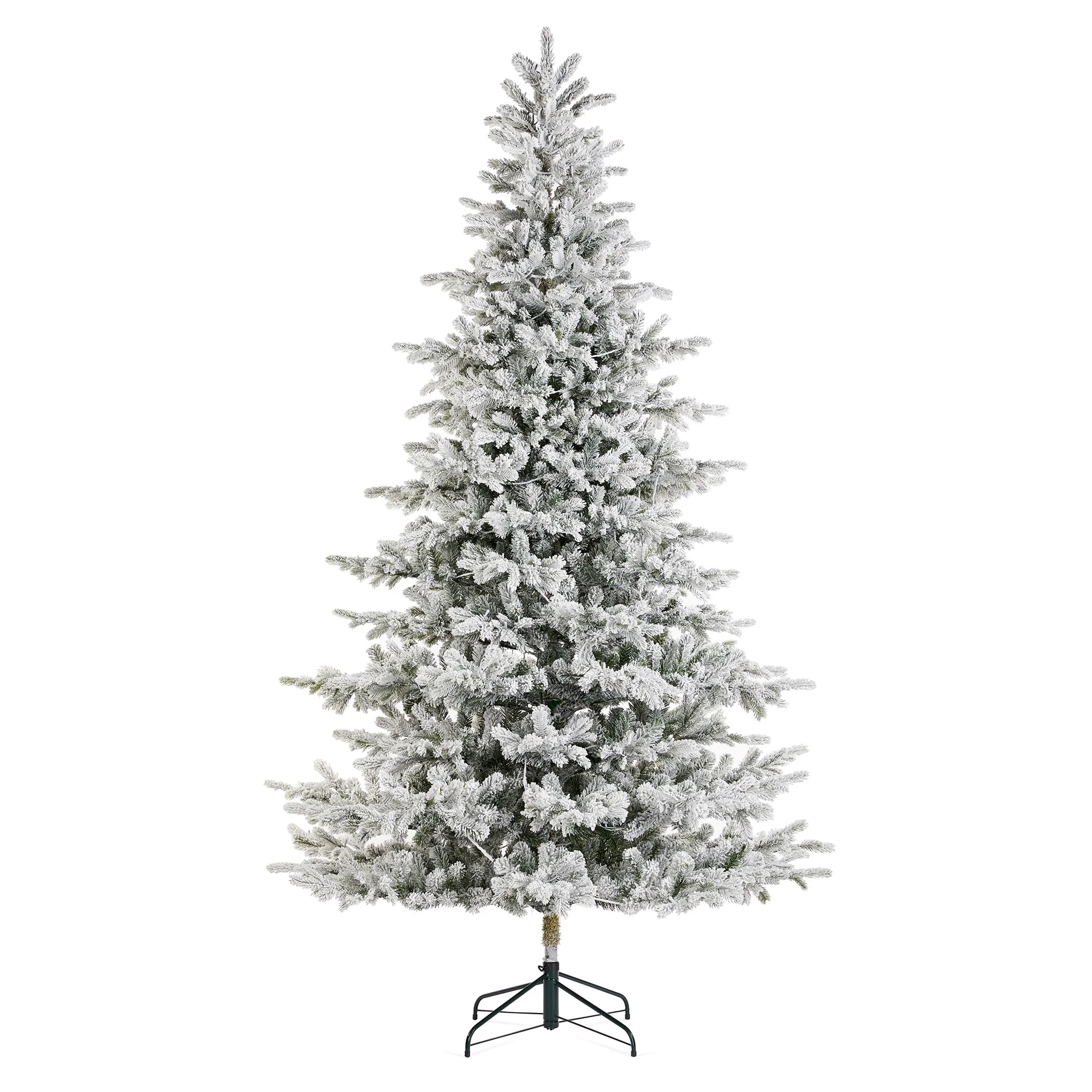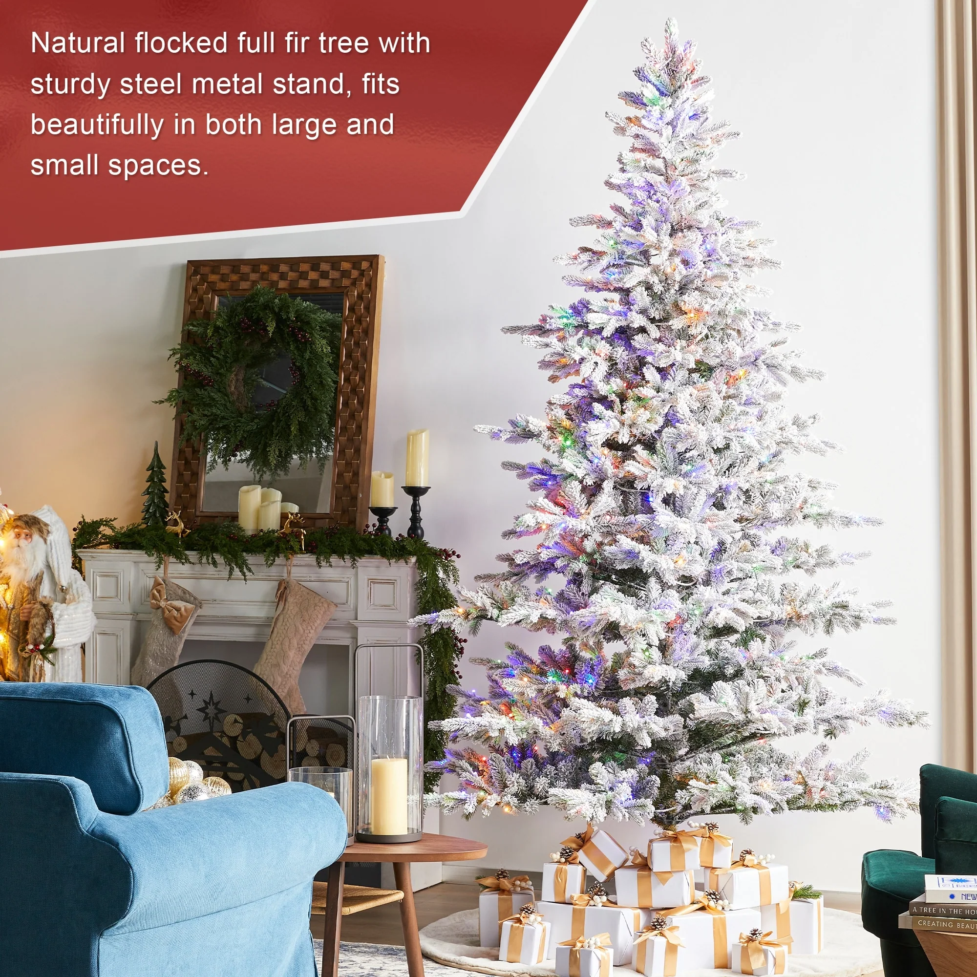 The 7.5-9ft Pre-Lit Flocked Full Fir Christmas Tree brings winter forest beauty with its lush, layered design and warm white lights. The sturdy metal stand ensures stability and easy setup, making it a convenient and attractive focal point for your holiday celebrations, enhancing the festive atmosphere.�