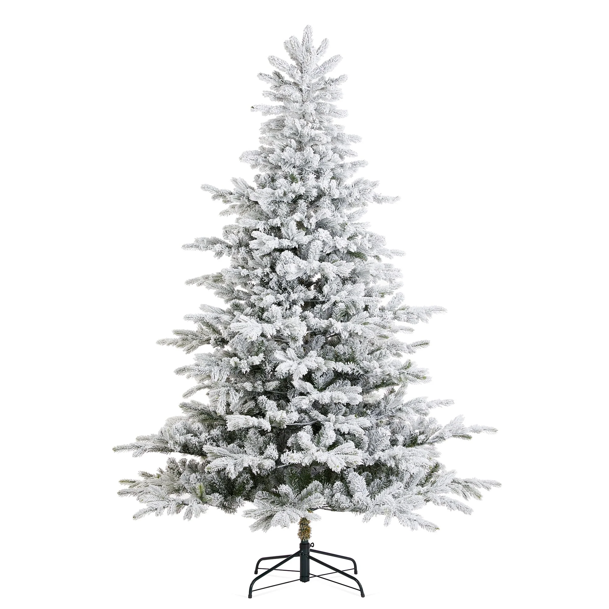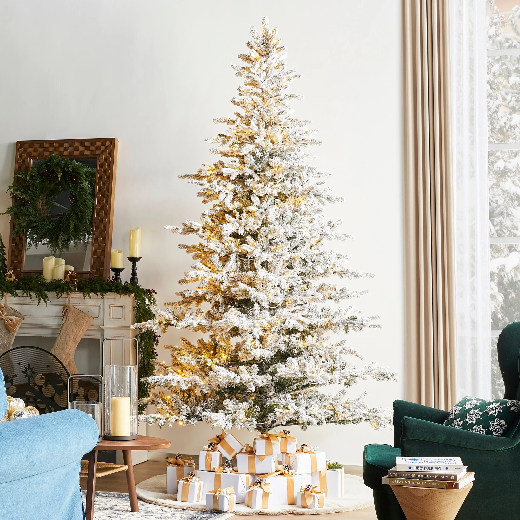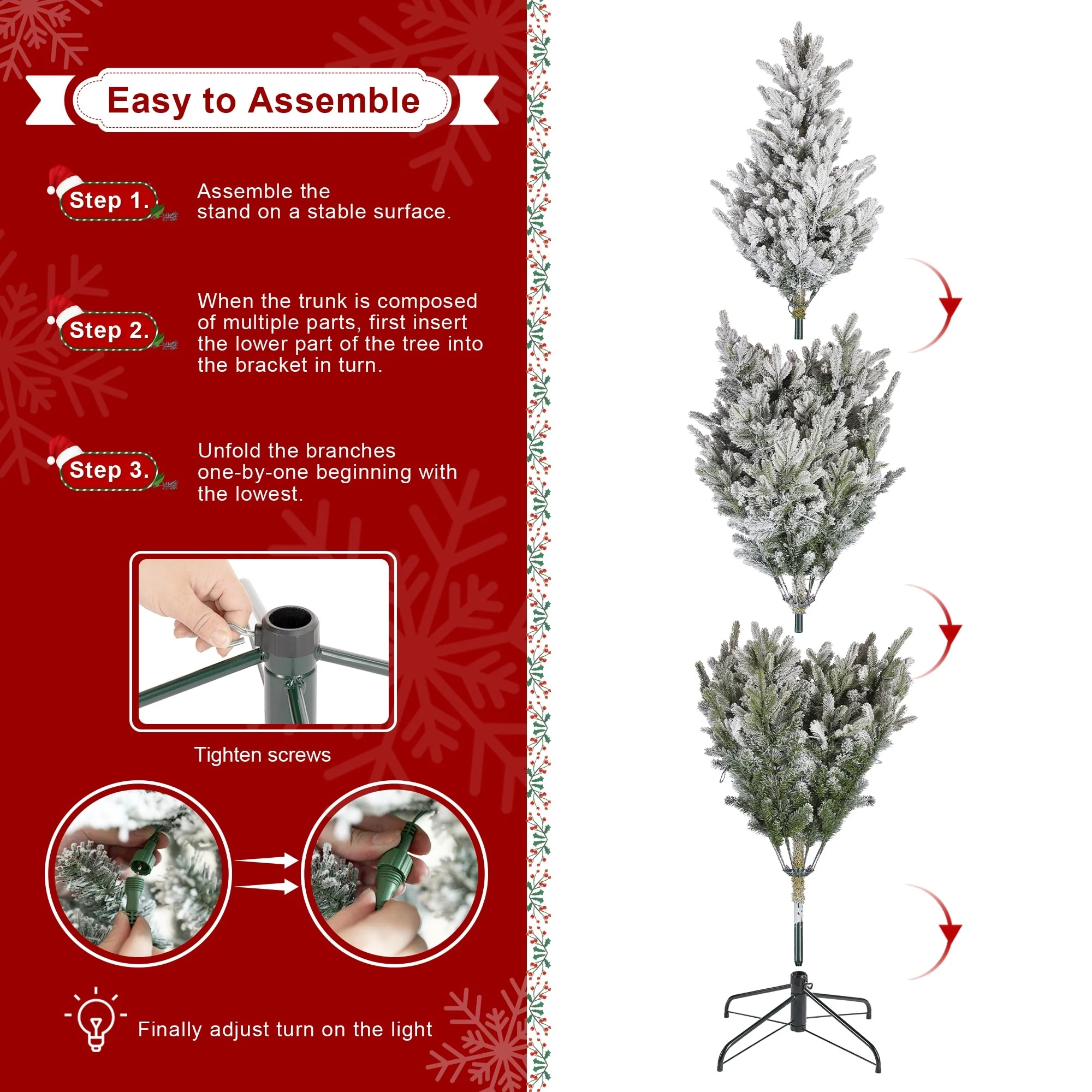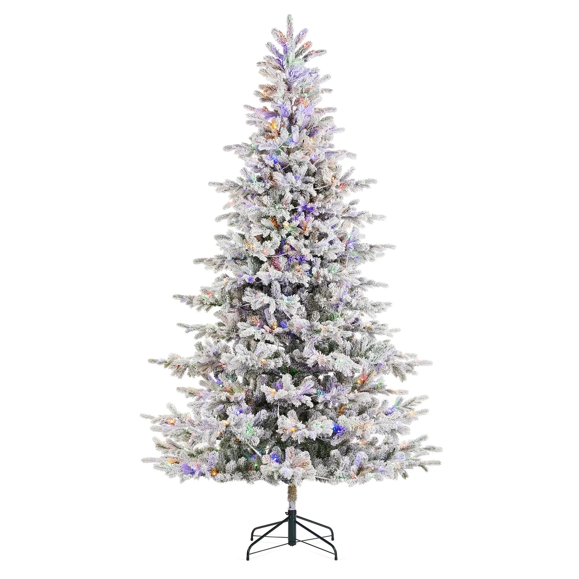 The 7.5-9ft Pre-Lit Flocked Full Fir Christmas Tree brings winter forest beauty with its lush, layered design and warm white lights. The sturdy metal stand ensures stability and easy setup, making it a convenient and attractive focal point for your holiday celebrations, enhancing the festive atmosphere.�