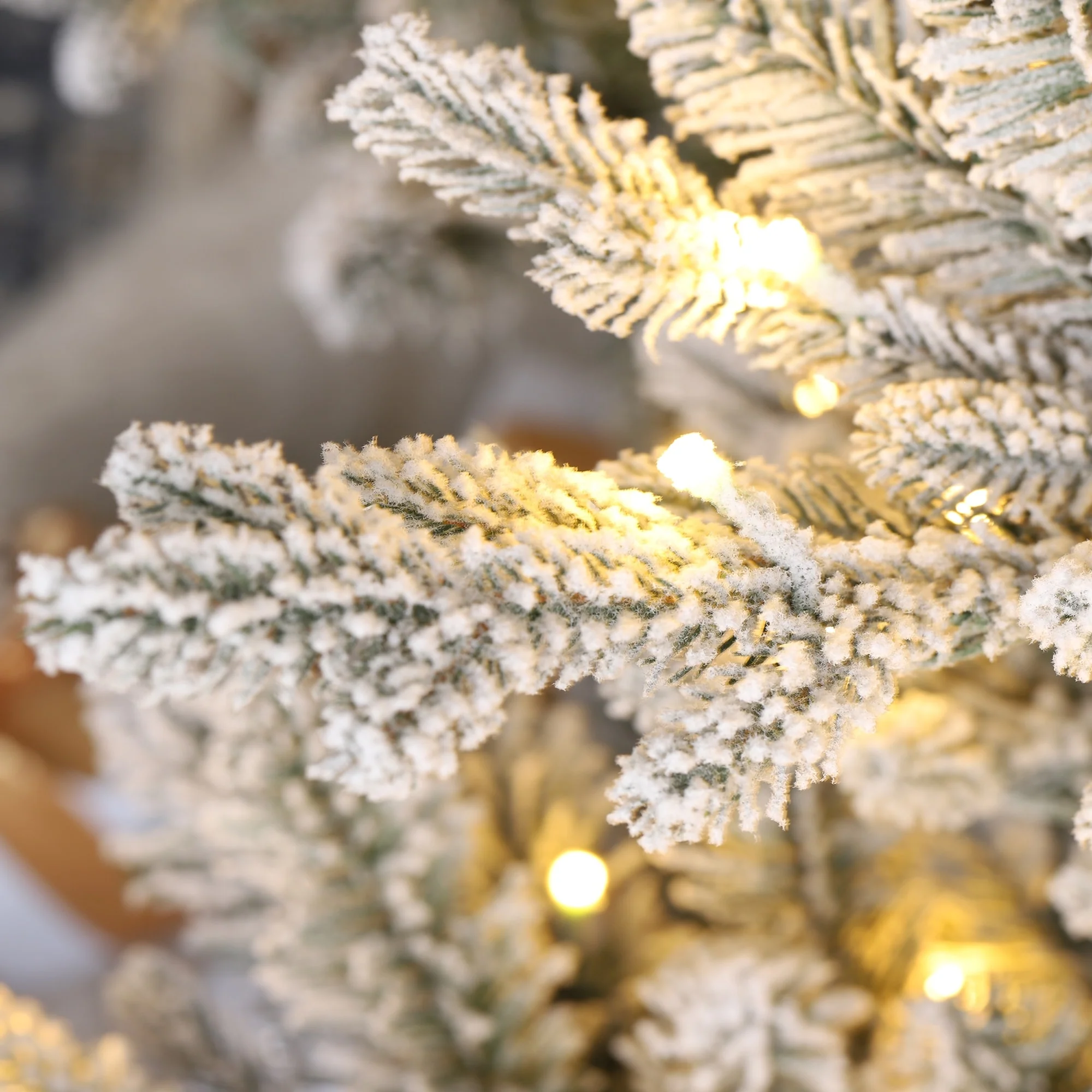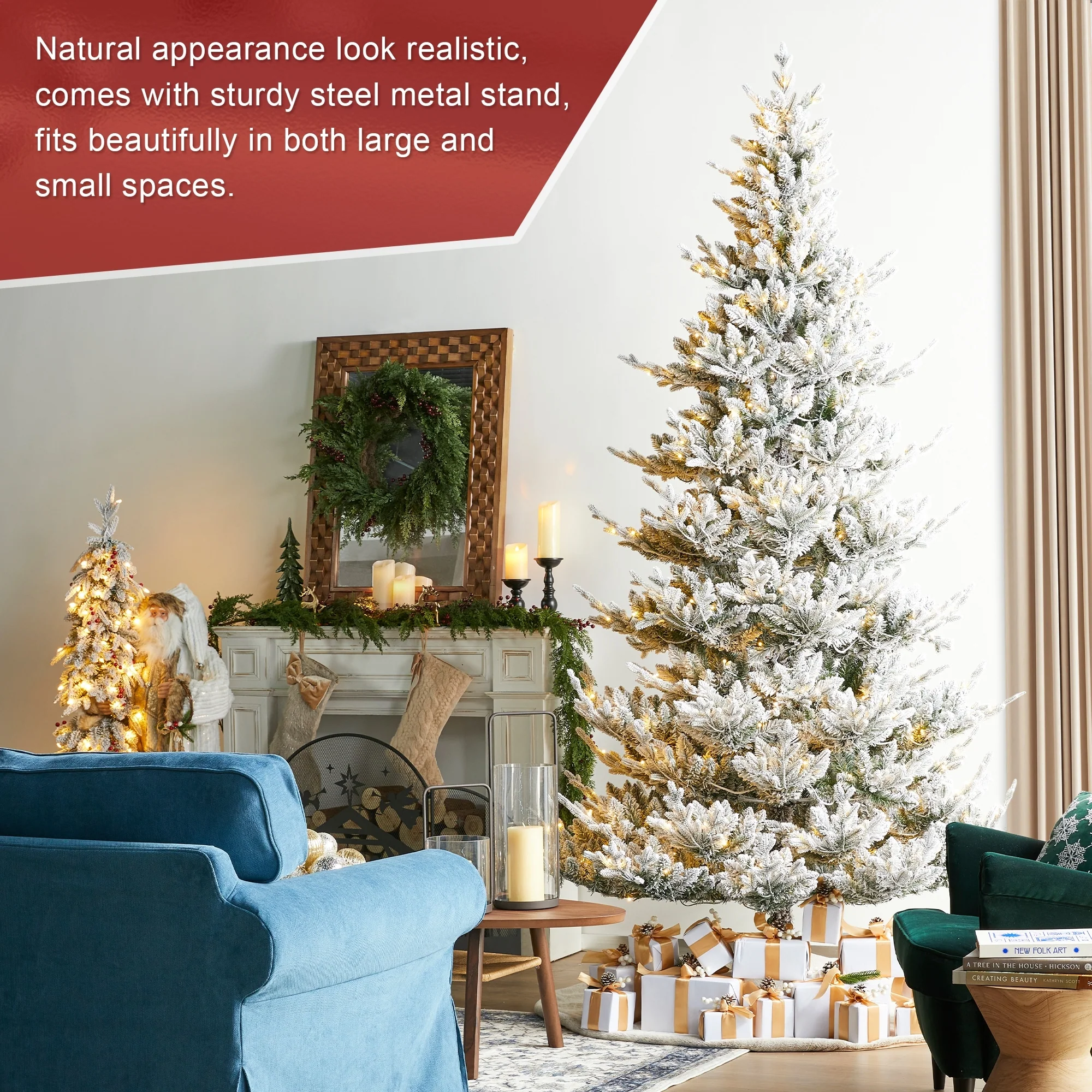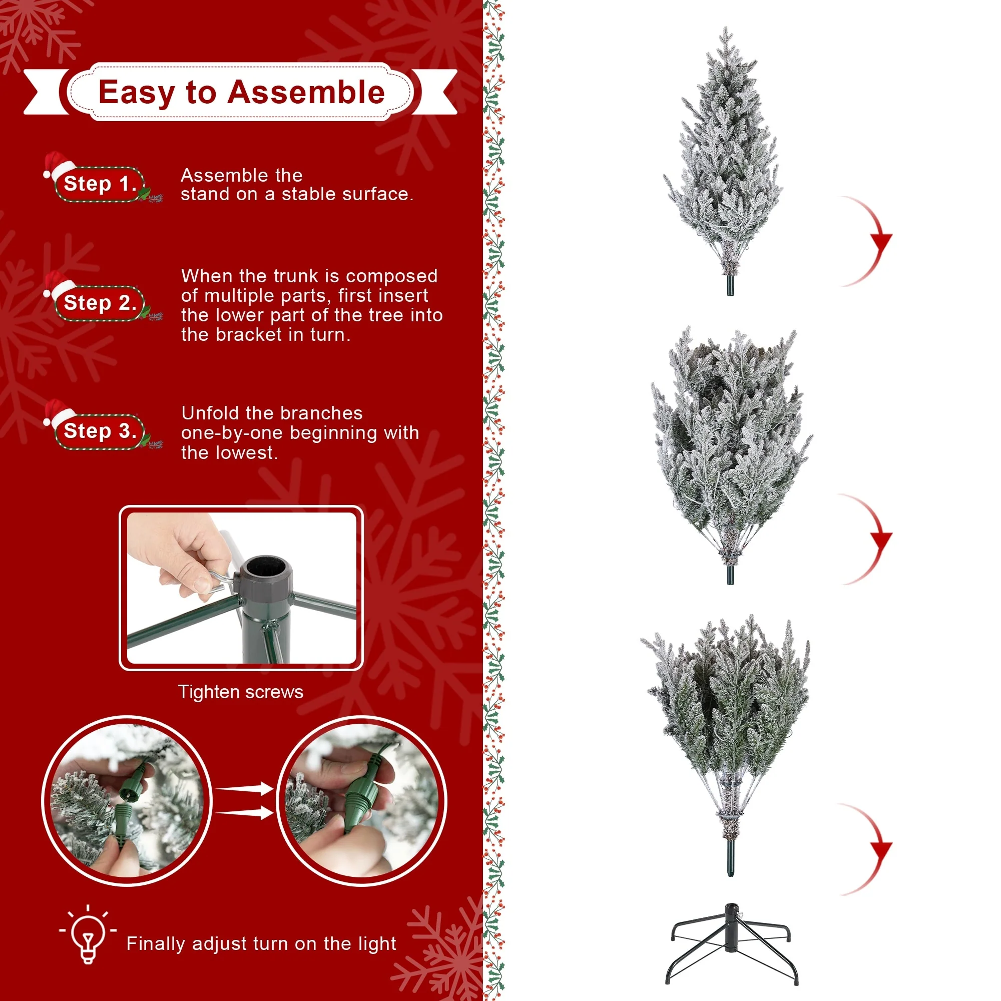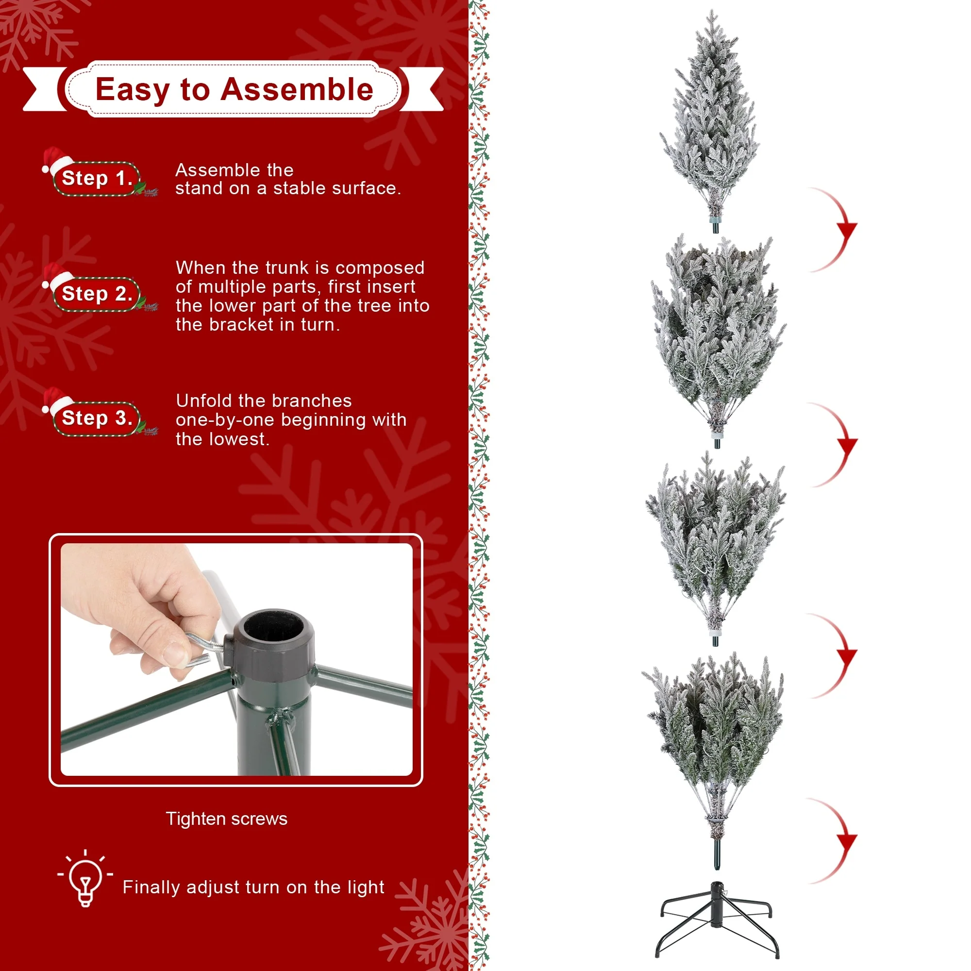 The 7.5ft/9ft Pre-Lit Flocked Upward Slim Fir Christmas Tree features a snowy, flocked design with warm white lights, creating a unique, space-saving silhouette. Its sturdy metal stand ensures stability, making it easy to set up and adding sophistication to your holiday decor.