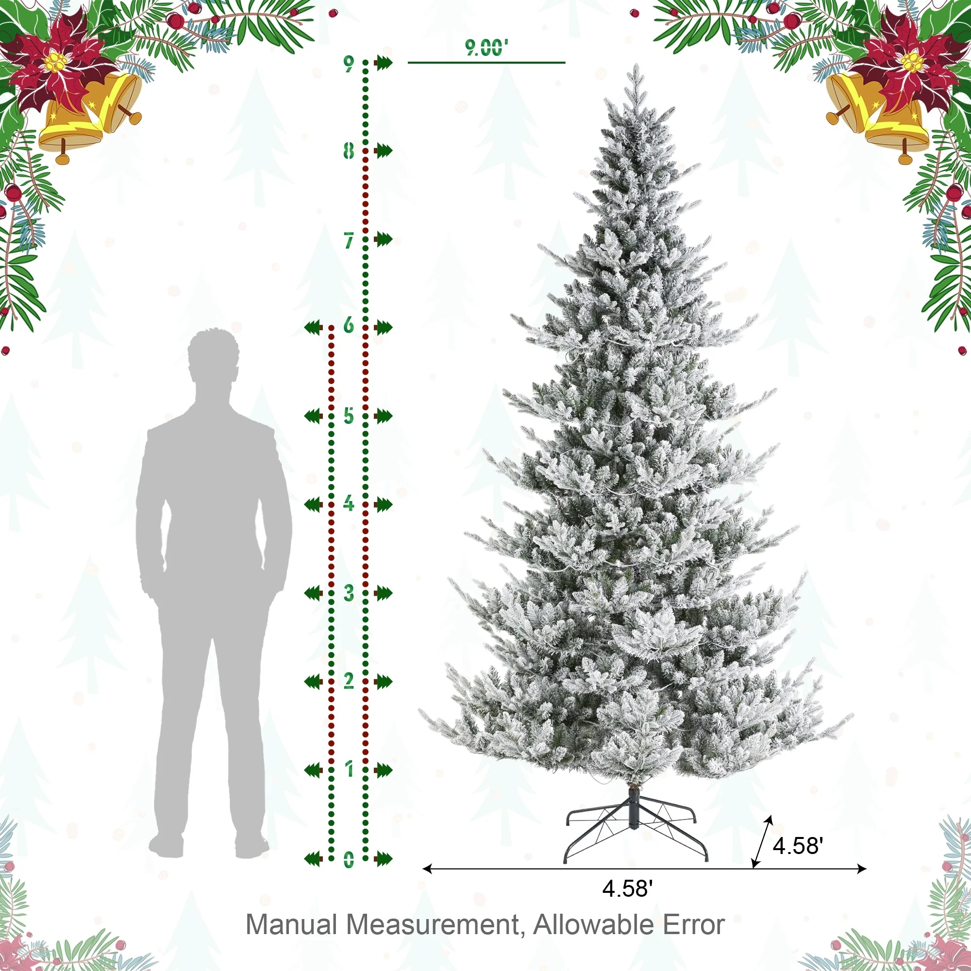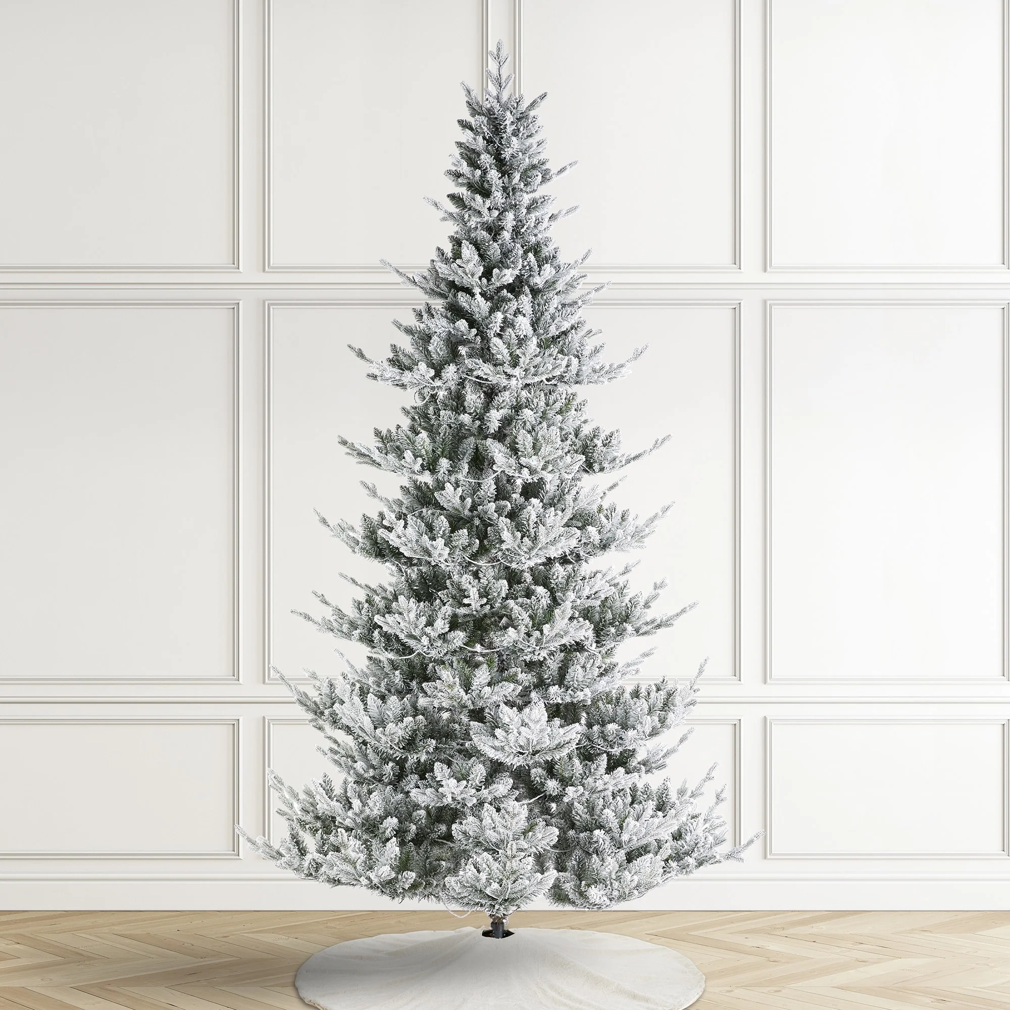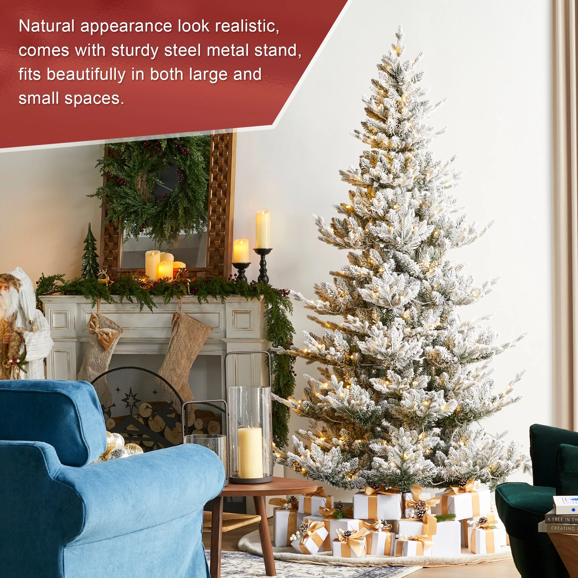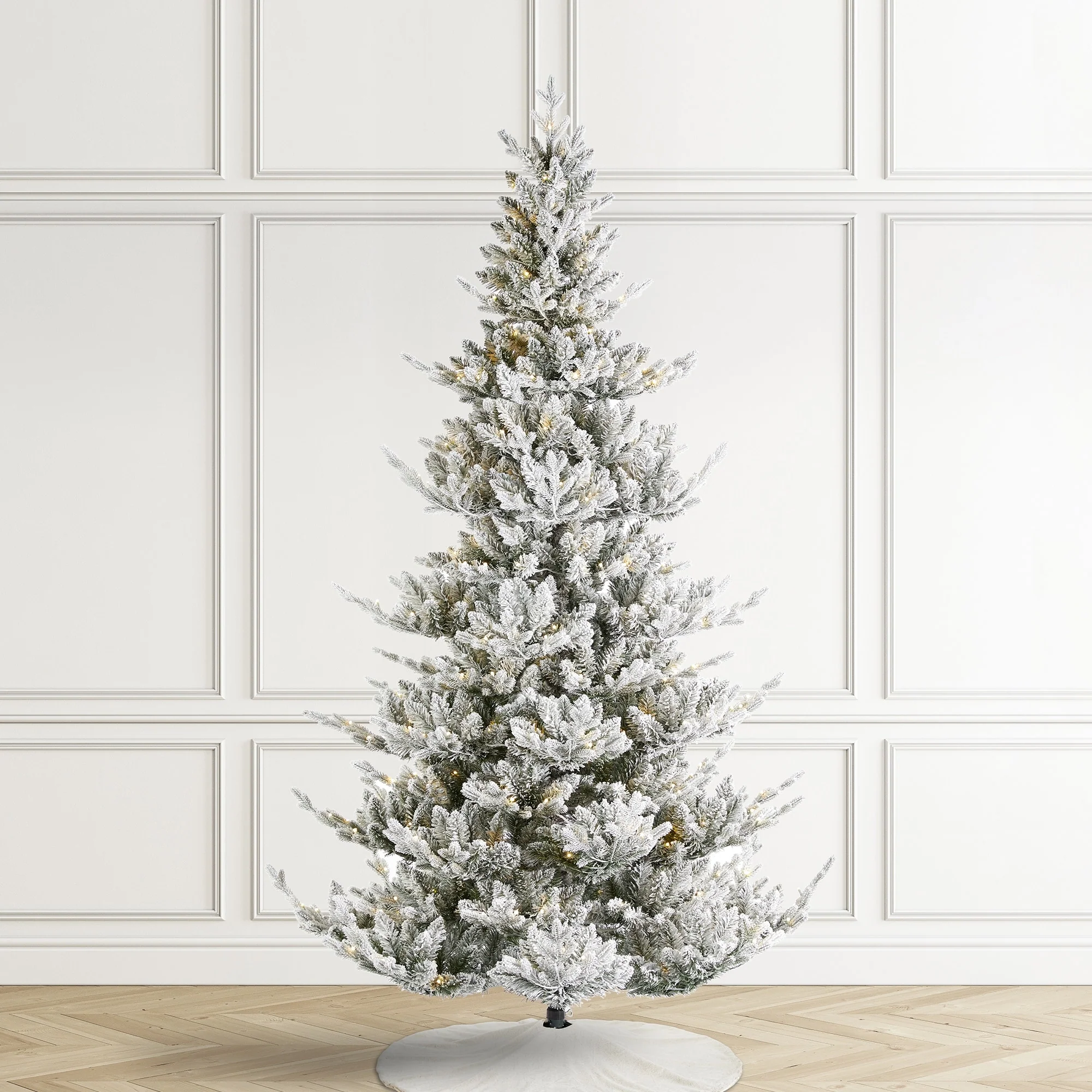 The 7.5ft/9ft Pre-Lit Flocked Upward Slim Fir Christmas Tree features a snowy, flocked design with warm white lights, creating a unique, space-saving silhouette. Its sturdy metal stand ensures stability, making it easy to set up and adding sophistication to your holiday decor.