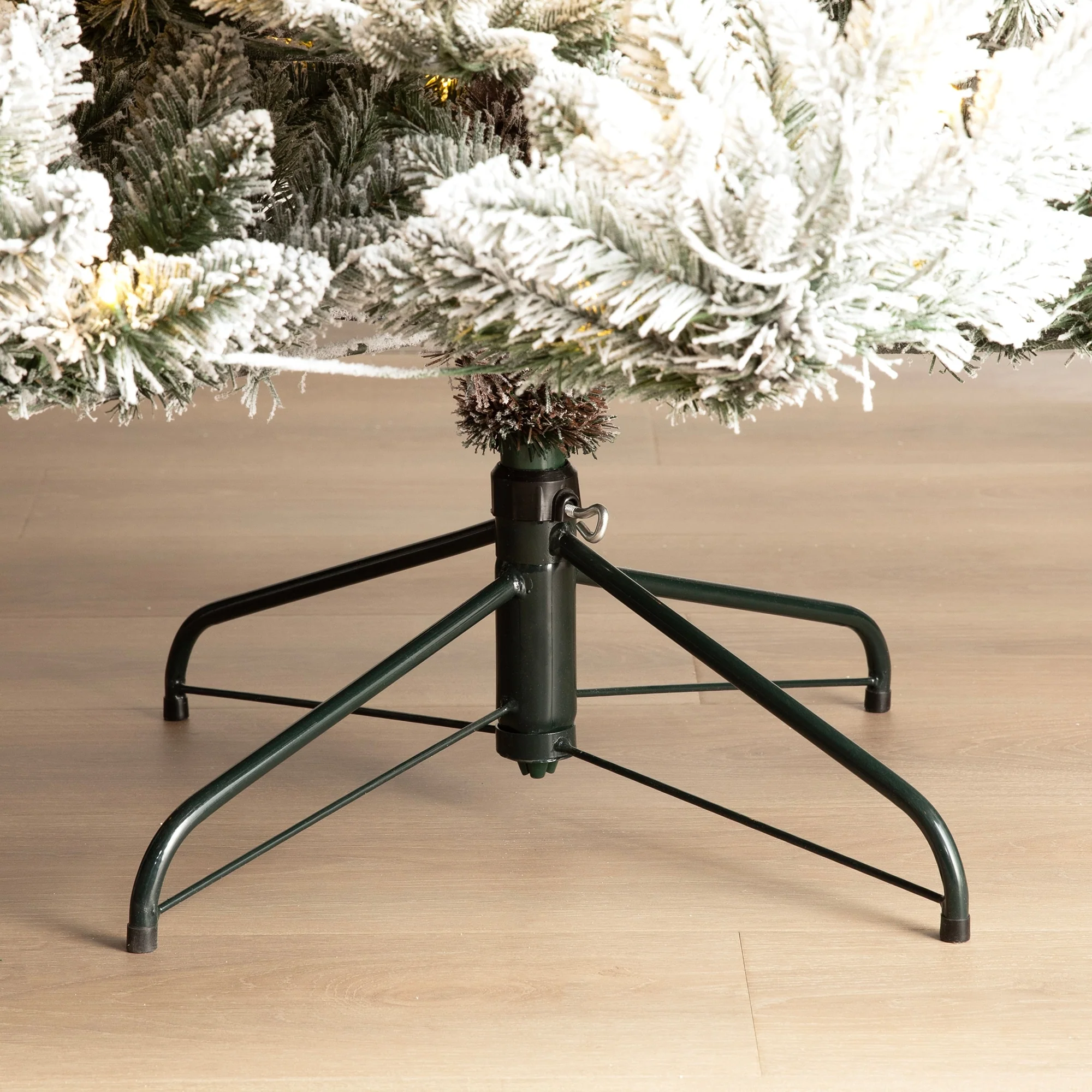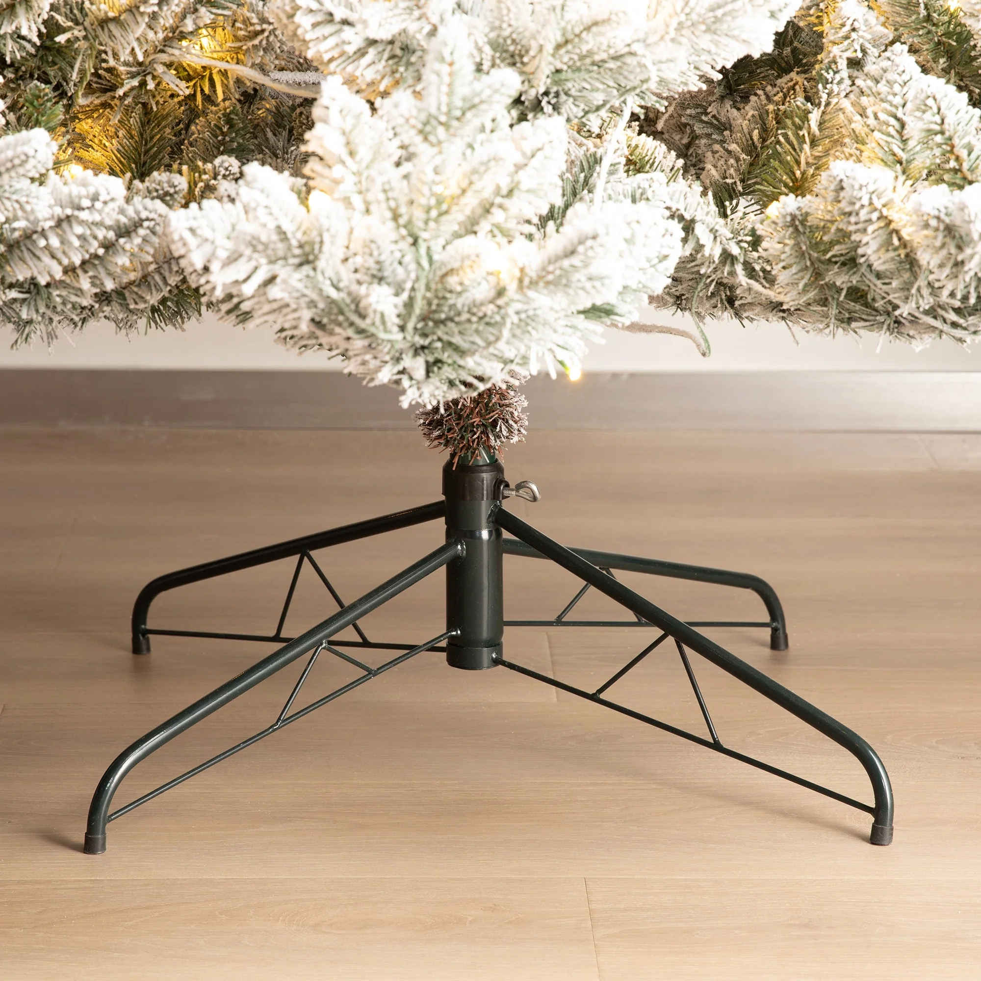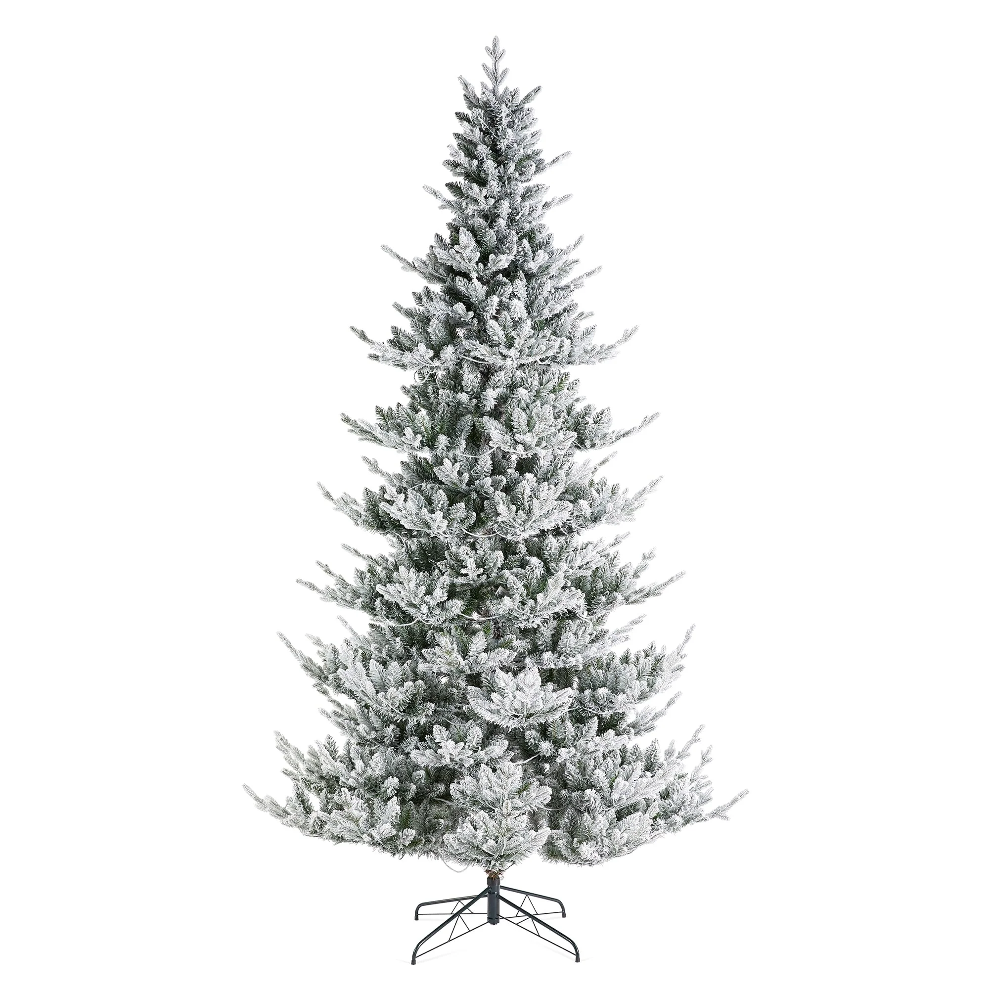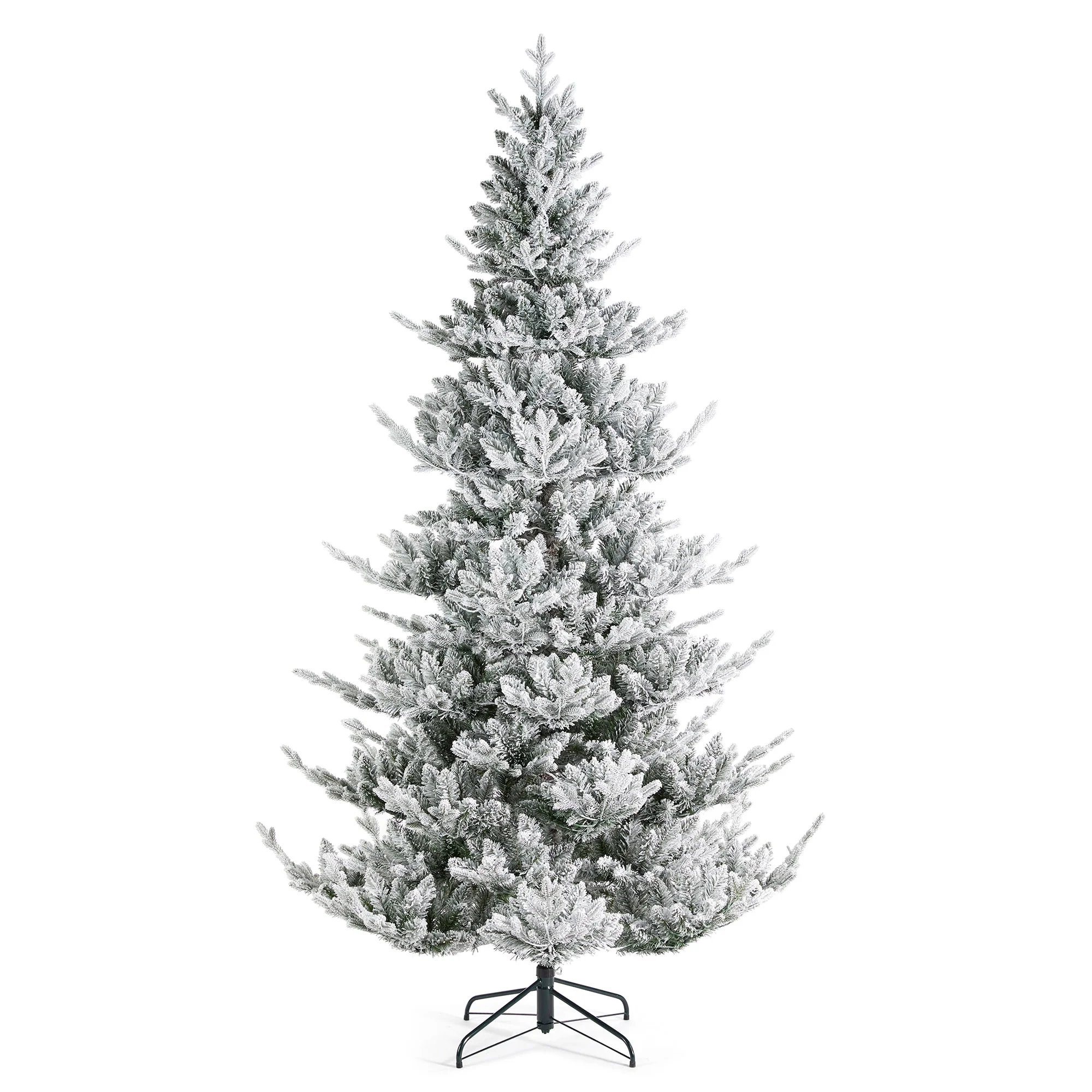 The 7.5ft/9ft Pre-Lit Flocked Upward Slim Fir Christmas Tree features a snowy, flocked design with warm white lights, creating a unique, space-saving silhouette. Its sturdy metal stand ensures stability, making it easy to set up and adding sophistication to your holiday decor.