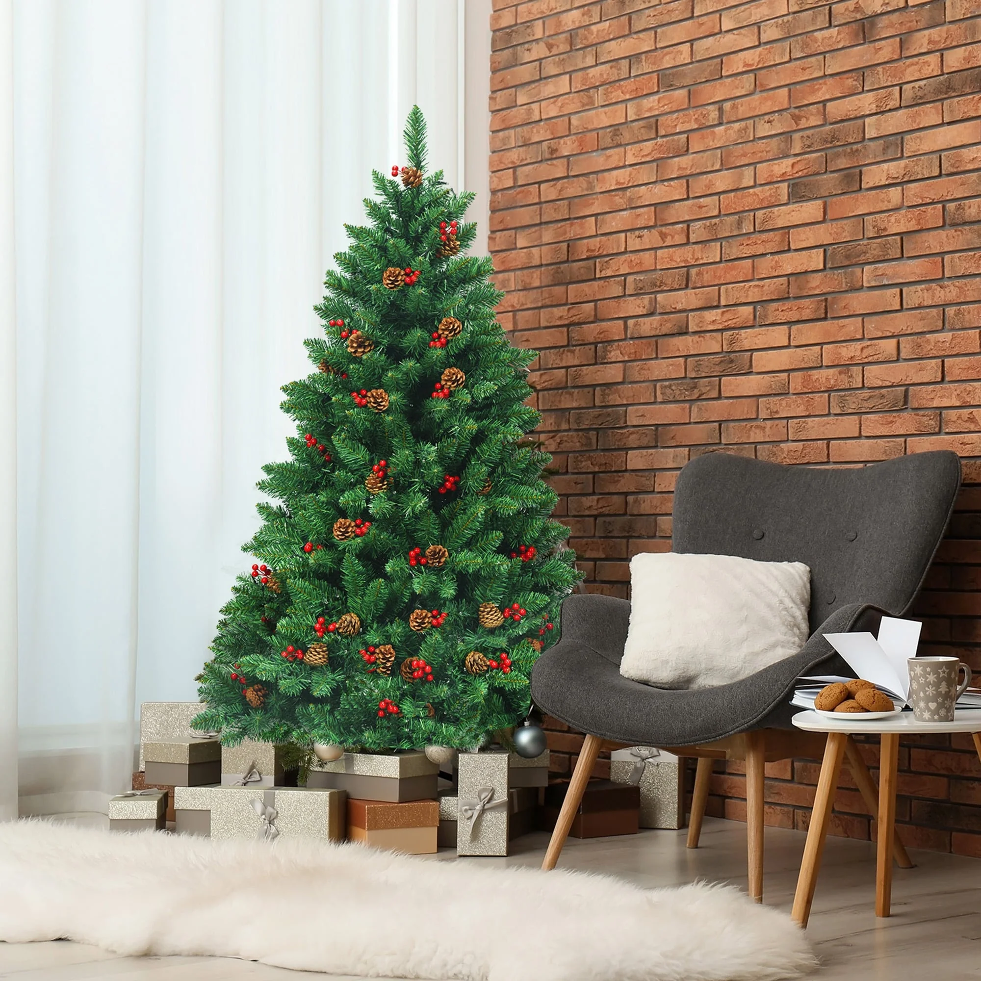 Decorate your home with our pre-lit Christmas tree to embrace the warm festival feeling!This 4.5 ft artificial tree is designed with hinged structure to make the assembly easy. You can feel the coming of the festival quickly. Made of odorless PVC material, the tree is safe and non-flammable for a long lifespan. Sturdy metal stand will offer good support to keep the tree upright. 300 warm white LED lights can save your time to set up electric lines. Moreover, it is equipped with 516 branch tips and 32 groups of pine cones and red berries to offer you a full and realistic look. It will be an eye-catcher instantly in any setting.