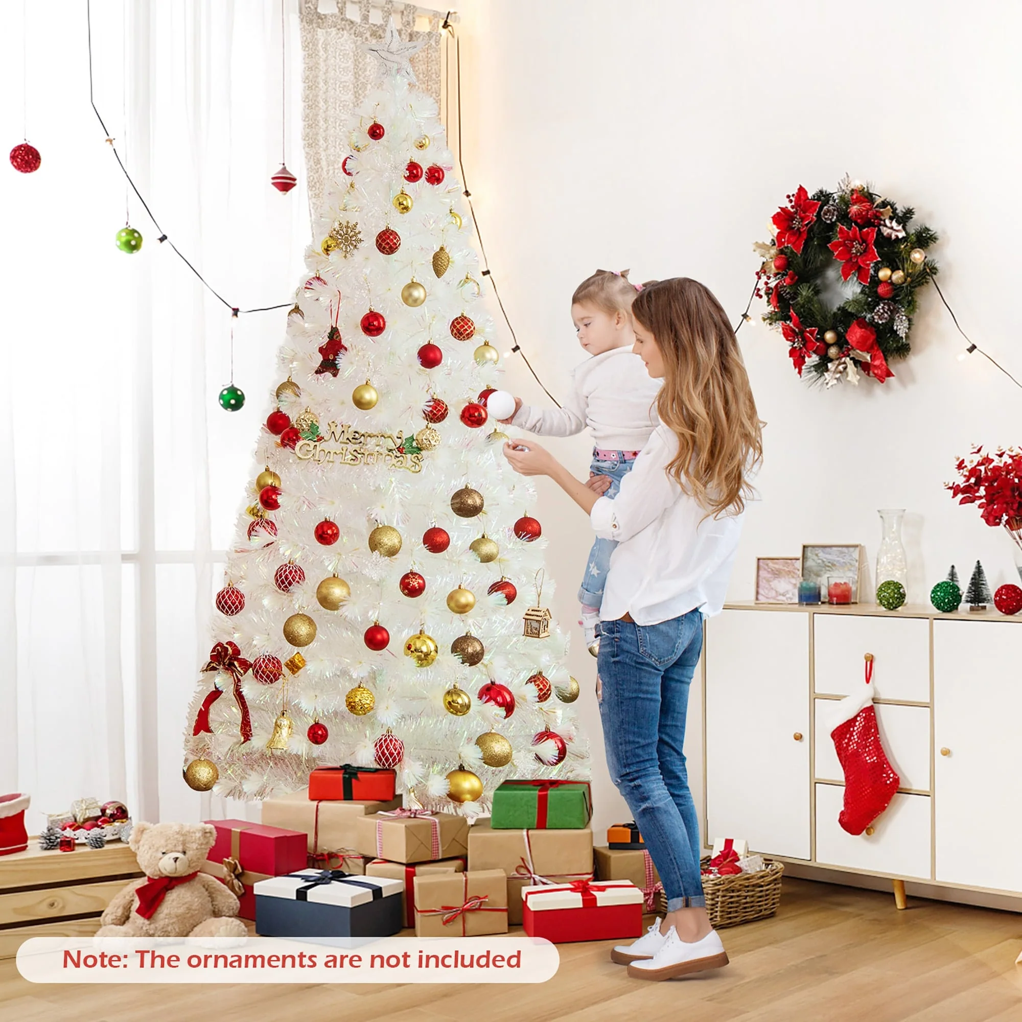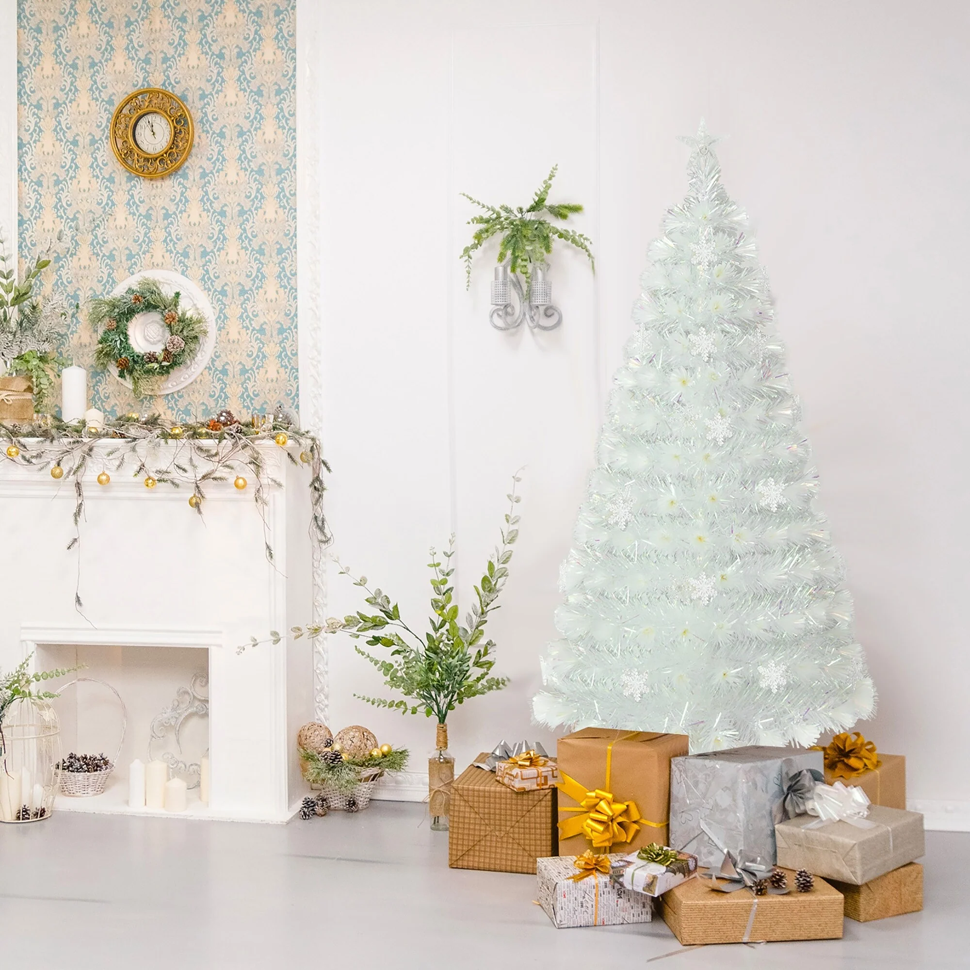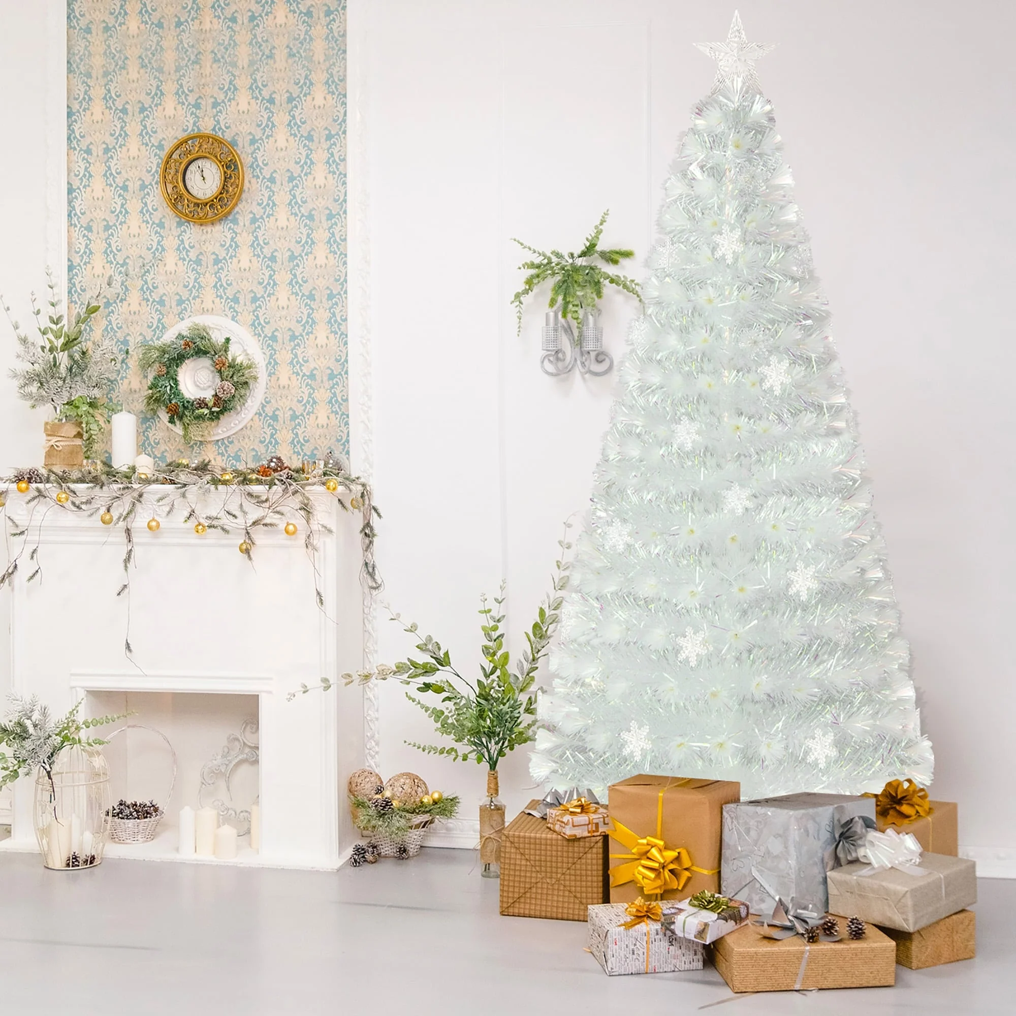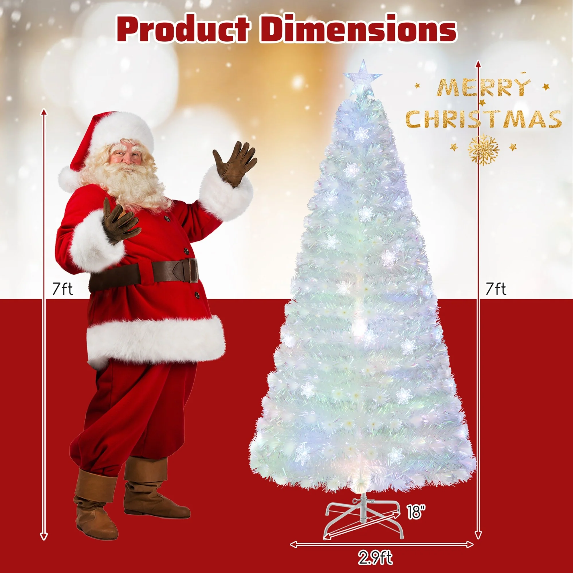 Bring You and Your Family the Best Christmas Experience!Create a magical Christmas atmosphere with our exquisite white pre-lit fiber optic Christmas tree. This gorgeous full-white Christmas tree features 170/220/270 lush branch tips and shimmering iridescent leaves, offering a captivating visual appeal. And with its multi-color snowflake LED lights, top multi-color star light, and shining optical fibers, this lighted Xmas tree offers a mesmerizing display of festive illumination. Crafted from high-quality material, it ensures durability and a touch of elegance to your festive display. And it comes with a crossed metal base, keeping the tree upright and preventing breakage.