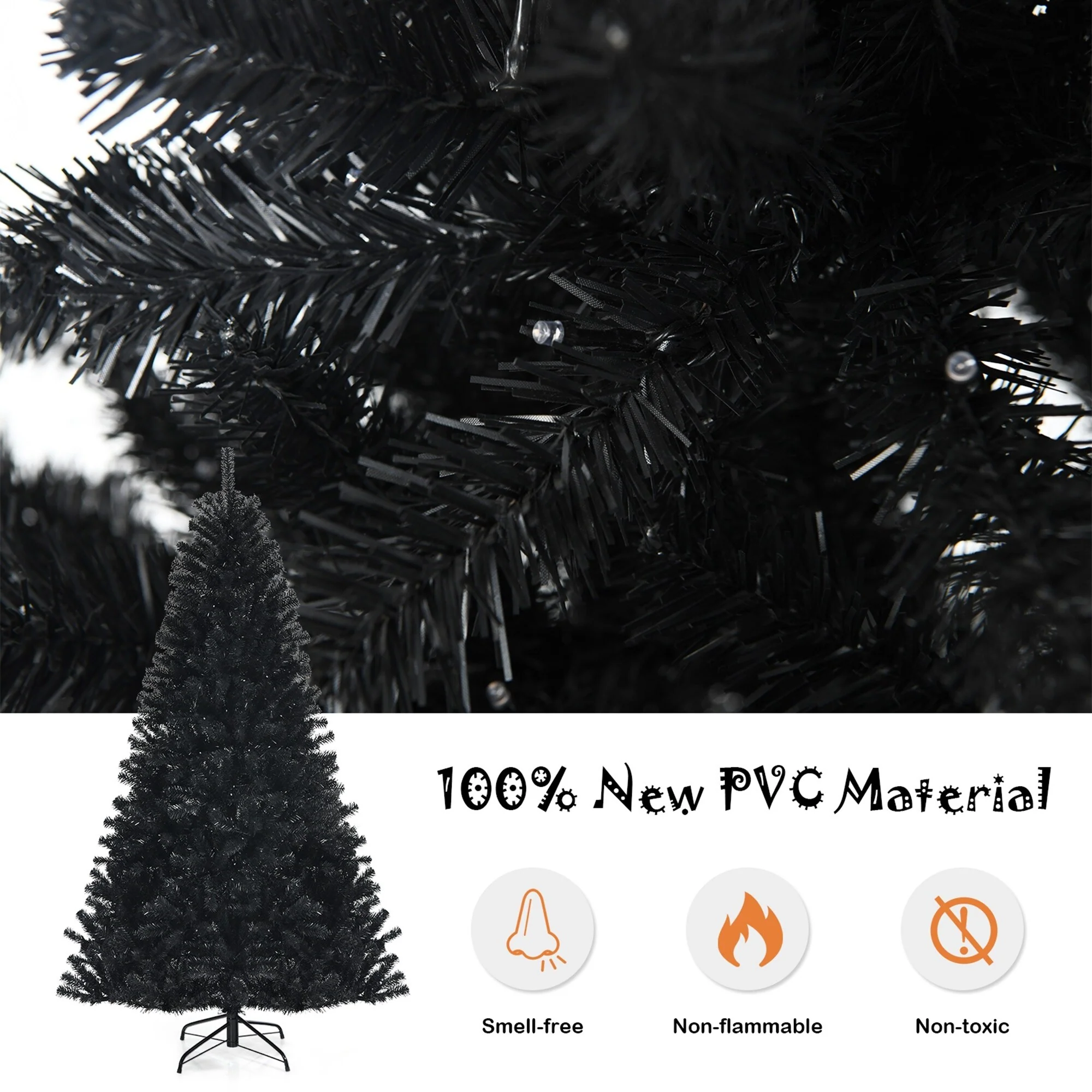 Stand at 7ft tall, this black artificial tree will attract all people's attention immediately when they get in the room. The full-bodied decoration tree provides you with ample space, where your DIY desire can be fully satisfied. With 1096 individually crafted branch tips, the full-bodied tree looks as natural as a real tree, providing you with excellent using experience. Turn on the 500 purple LED lights to create spooky and mysterious atmosphere at home! Our Halloween tree not only performs well in appearance, but also in quality. All branch tips are made of 100% new PVC to ensure its outstanding characteristics. You will like this odorless, non-toxic and recyclable tree. May you happy Christmas and Halloween!