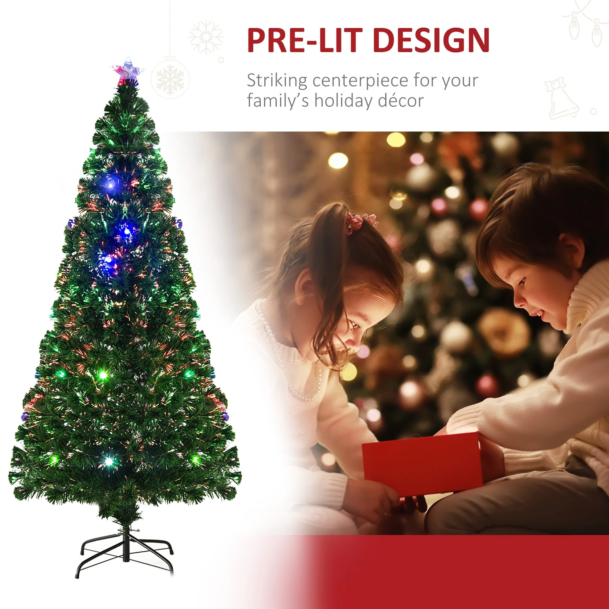 This holiday season, spend more time celebrating and less time maintaining/cleaning with a HOMCOM six-foot tall pre-lit, artificial Christmas tree. With this model, you get built-in fiber optics and LED lights that change colors and complement each other in a beautiful sparkling display to give off an authentic holiday feel. Each branch twinkles with seven beautiful colors in pre-set patterns to create a striking lighting display to really make this tree the centerpiece of the holiday.