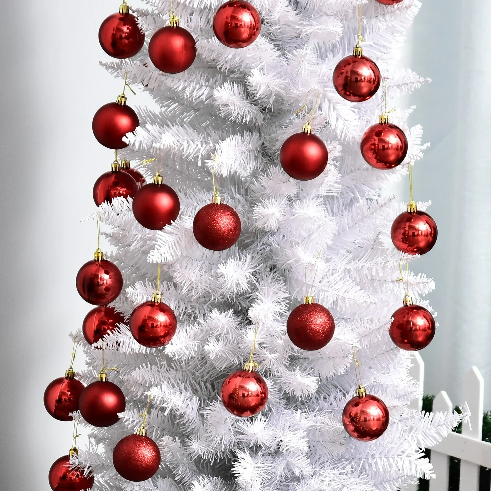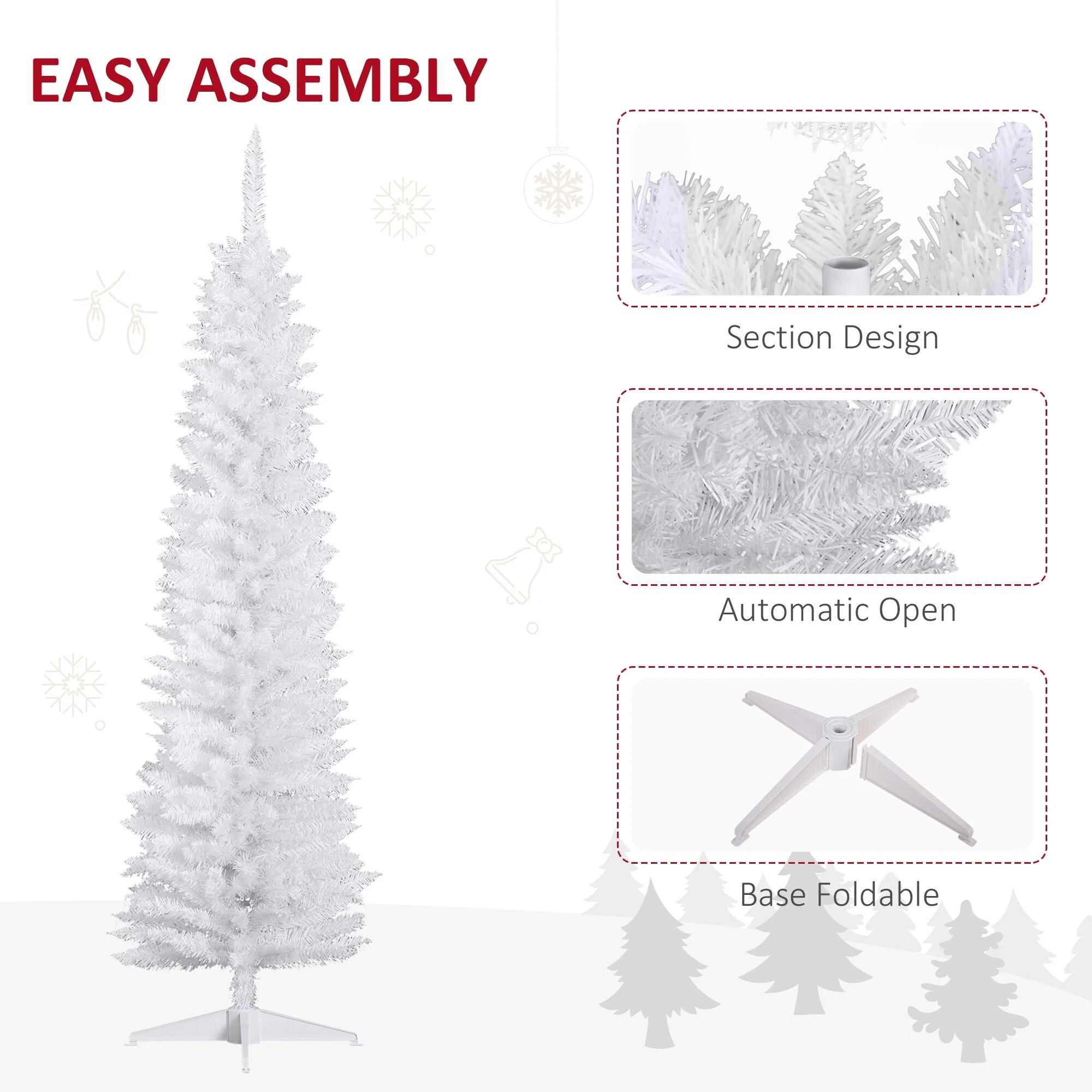 This skinny Christmas tree fits easily in rooms with limited extra space. Open up the house or apartment with a smaller design. Themed with a white Christmas, the snow-colored branches add brightness to the room, while letting colorful ornaments pop. The hinged design makes assembly and disassembly trouble-free for saving time and effort. A foldable base allows limited closet space to accommodate it, with a high-stability and durable construction to keep the 6 ft. pine standing strong.