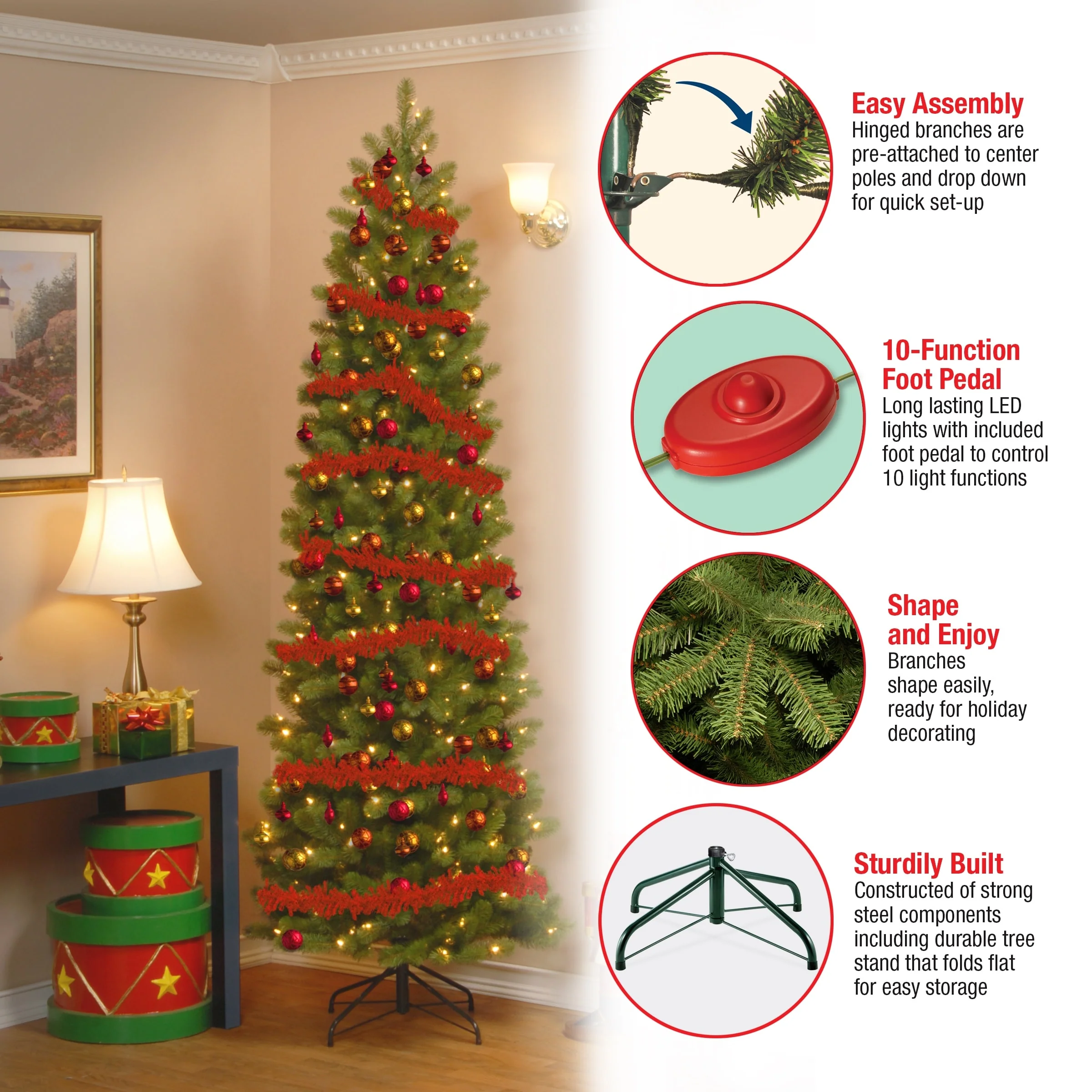 This Downswept Douglas Pencil Slim tree features Feel Real® branch tip technology, creating a tree with remarkable realism. These crush-resistant branch tips are molded from real tree branches for an authentic living tree appearance. This tree is pre-strung with 300 Dual Color lights that change from warm white to multicolor with the touch of a button. The bulbs are low voltage LEDs that are energy-efficient and long lasting. Included is a foot pedal switch to control 9 different light colors and actions. This slim profile allows for display in corners or limited space areas. Hinged branch construction makes assembly quick and easy.