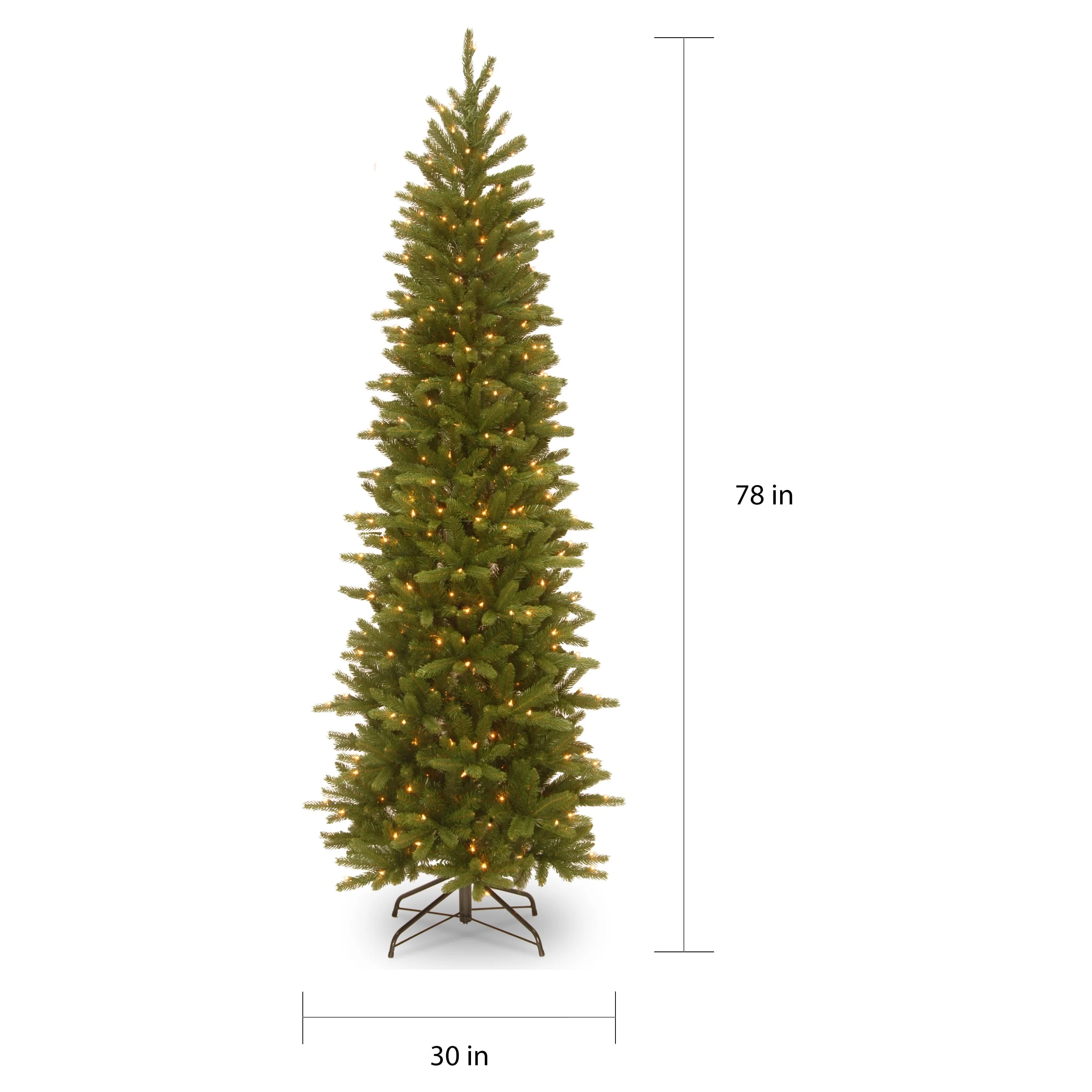Show your Christmas spirit with this 6.5 ft. Grand Fir Pencil Slim Tree. These crush-resistant branch tips are molded from real tree branches for an authentic living tree appearance. This slim profile tree, pre-strung with 250 clear lights, is great for display in corners or areas with limited floor space. Three section construction and hinged branches add to ease of assembly.
