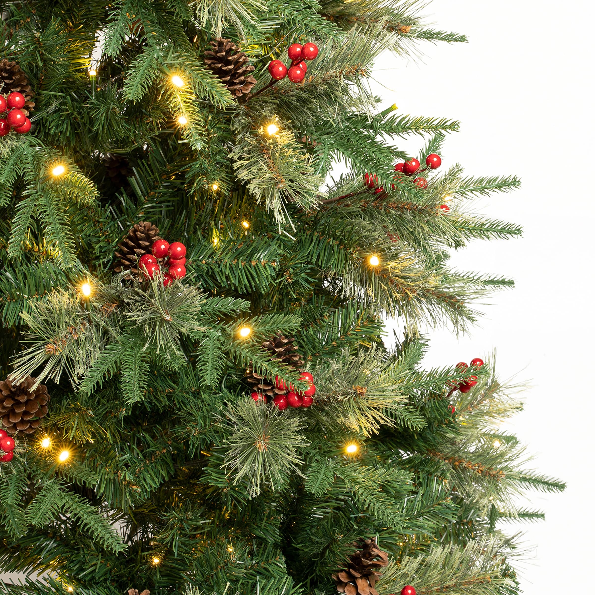 The Virginia Pine tree features Feel Real® branch tip technology, creating a tree with remarkable realism. Branches are a mixture of evergreen and bristle tips and are trimmed with red berries and pinecones. It is pre-strung with 200 warm white LED lights that are energy-efficient and long lasting. This tree offers a slimmer profile than trees of similar height making it a great choice for display in corners or in areas where floor space is limited. Two section construction and hinged branches add to ease of assembly. Sturdy folding metal tree stand is included.