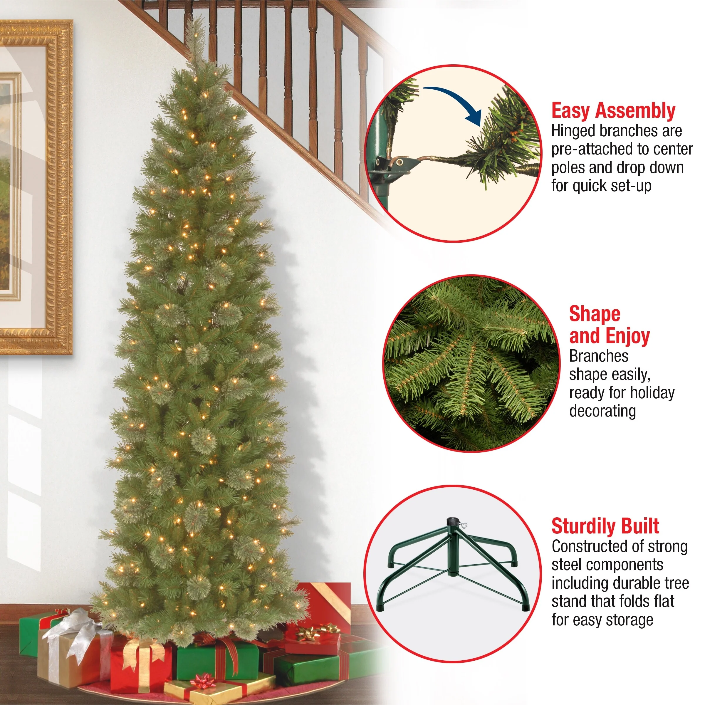 - All metal hinged construction ( branches are attached to center pole sections)