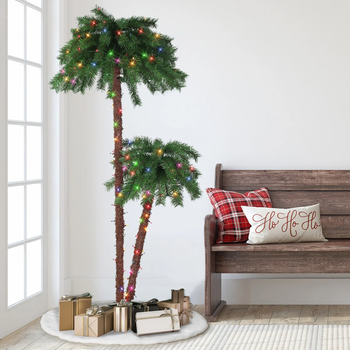 Bring your vision of a tropical paradise to life with the Puleo International Pre-Lit Artificial Double Trunk Palm Tree with 175 Multi-Color LED Lights. No matter where you live, you'll always feel like you're having fun in the sun with this 6 ft & 3.5 ft Double Trunk Palm Tree. Get the party started and display this decorative indoor or outdoor tree in your lawn, on your patio, poolside, or even inside your home or walkways as a fun tropical twist on a classic Christmas tree. Featuring 105 branch tips and a 3.5-foot second trunk extension for a full and realistic effect, you'll be fully convinced that you're on the sandy shores of the beach from the comfort of your own home. Lit with 175 pre-attached Multi-Color LED lights. With a perfectly balanced base made of durable materials including resin and MGO2, you can enjoy your festivities knowing that this tree is both sturdy and flame-retardant. This product is backed by a one-year warranty on the tree.