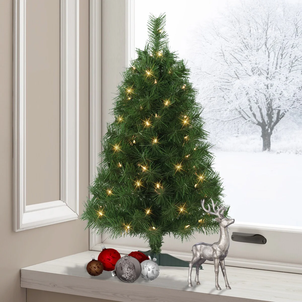- 3' PRE-LIT ARTIFICIAL FIR TREE: Features verdant green pine needles and an elegant conical shape that perfectly capture the ambiance of the wintry forests in your home