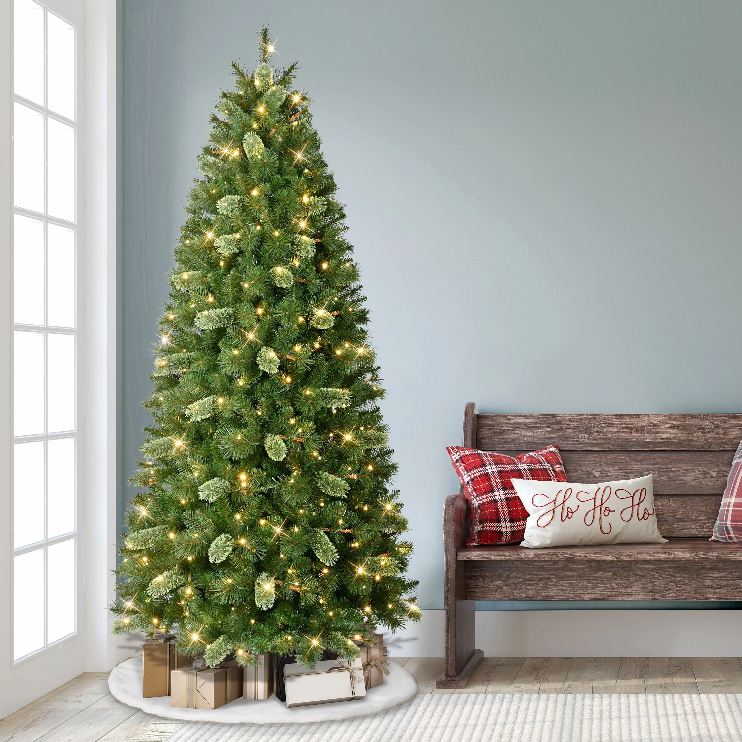 - 7.5 ft. PRE-LIT ARTIFICIAL SLIM TETON PINE TREE: Features 350 LED warm white lights that create a cozy, inviting holiday glow