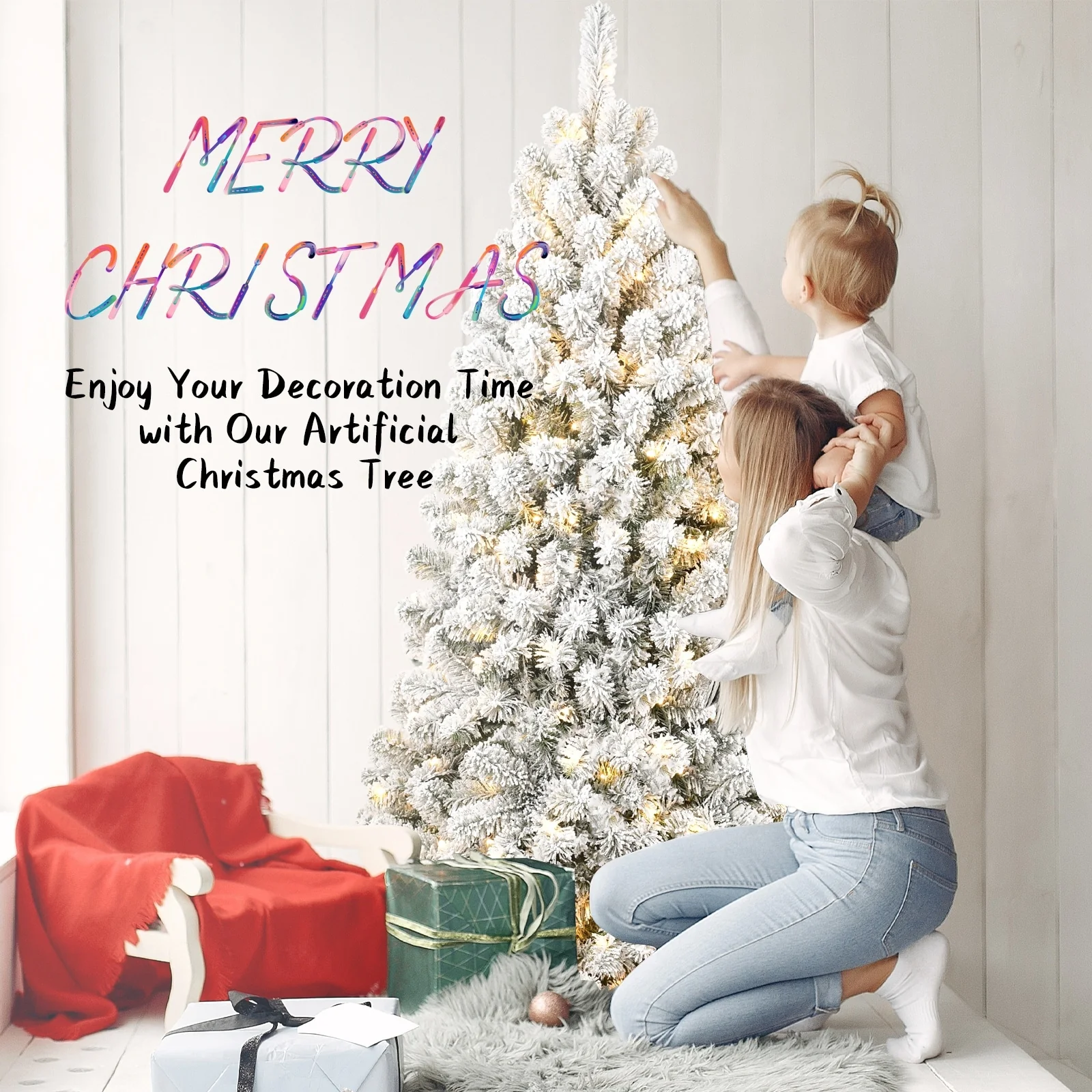 This 5ft pre-lit flocked Christmas tree with memory wire technology offers a quick and elegant solution to holiday decorating. With 200 warm incandescent lights and 498 PVC tips, this tree effortlessly unfolds into a full, lifelike display, perfect for creating a festive atmosphere in any room.