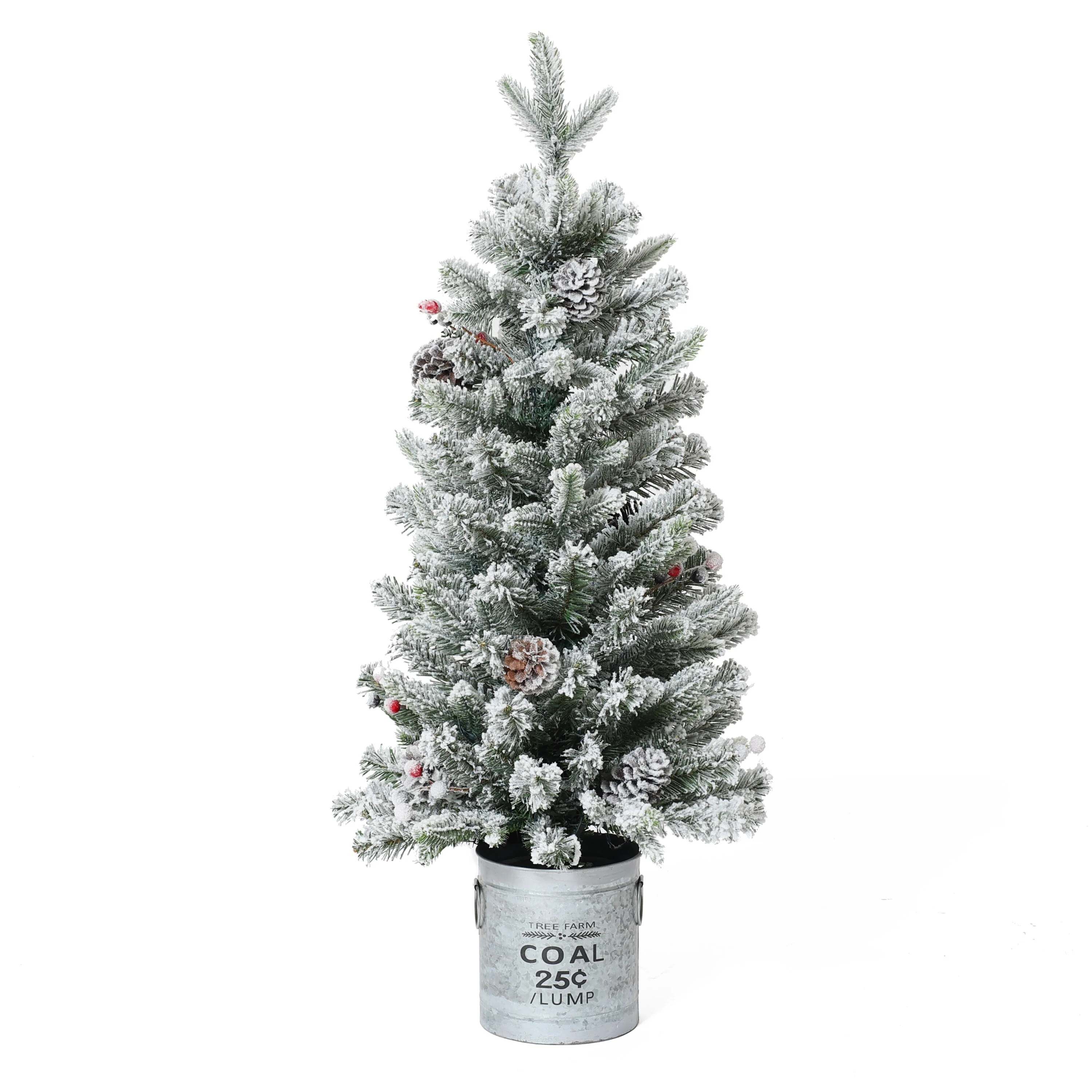 Snow-Flocked Artificial Christmas Tree with Pinecones and Berry Decorations in Metal Pot, Battery Op Lights with Timer