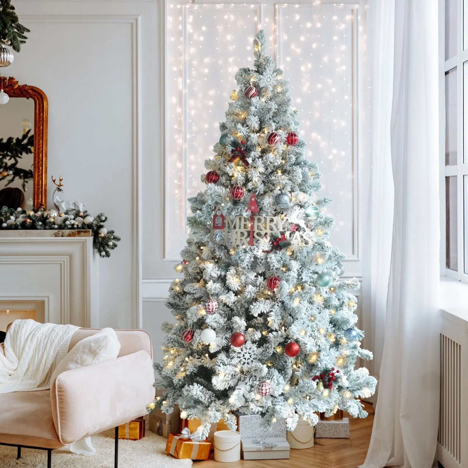 Bring the winter wonderland into your home with the Lighted Flocked Christmas Tree! Fluffing the flocked Christmas pine tree may take 30 or 45 minutes the first time, but when fully shaped, for a splendid display. Feel free to add more decorations to this pre-lit flocked Christmas tree! This snow flocked Christmas tree with lights is ideal for any setting such as home, courtyard, or commercial places like shops and hotels for years to transfer coziness and happiness through the whole holidays.