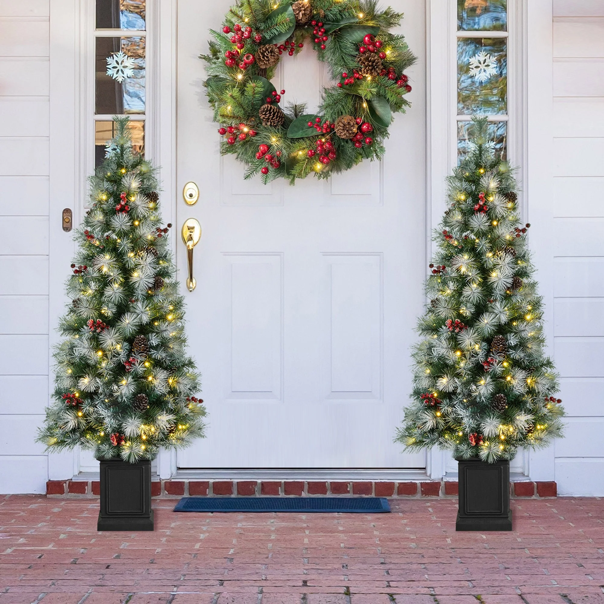 Pre-Lit 4-Piece Holiday Christmas Set - Entrance Trees, Garland, and Wreath with 340 Warm LEDs