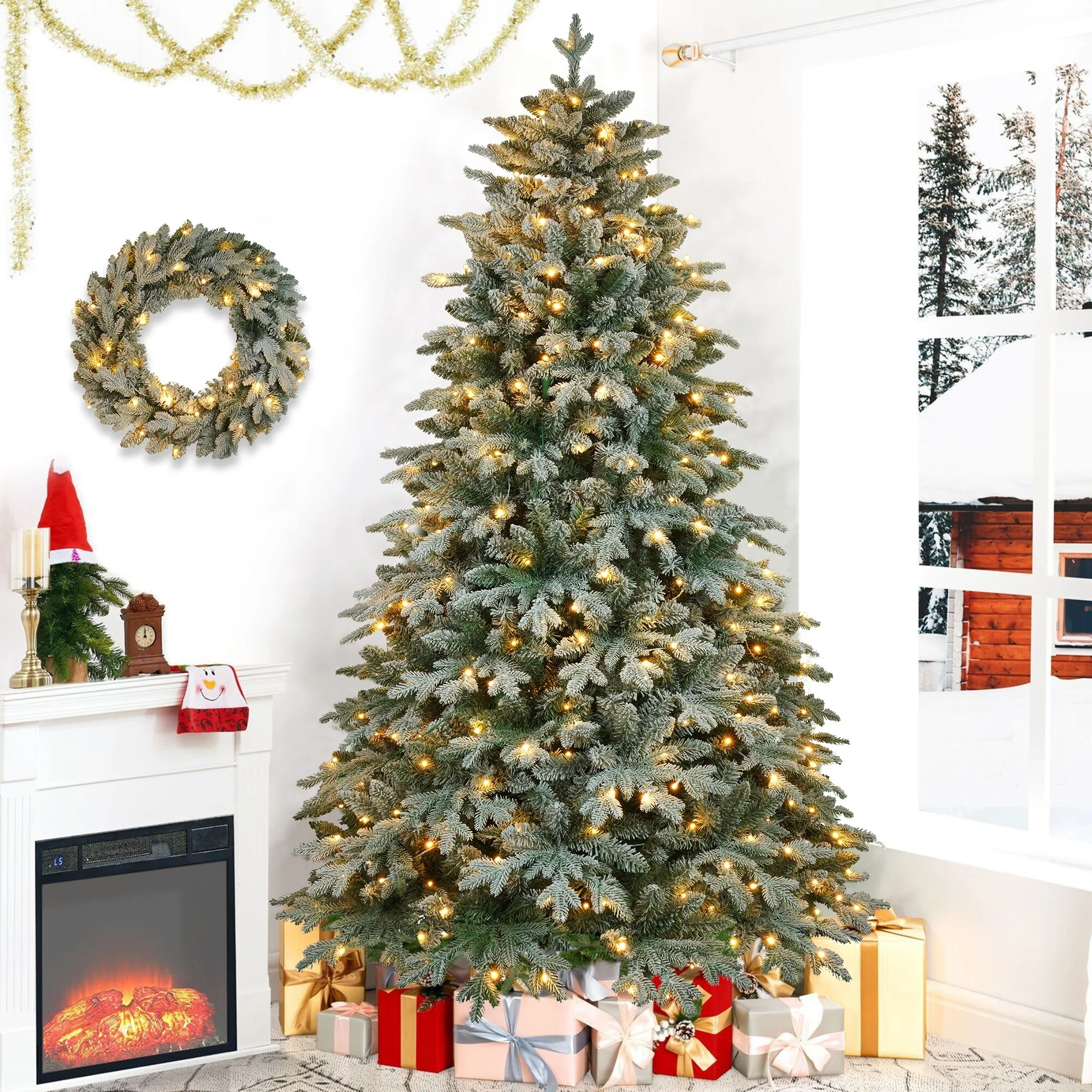7ft Christmas Tree & Wreath Set with 380 LED Lights, 1300 Tips, Ideal for Holiday Decorations & Creative Christmas Setup