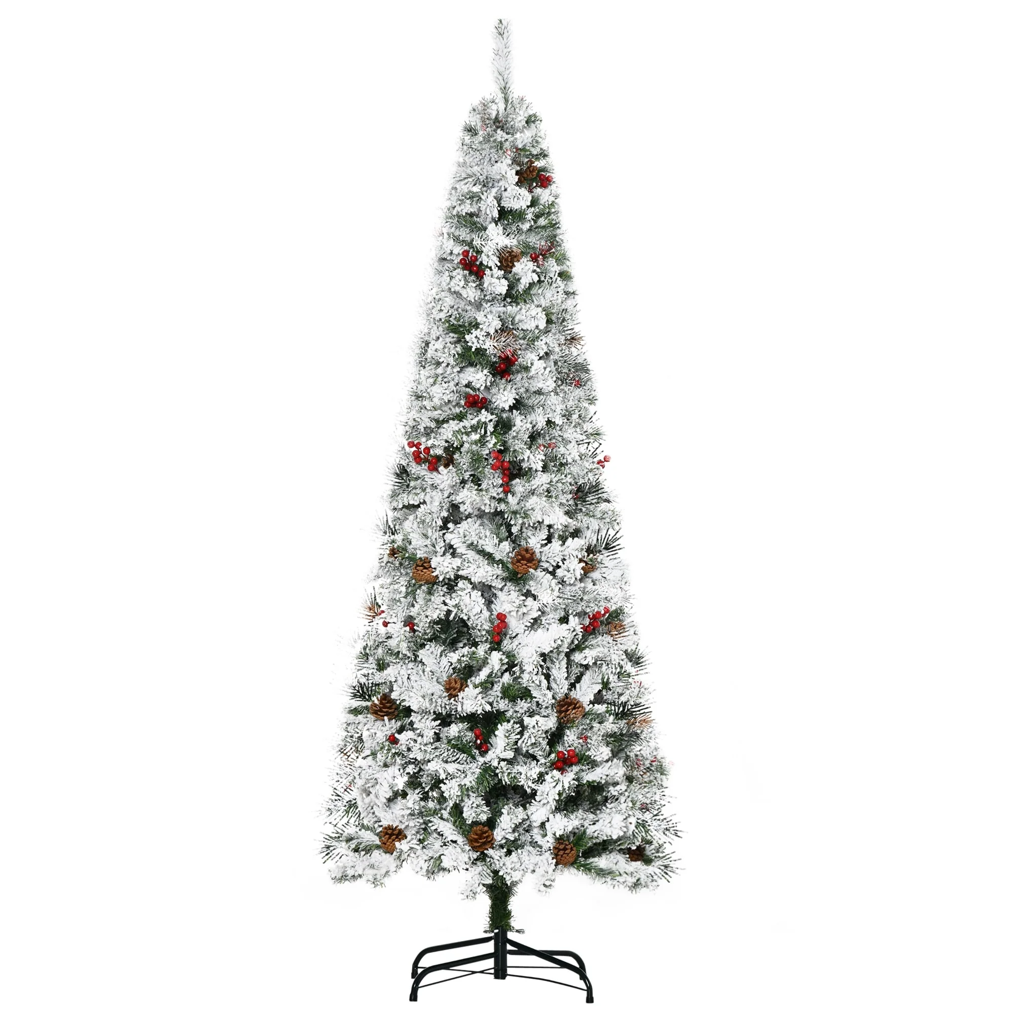 9ft Snow Flocked Slim Pencil Christmas Tree with Pine Cones, Red Berries, and Realistic Branches