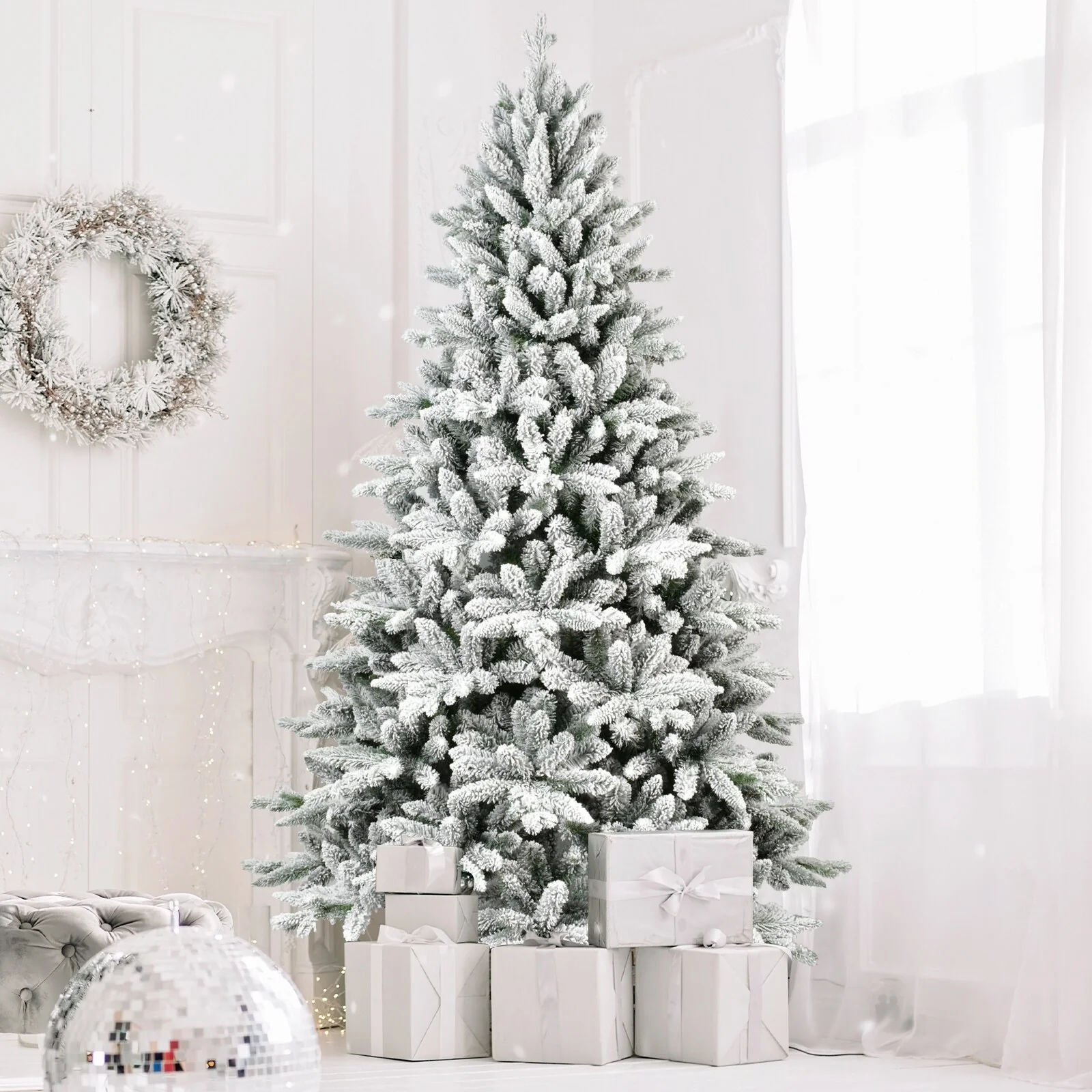 7ft Frosted Pre-Decorated Scotch Pine Christmas Tree with 1,348 Branch Tips, Easy Setup & Stable Metal Stand