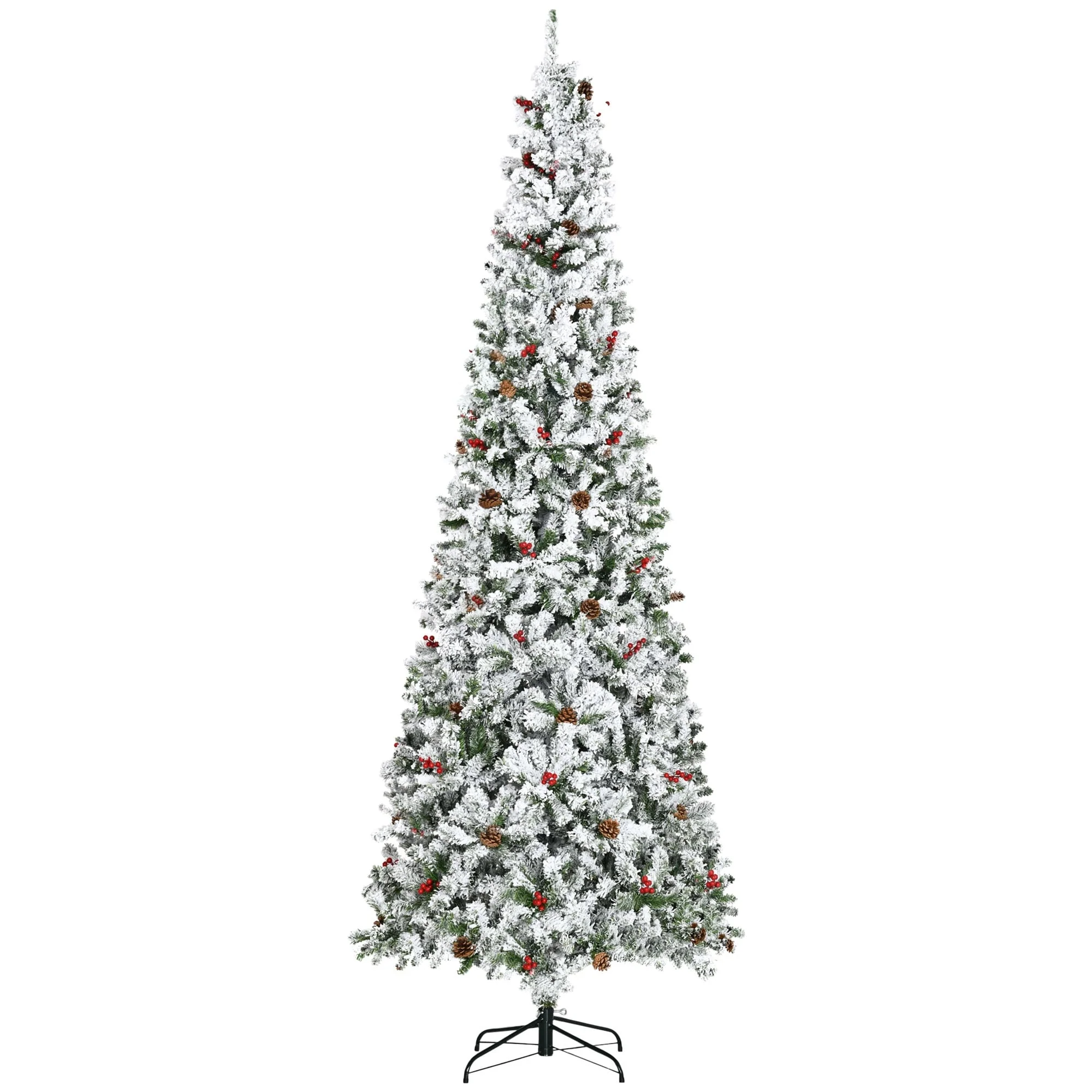9' Tall Snow Flocked Artificial Pencil Christmas Tree with Pine Cones, Red Berries, and Auto-Open Branches