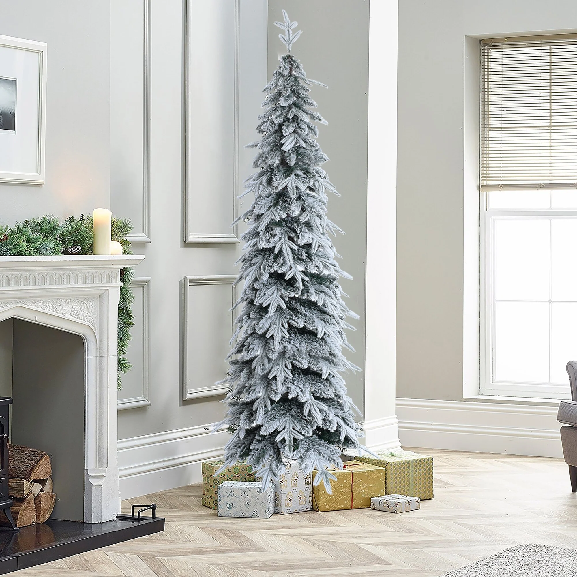 6.8Ft Pencil Slim Artificial Snow-Flocked Christmas Tree - 82.8" H x 33.5" W x 33.5" D