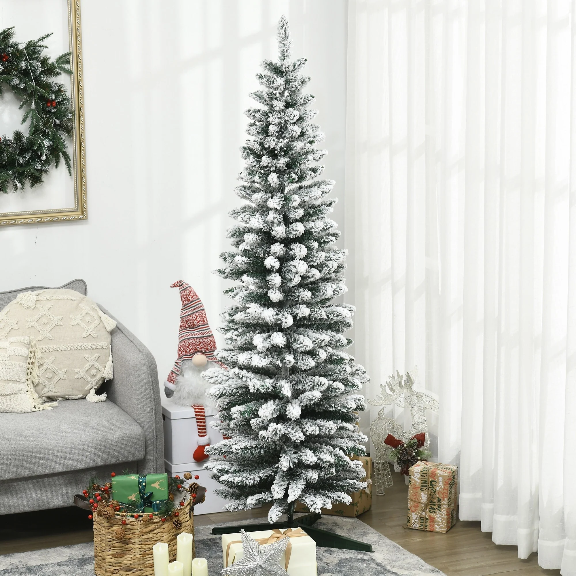 HOMCOM 7ft Tall Prelit Pencil Artificial Christmas Tree Holiday Décor with 534 Snow Flocked Branches, Downswept Shape - 6.89 ft