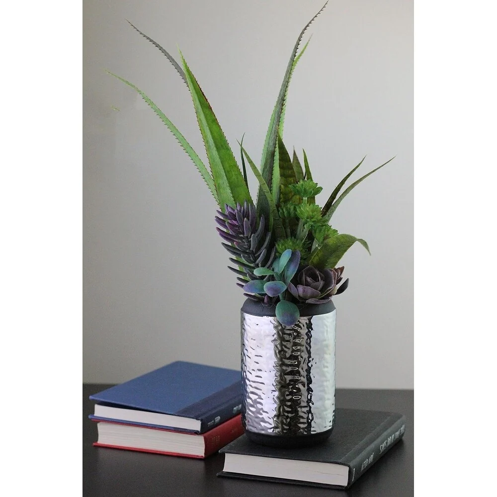 Extremely realistic plants are nestled in a silver hammered finish ceramic pot