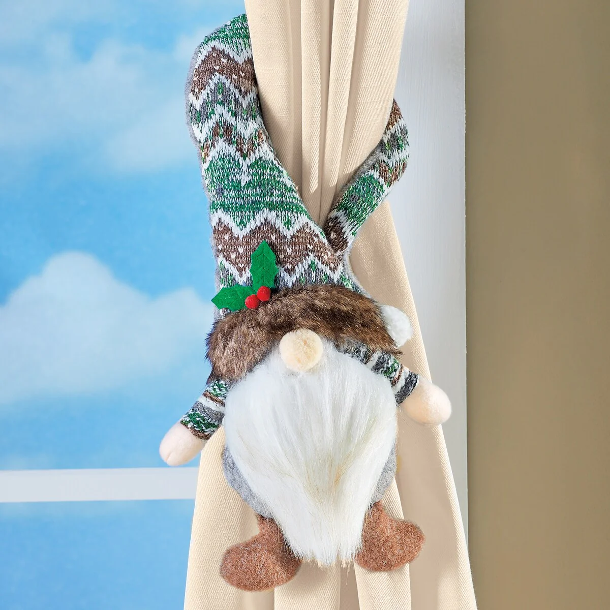 A fun and easy way to add to your holiday decorating, this pair of adorable gnomes wrap around your curtains as festive tiebacks. The set includes 2 gnomes the girl has long white pigtails and the boy has a fluffy white beard. Both wear holly accented tall hats. Spot clean. Polyester; imported. Each is 14 1/2"L x 2 1/2"W x 6"H. Set of 2.