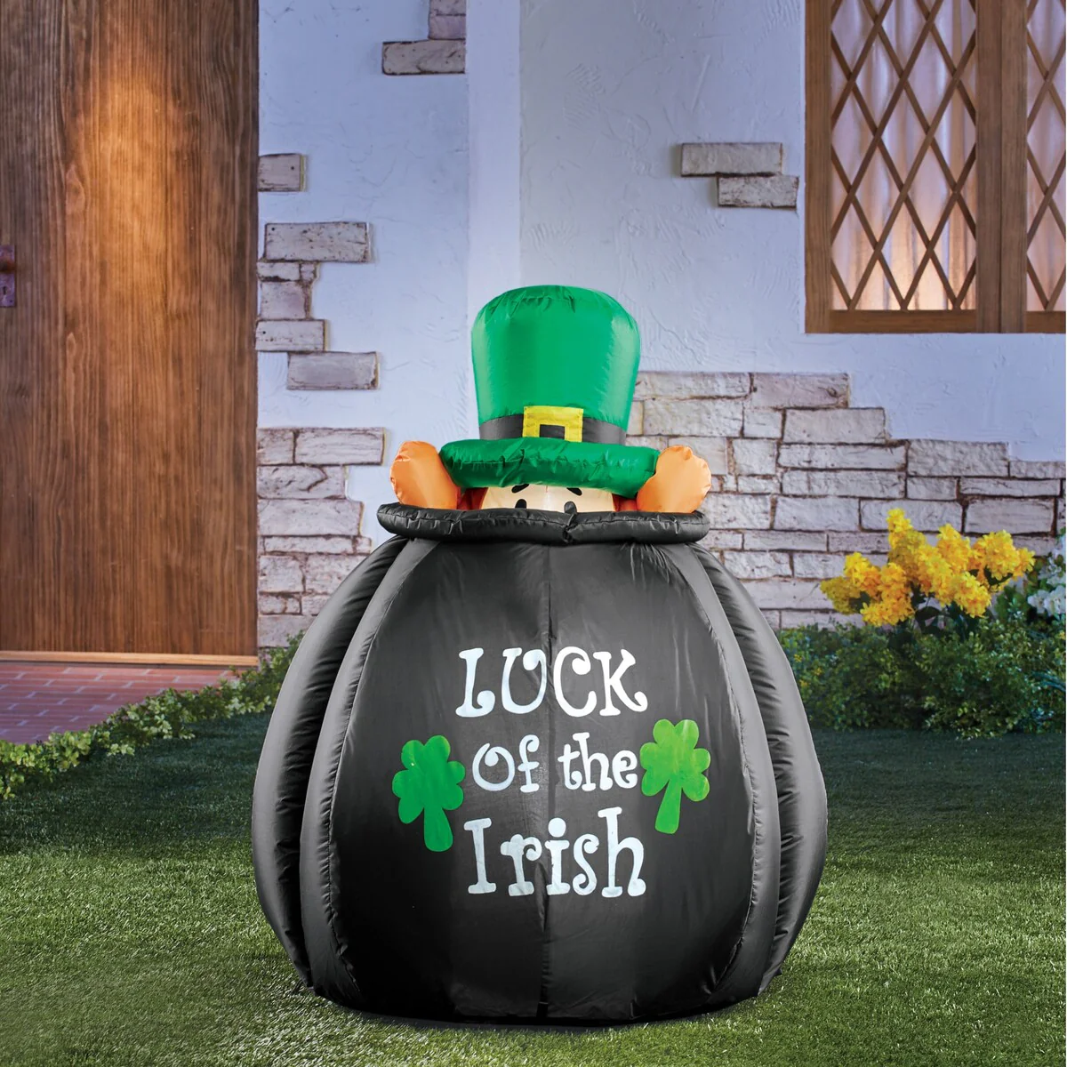 This brightly colored leprechaun will make a great addition to your outdoor St. Patrick's Day decorating! Simply plug it into an AC outlet and it automatically inflates to over 4-feet tall and lights up. The leprechaun inside rises up and down from the pot to welcome visitors to your home. Includes ropes and stakes to secure it in place. Polyester, metal and plastic; imported. 27 1/2"L x 25 1/2"W x 49 1/2H when leprechaun stands up, 39"H with leprechaun is down. Cord is 64"L.