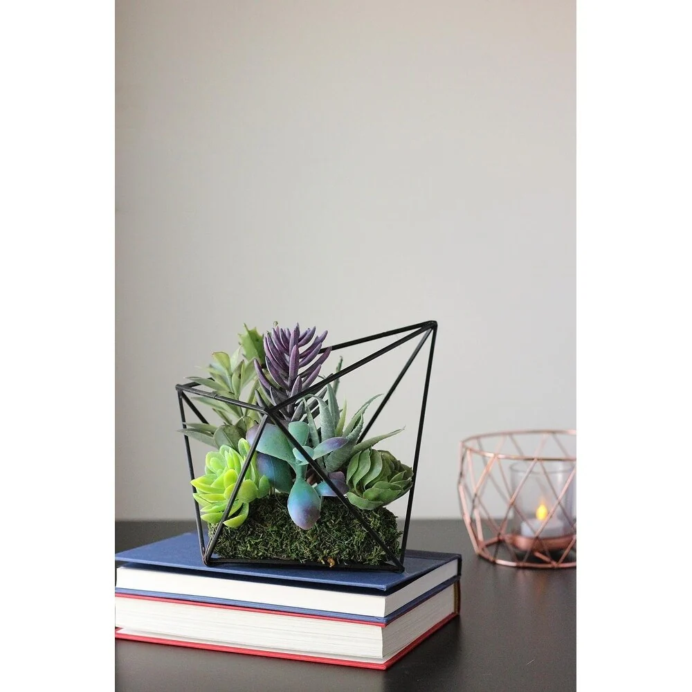 Extremely realistic plants are nestled in a black diamond shaped metal frame
