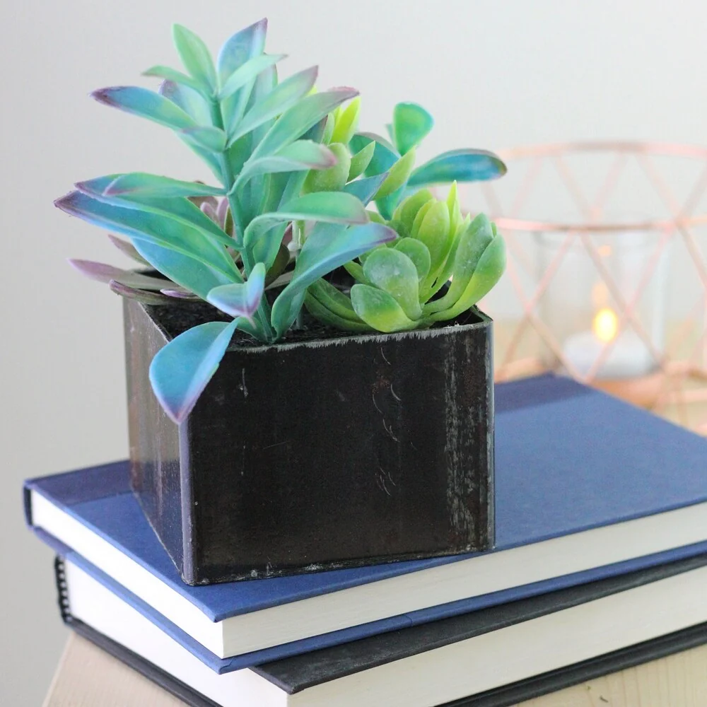 Extremely realistic plants are nestled in a distressed black metal pot